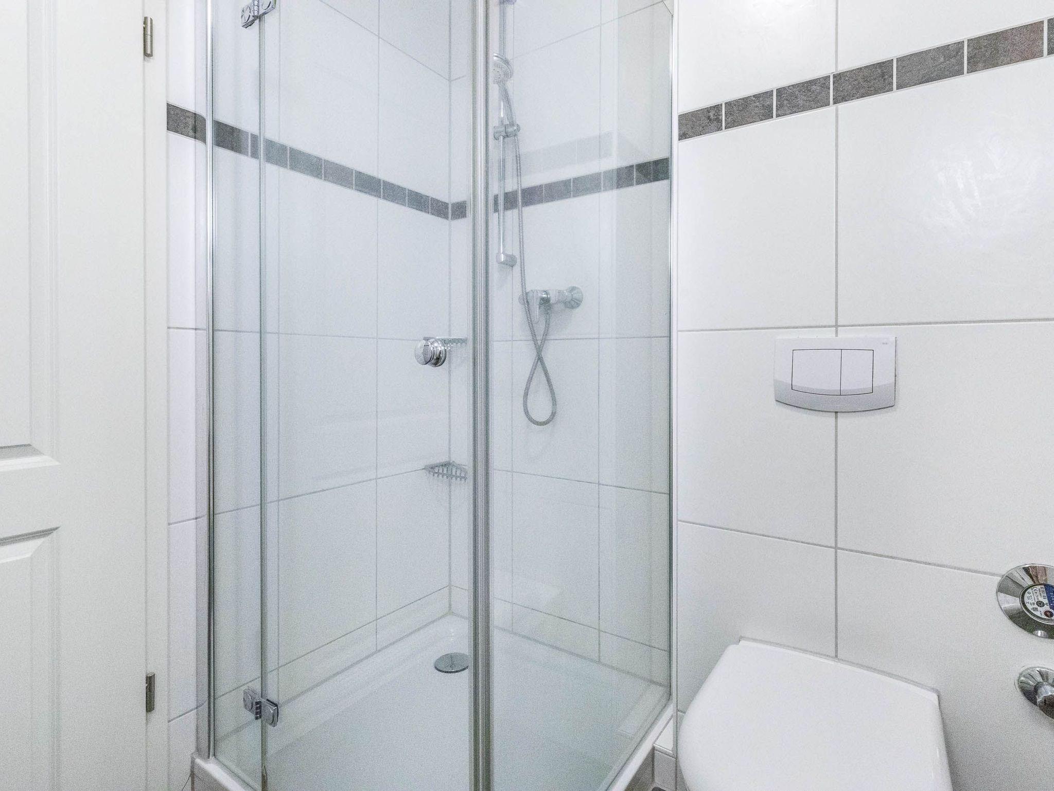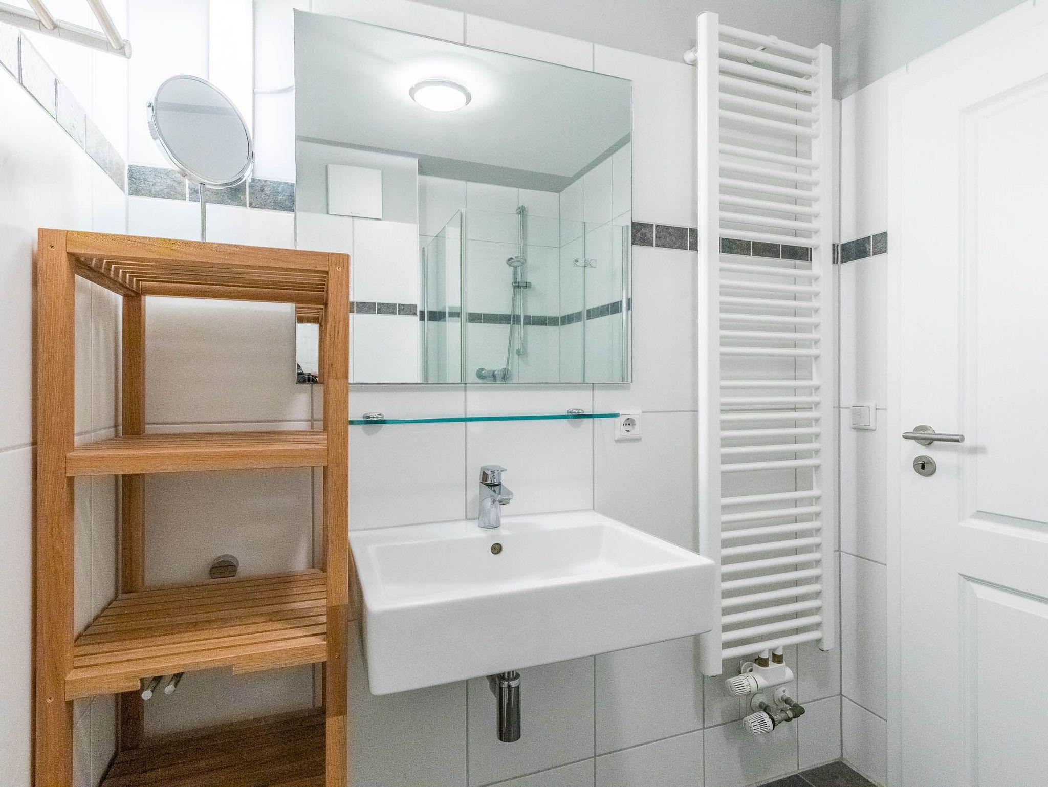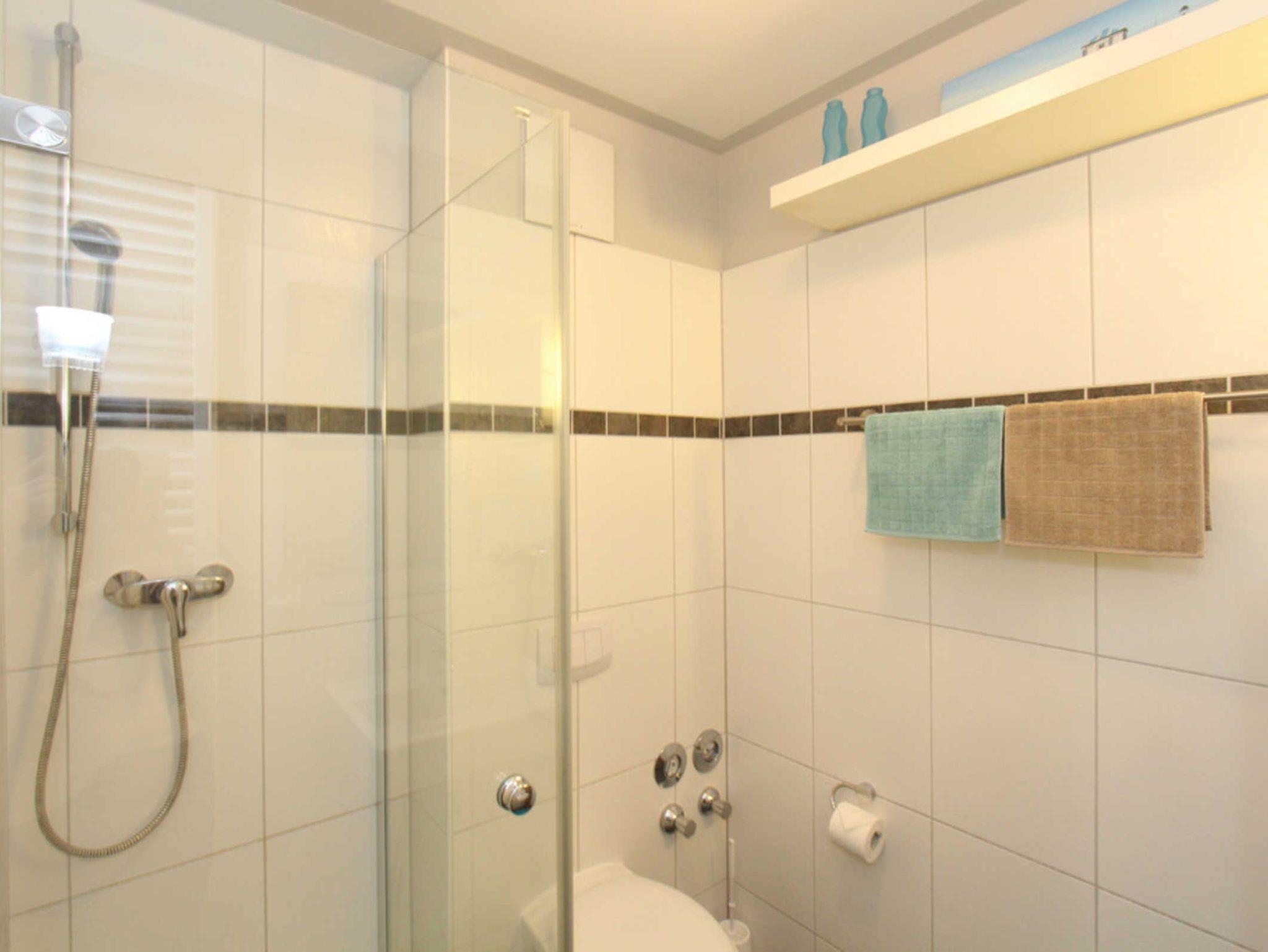 Das Badezimmer ist mit Dusche und WC ausgestattet, eine große Handtuchheizung sorgt für wohlige Wärme.
