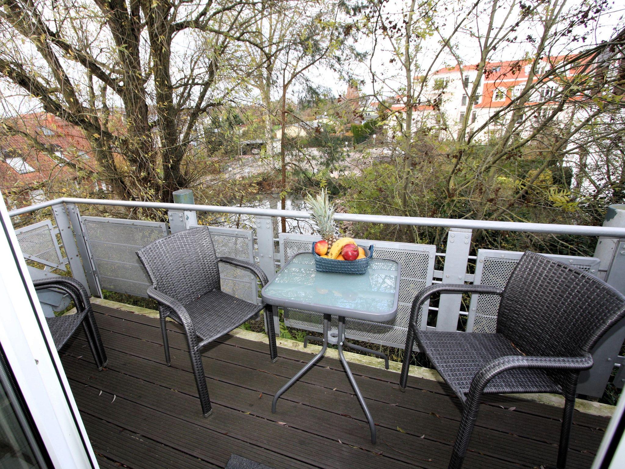 Auf 49 m² erwarten Sie zwei helle, komfortabel ausgestattete Zimmer mit Platz für bis zu 4 Personen (Doppelbett im Schlafzimmer und Schrankbett im Wohnzimmer). Vom 2. Obergeschoss aus genießen Sie die Nachmittagssonne auf dem Balkon ? mit Blick ins Grüne, auf den Teich und seitlich auf die Ostsee.