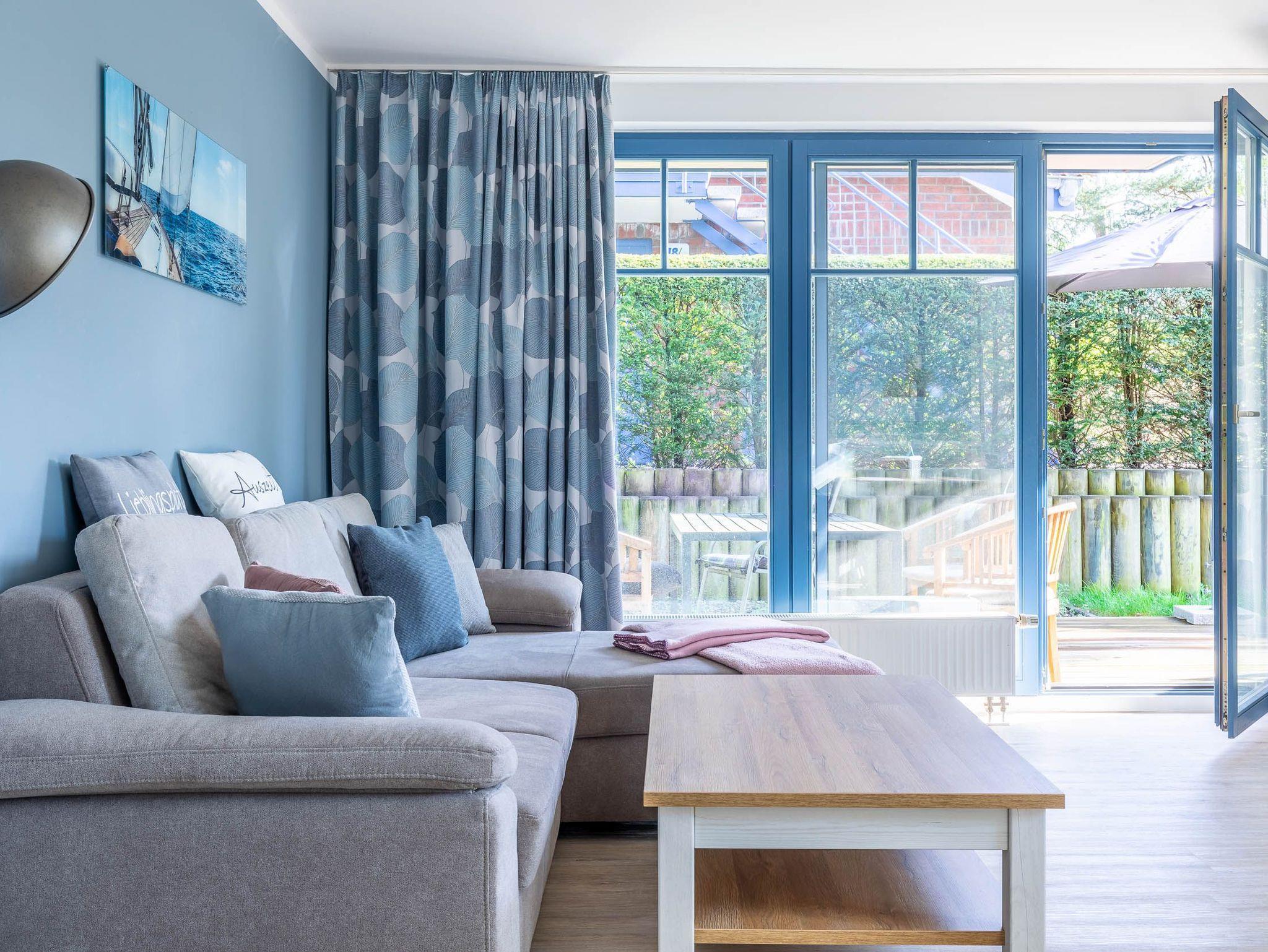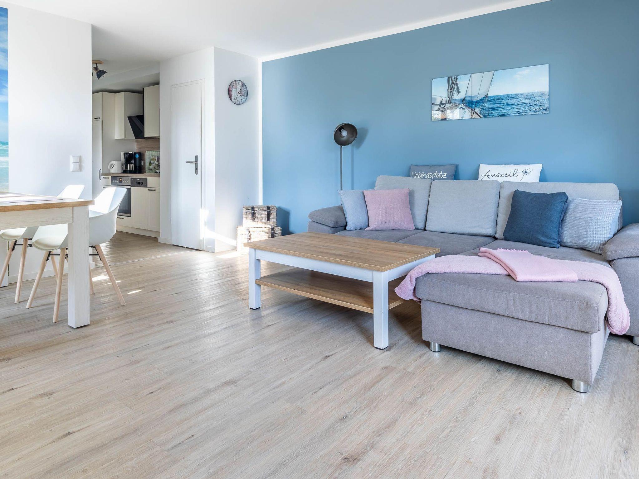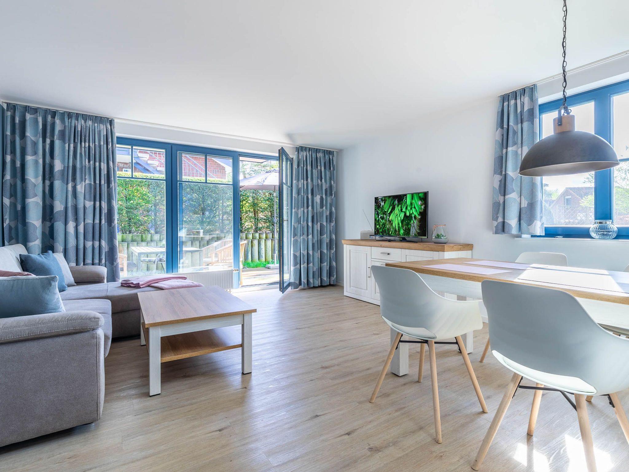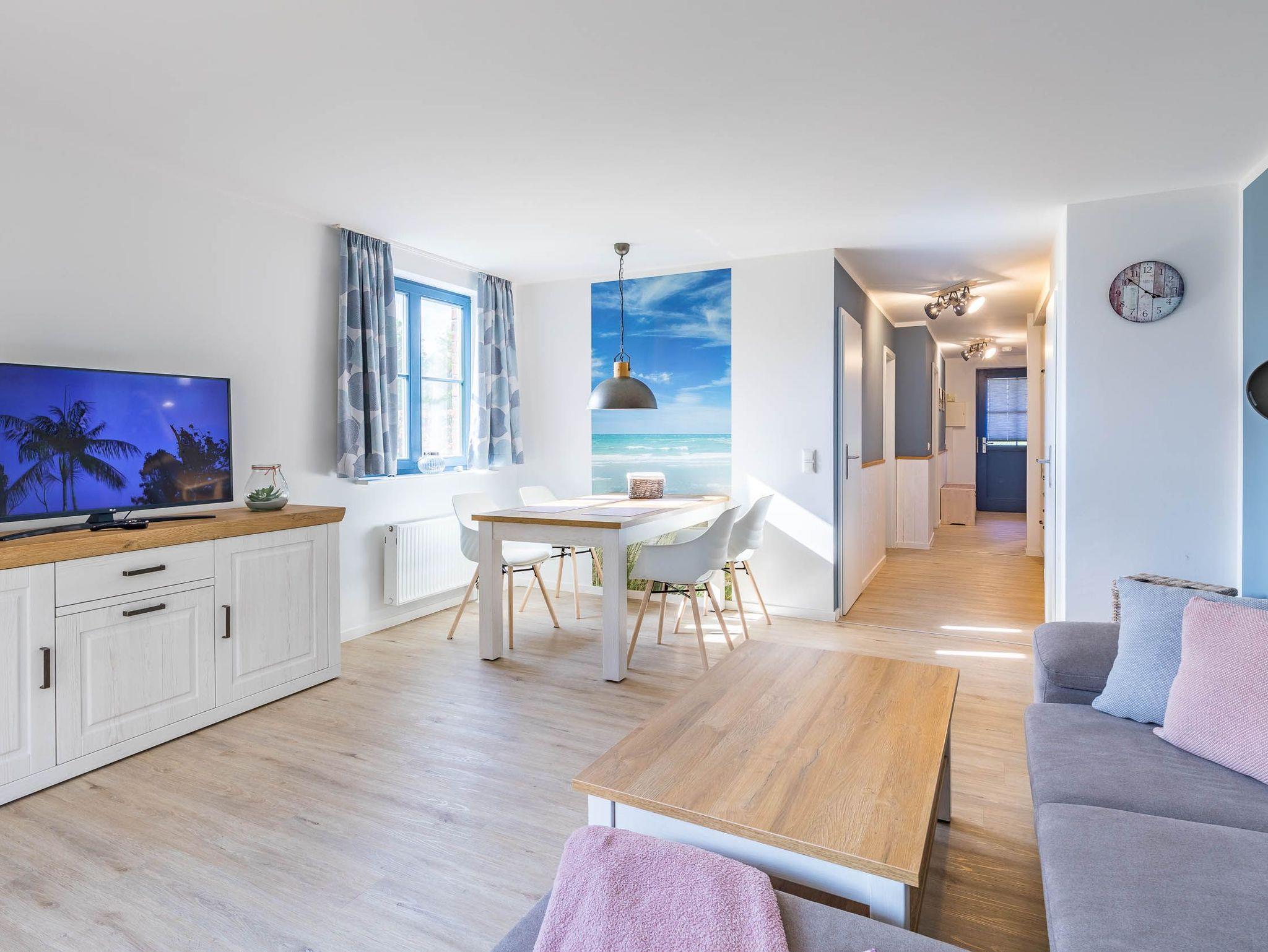 Die Wohnung wurde im Jahr 2020 umfassend renoviert und liebevoll im Landhausstil bzw. Skandinavischen Stil eingerichtet. Zur Ferienwohnung gehört ein kombinierter Wohn- und Essbereich mit einem bequemen Sofa, SAT-TV und Radio sowie einer schönen Essecke, wo Sie gemeinsam Ihre Mahlzeiten einnehmen können.