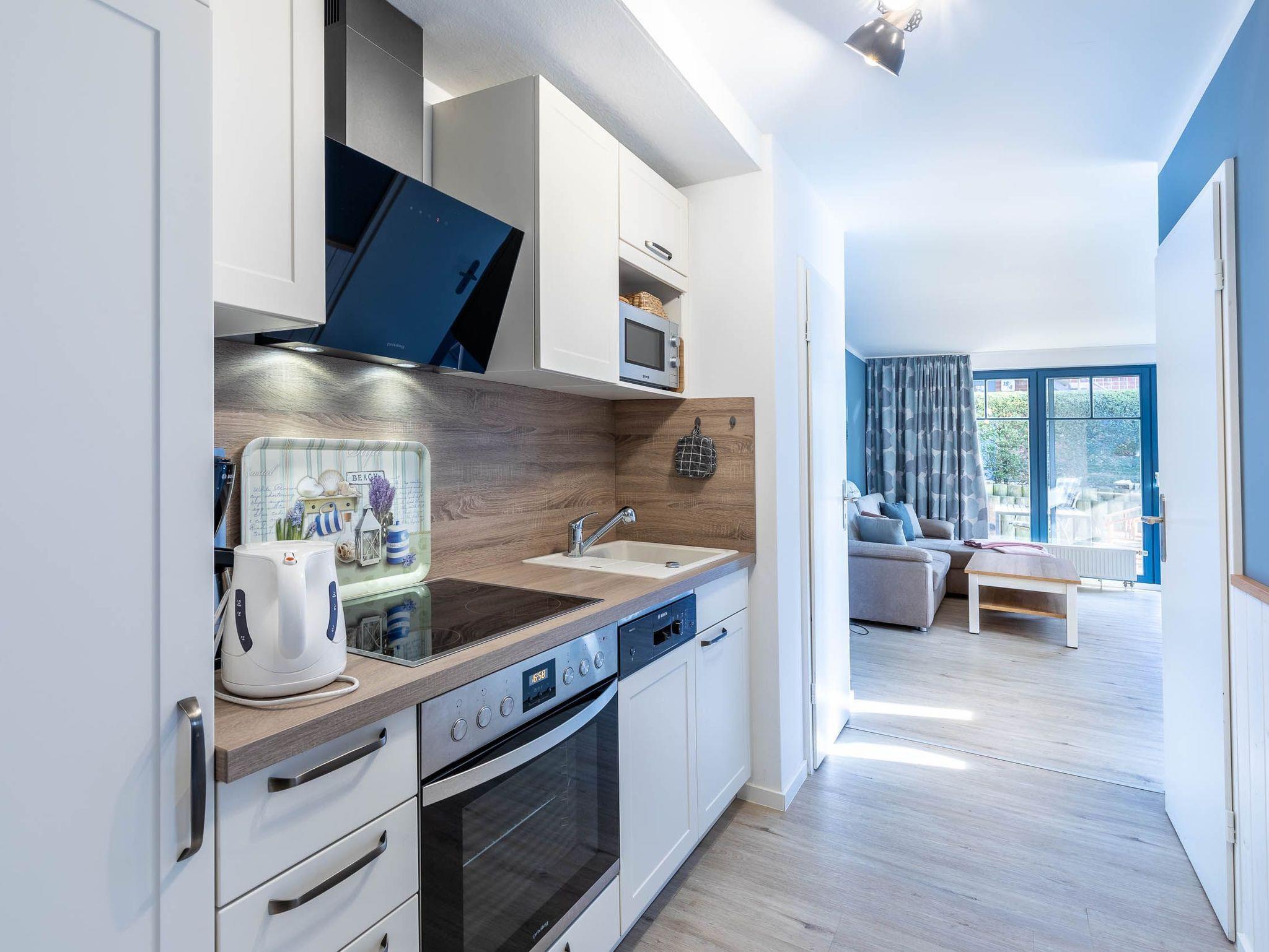 Die moderne offene Küchenzeile ist geschickt integriert und bietet eine umfassende Ausstattung für Ihre sorgenfreie Selbstversorgung.