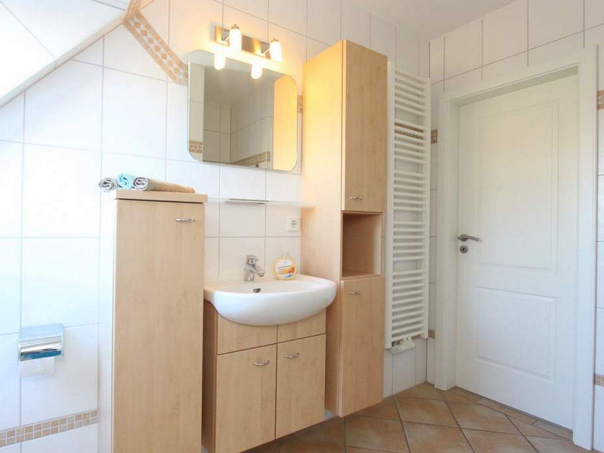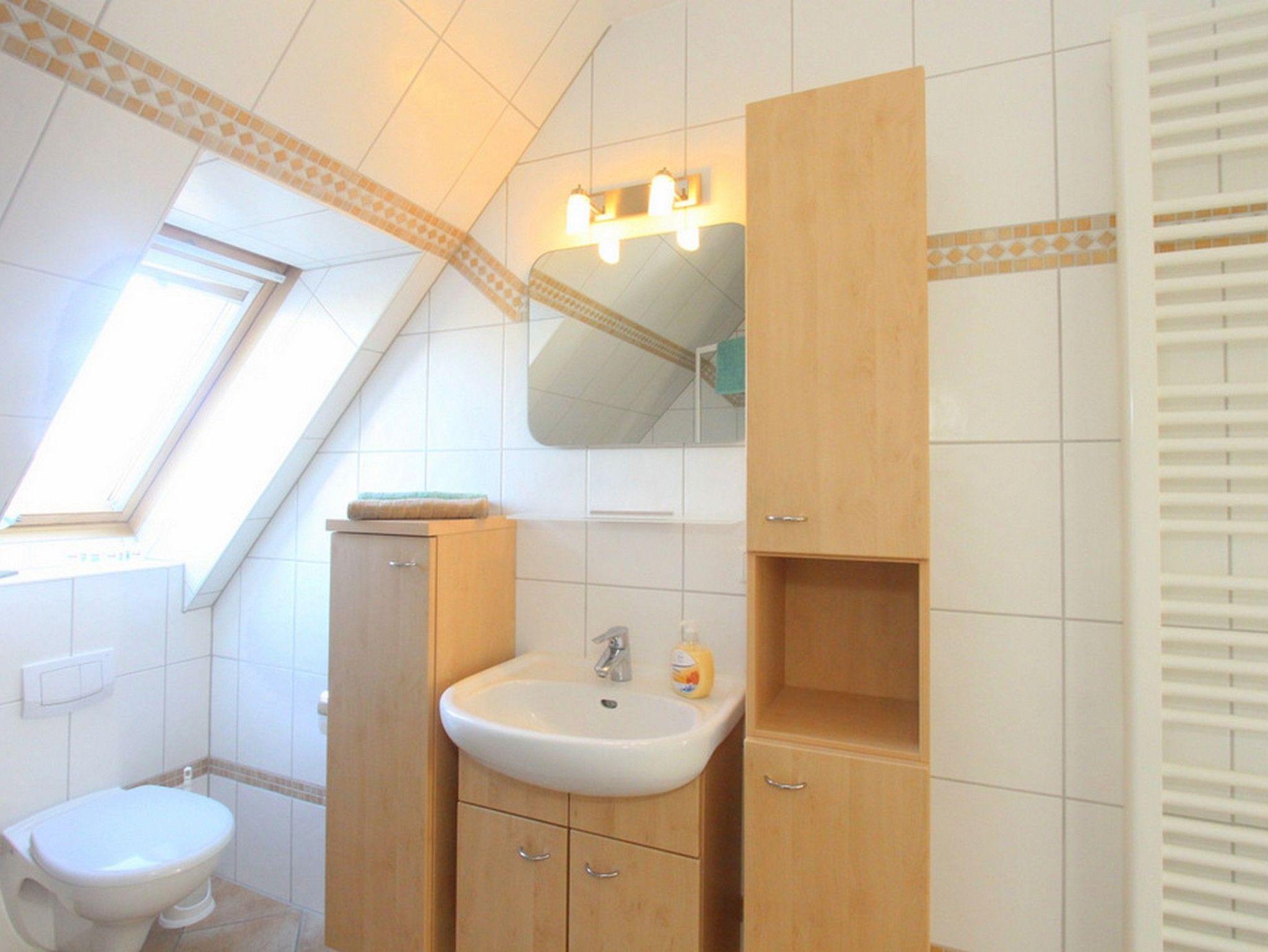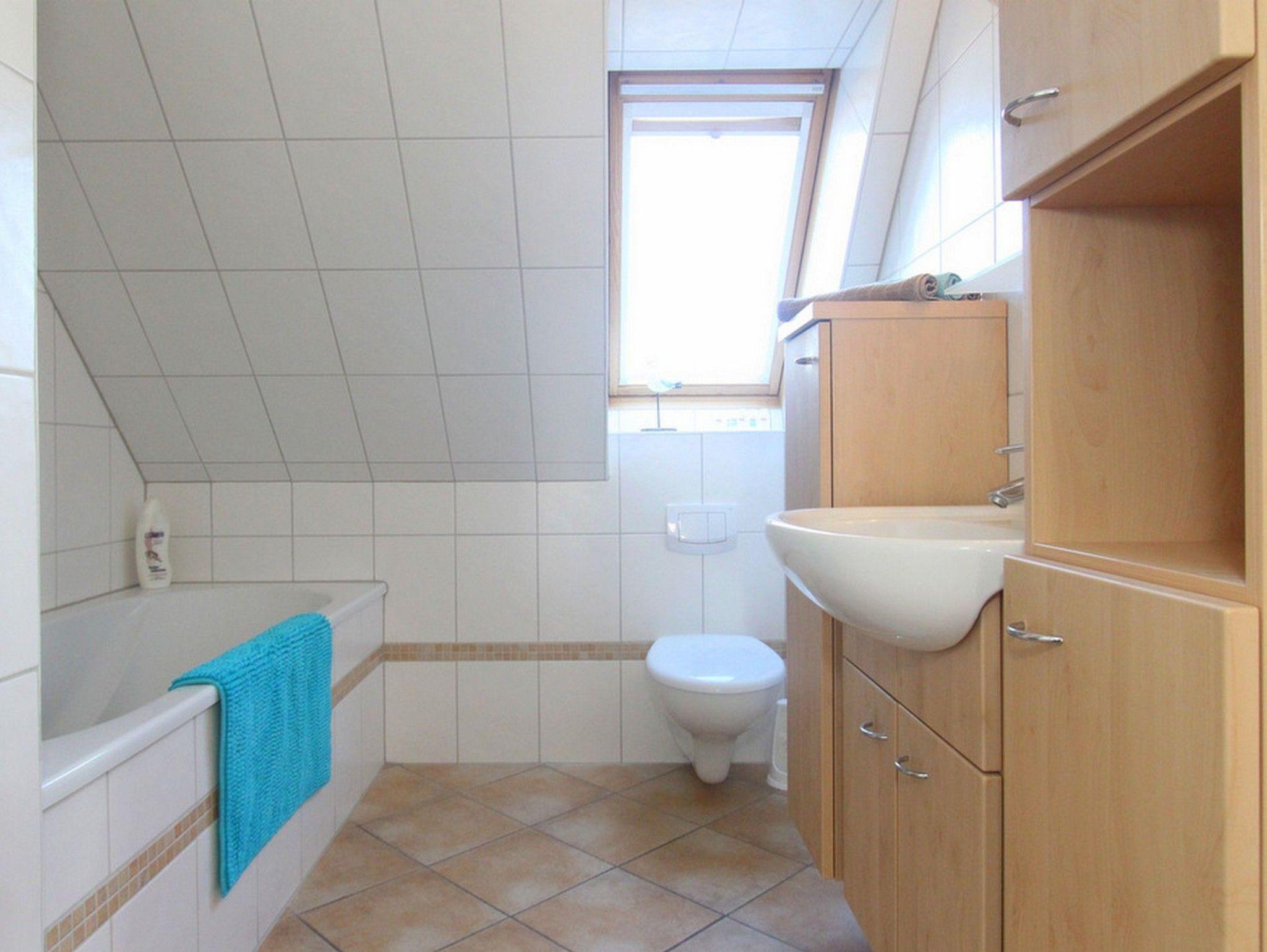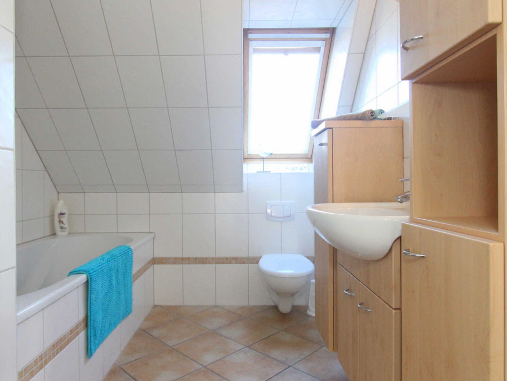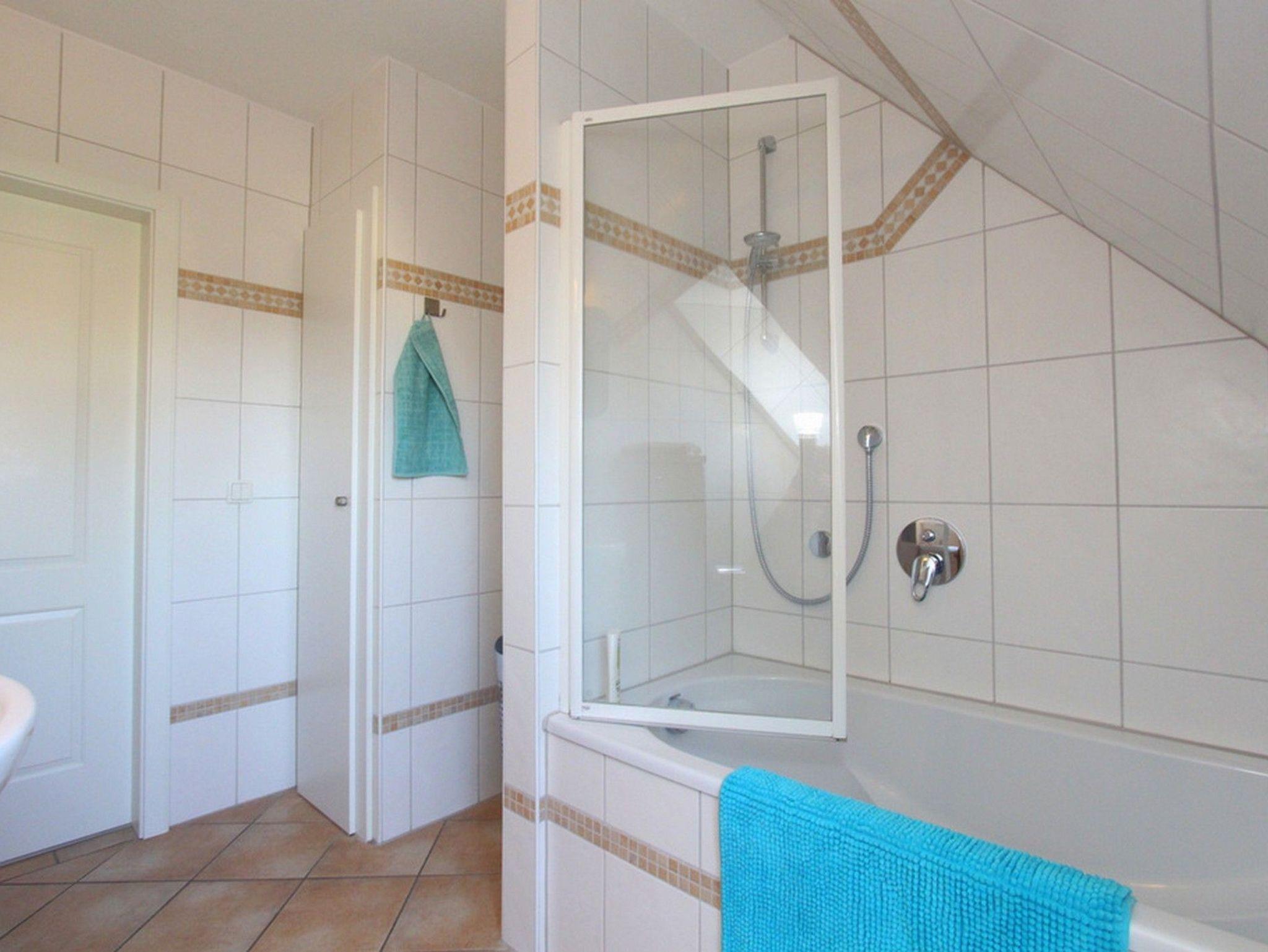 Im Badezimmer auf selber Ebene sind eine Badewanne mit integrierter Dusche sowie das WC vorhanden.