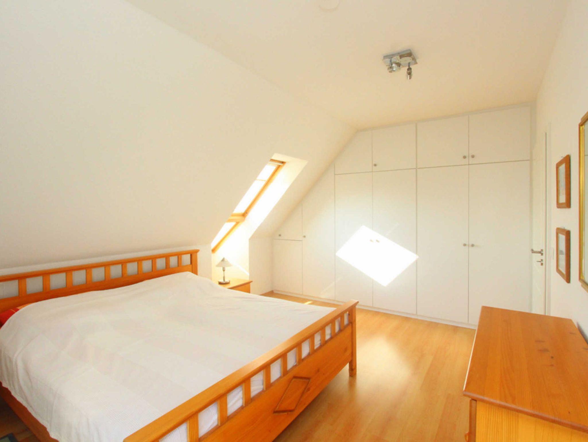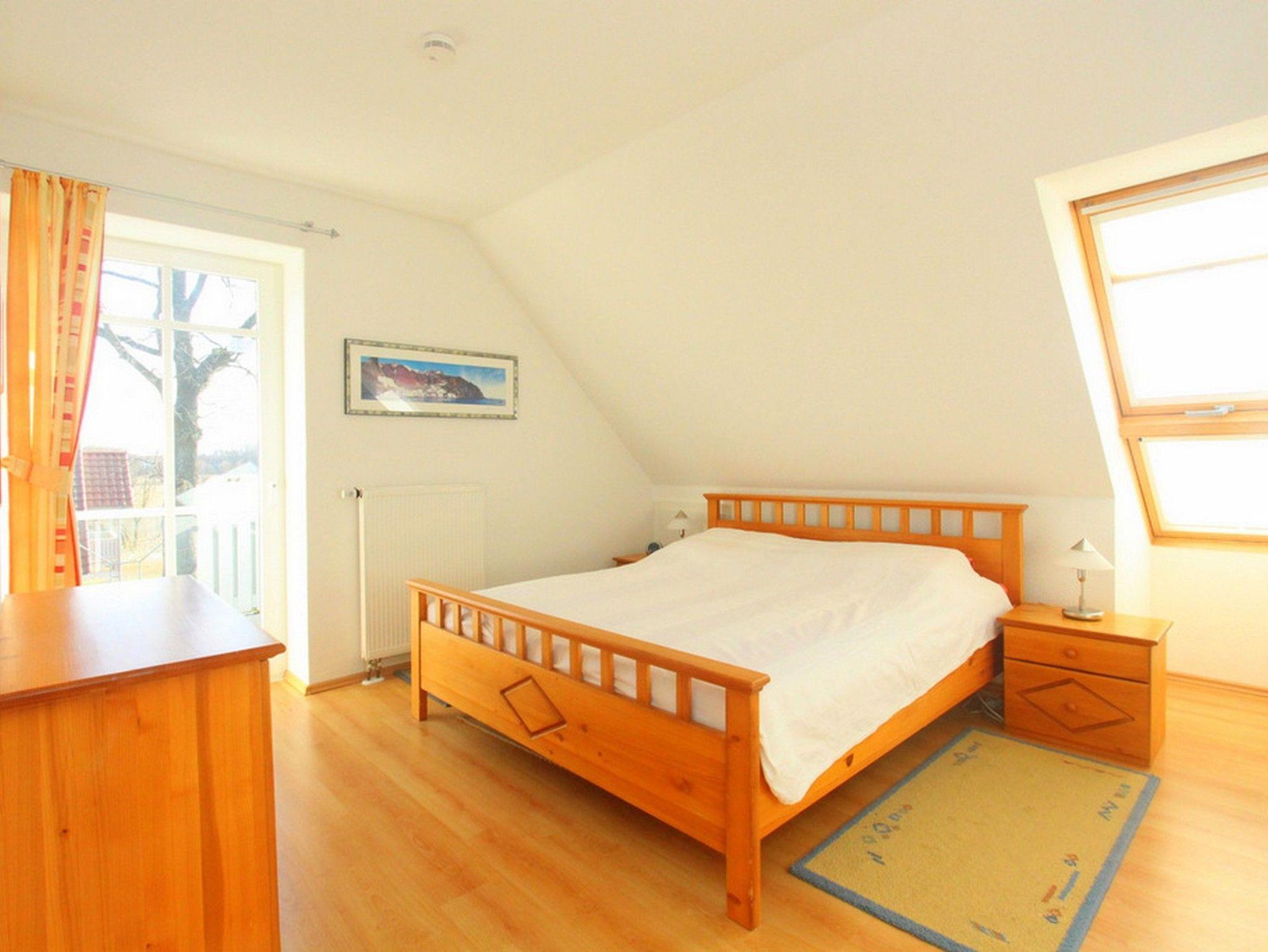 Das separate Schlafzimmer auf dieser Etage mit Doppelbett und einem großen Einbaukleiderschrank ist hell und freundlich möbliert.