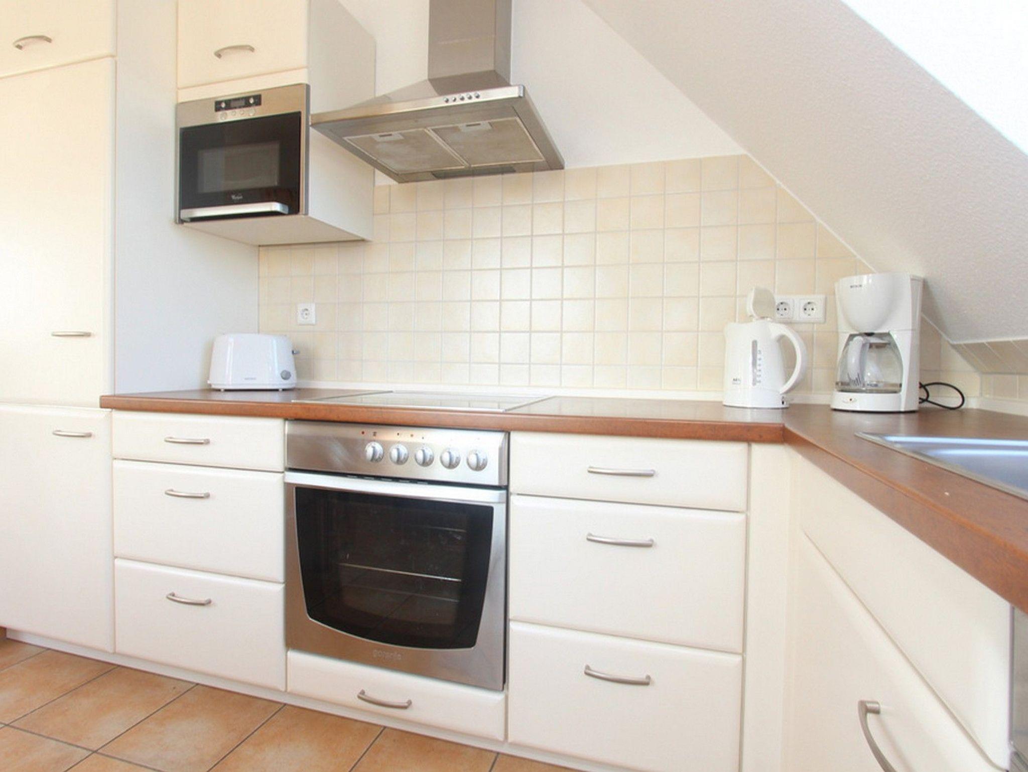 Zum liebevoll eingerichteten Küchen- und Essbereich in der ersten Ebene gehört eine offene Küche mit vielen hochwertigen Haushaltsgeräten wie Geschirrspülmaschine und Mikrowelle sowie ein schöne Essecke für 4 Gäste. Ebenso können Sie es sich mit einem schönen Buch oä. auf den Sesseln bequem machen.