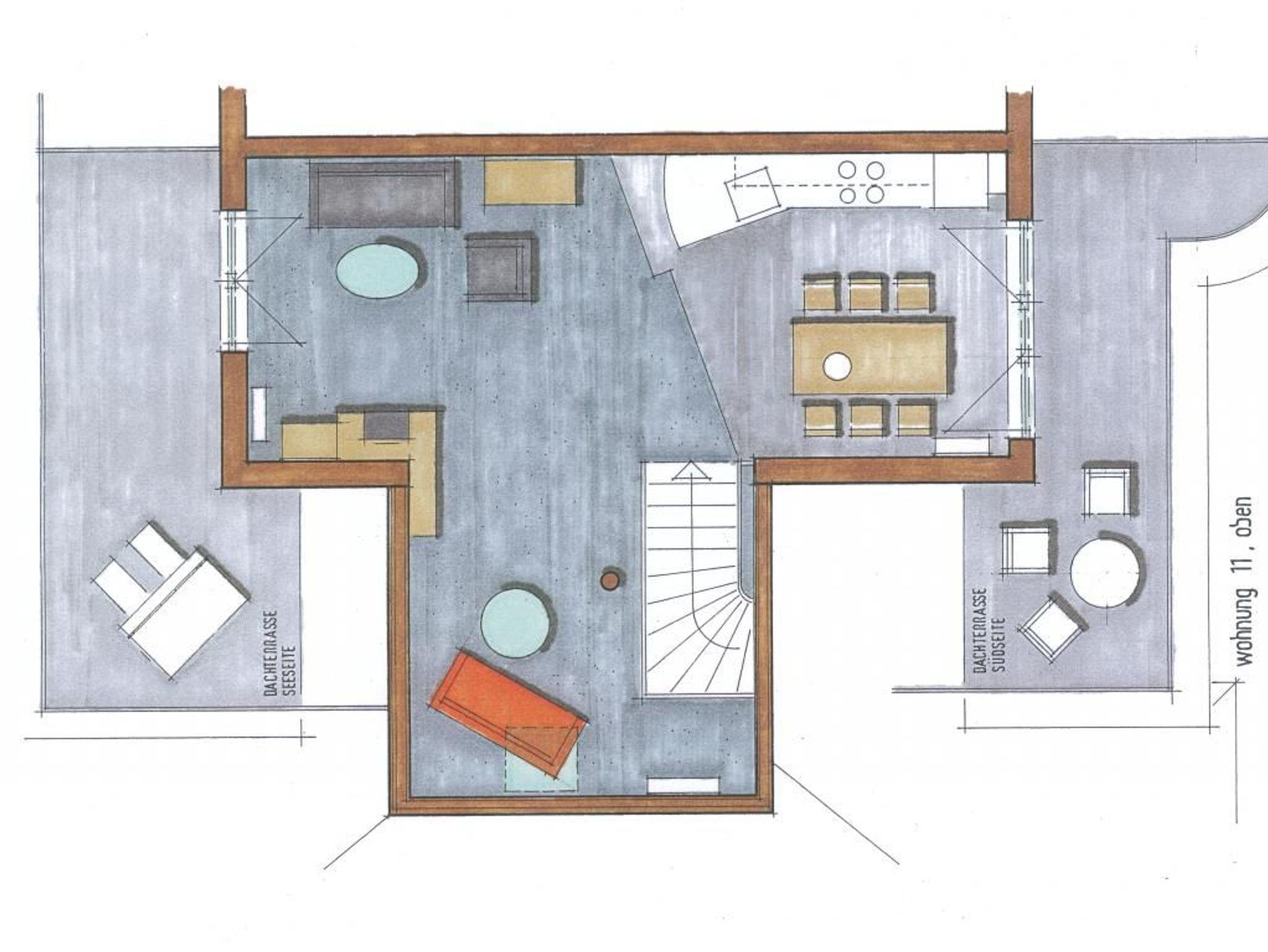 Die exklusive Meerblick-Penthouse-Wohnung in der Villa Höger - Wohnung 11 -erstreckt sich mit 80qm über zwei Ebenen und bietet komfortablen Wohnraum für bis zu 4 Gäste. Ein besonderes Highlight zwei weitläufigen Dachterrassen: