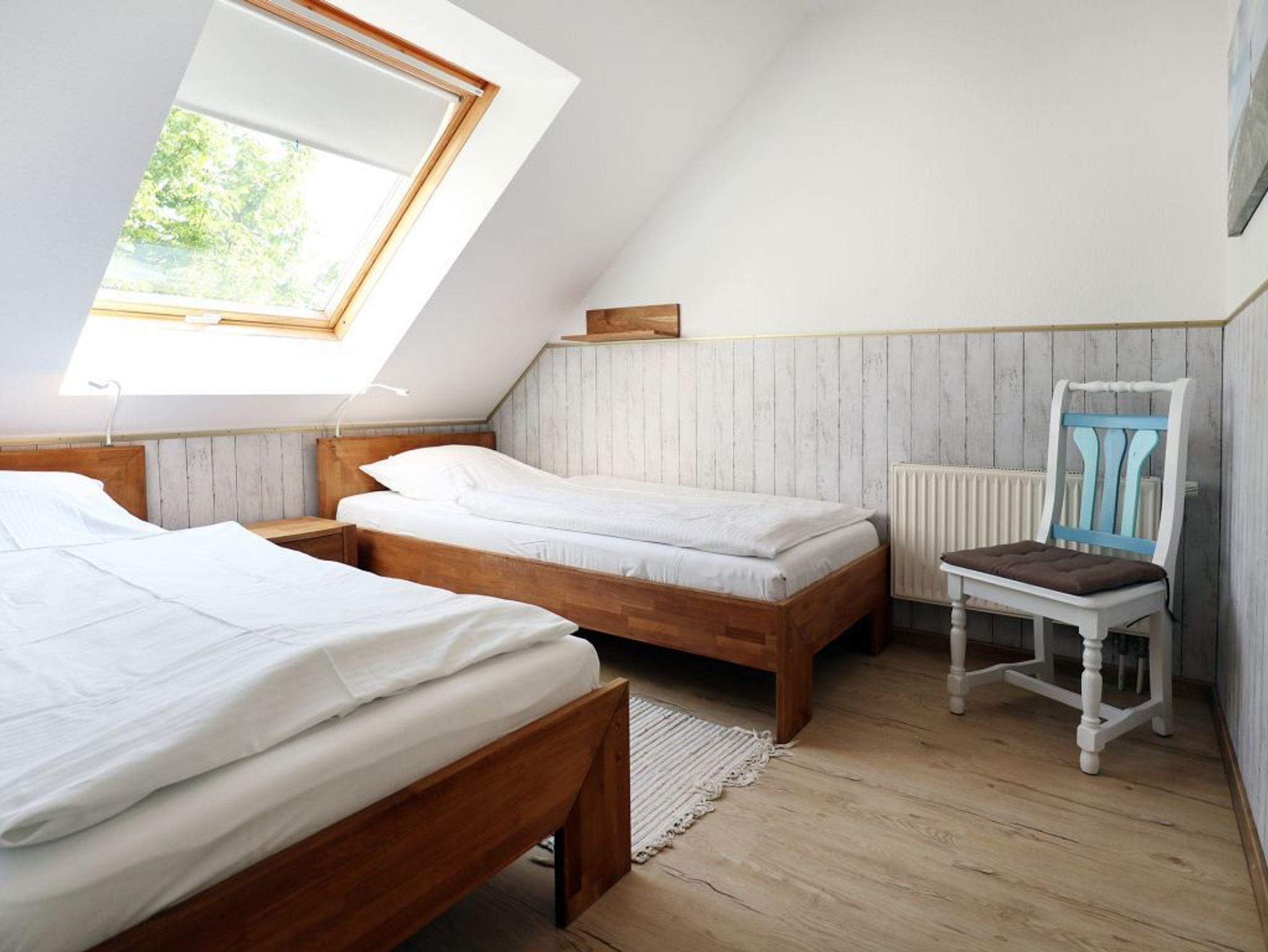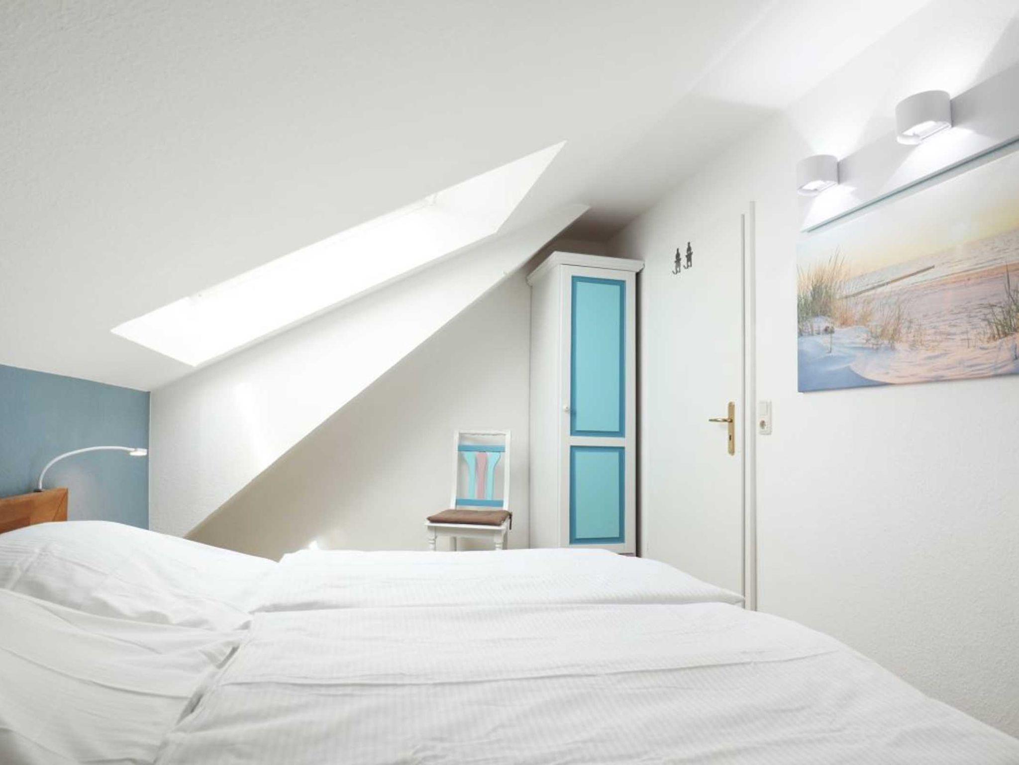 Das modernisierte Duschbad ist mit zwei Waschtischen und WC ausgestattet. Zusätzlich ist ein Gäste-WC in der Wohnung vorhanden. Über eine Treppe im Wohnbereich gelangen Sie in die obere Ebene mit zwei weiteren Schlafzimmern, welche jeweils mit einem Doppelbett, Kleiderschrank möbliert sind. Gegen Gebühr können Sie im Untergeschoß des Hauses Waschmaschine und Wäschetrockner nutzen. Ein Kinderhochstuhl befindet sich in der Wohnung. Ihren PKW parken Sie kostenfrei auf dem wohnungseigenen Außenstellplatz.
