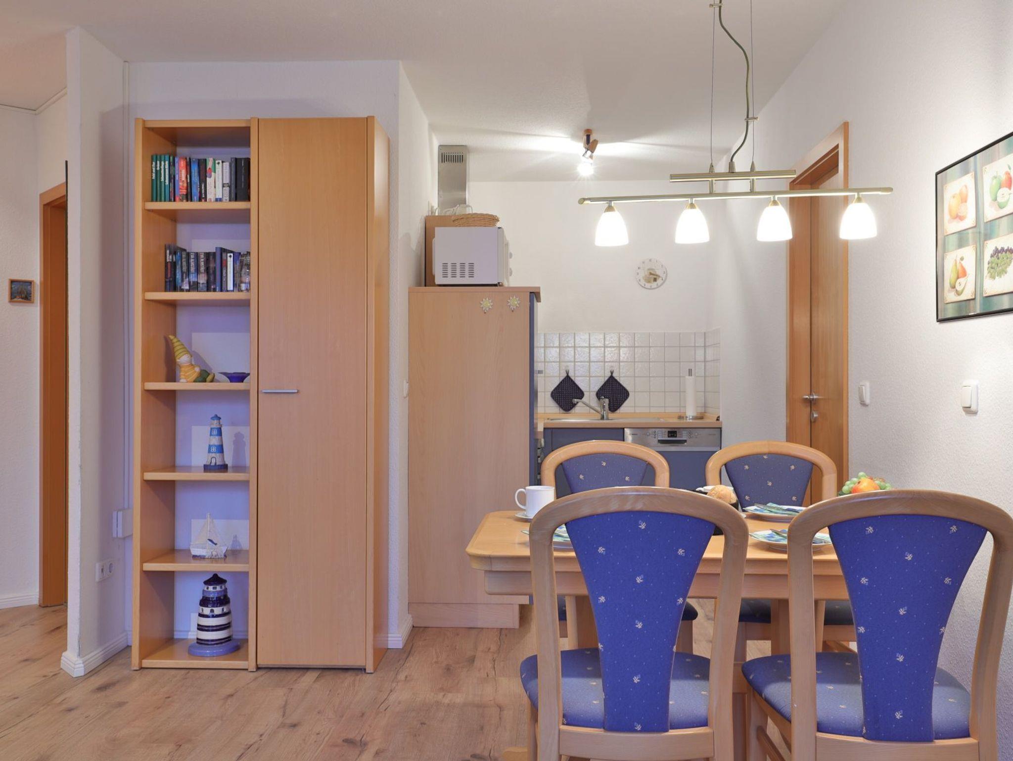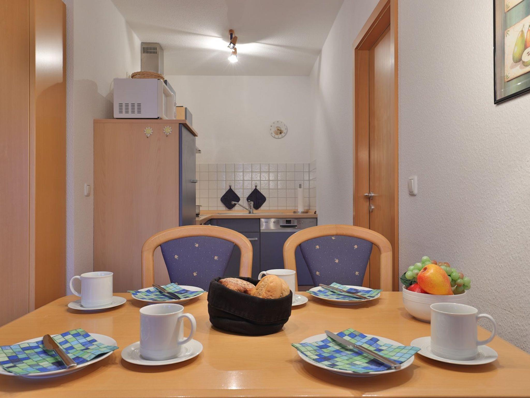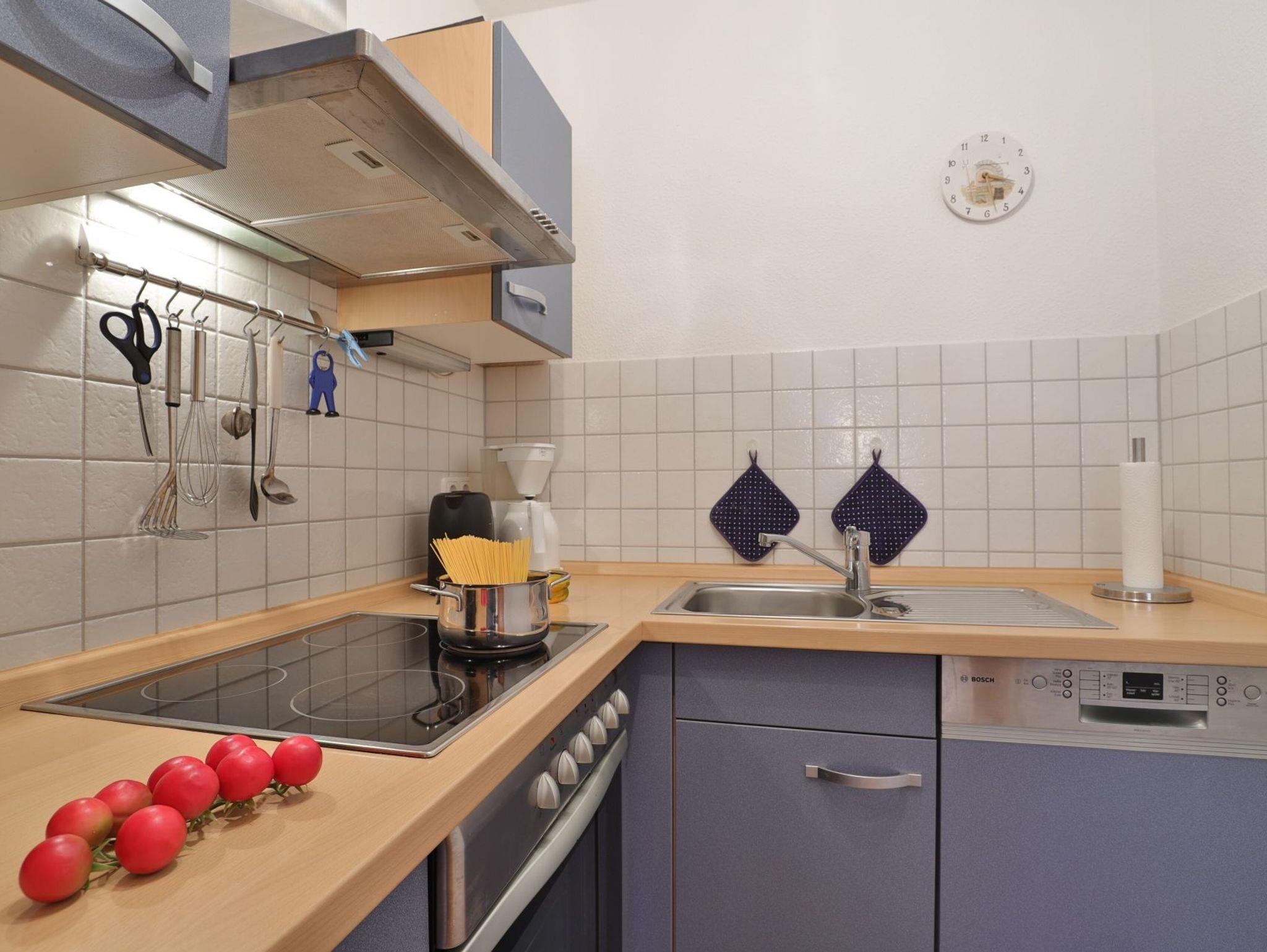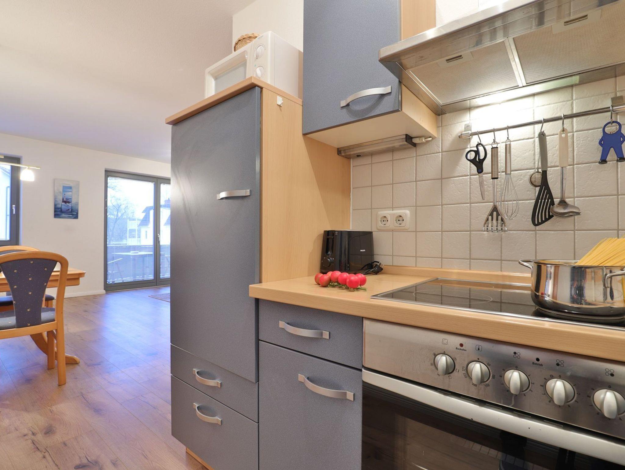 Die in den Wohnbereich integrierte Küchenzeile ermöglicht die Eigenversorgung: Herd, Backofen, Mikrowelle, Dunstabzug, Kühlschrank mit integr. Frostfach, Toaster, Kaffeemaschine, Wasserkocher, Geschirrspüler usw. sind vorhanden. Während der wärmeren Jahreszeit genießen Sie den saisonal möblierten Balkon in Ausrichtung Süd.