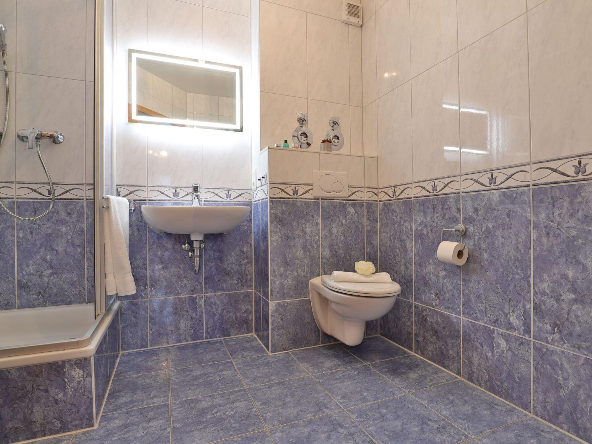 Zugehörig ist ein komfortables Duschbad mit Waschtisch, WC.