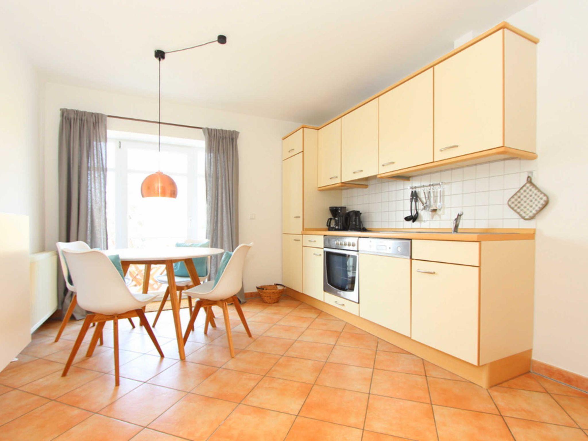 Auf der 1. Ebene (2.OG) befindet sich eine moderne Küchenzeile. Diese bietet eine sehr gute Ausstattung für eine Rund-Um-Selbstverpflegung. An der separaten Essecke lässt es sich gemütlich gemeinsam speisen.