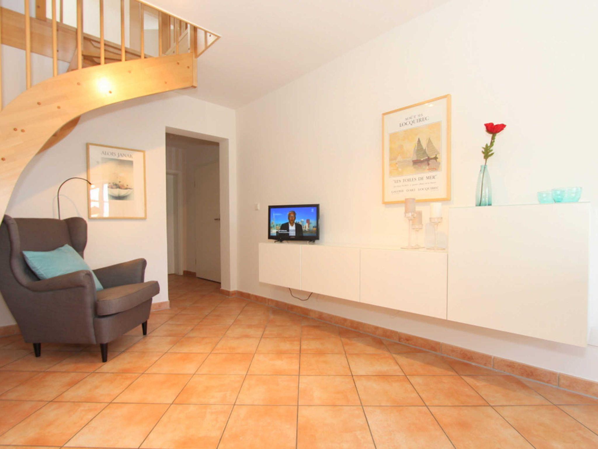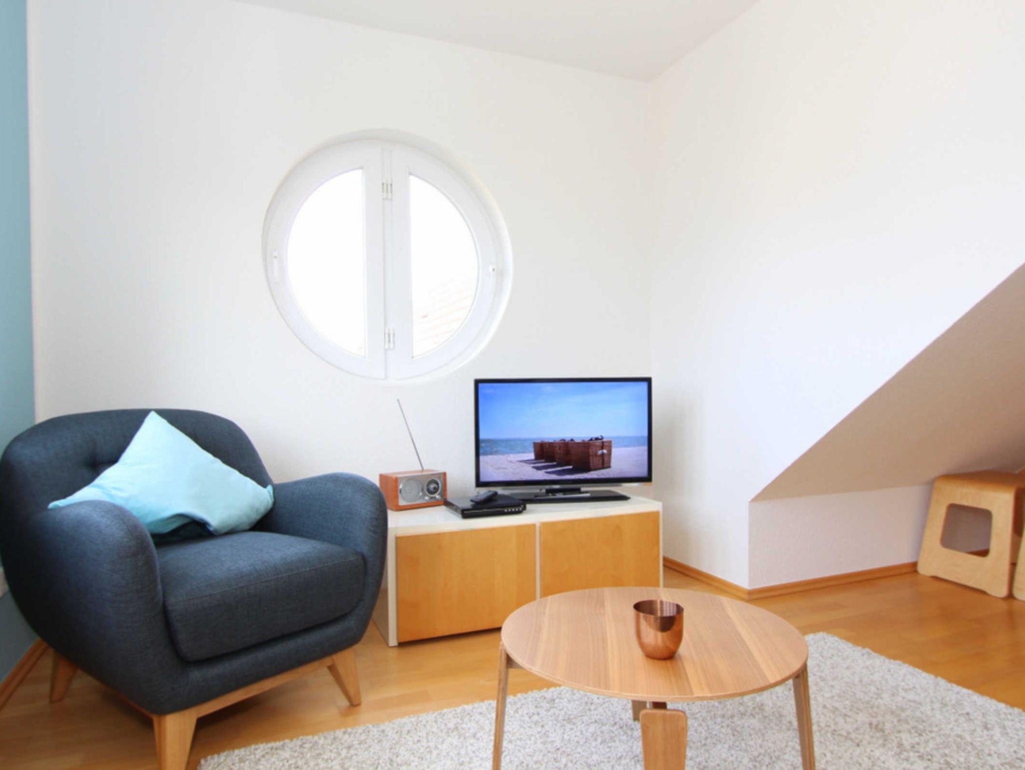 Unter der Holztreppe zum DG steht noch ein gemütlicher Sessel und ein kleiner Fernseher.