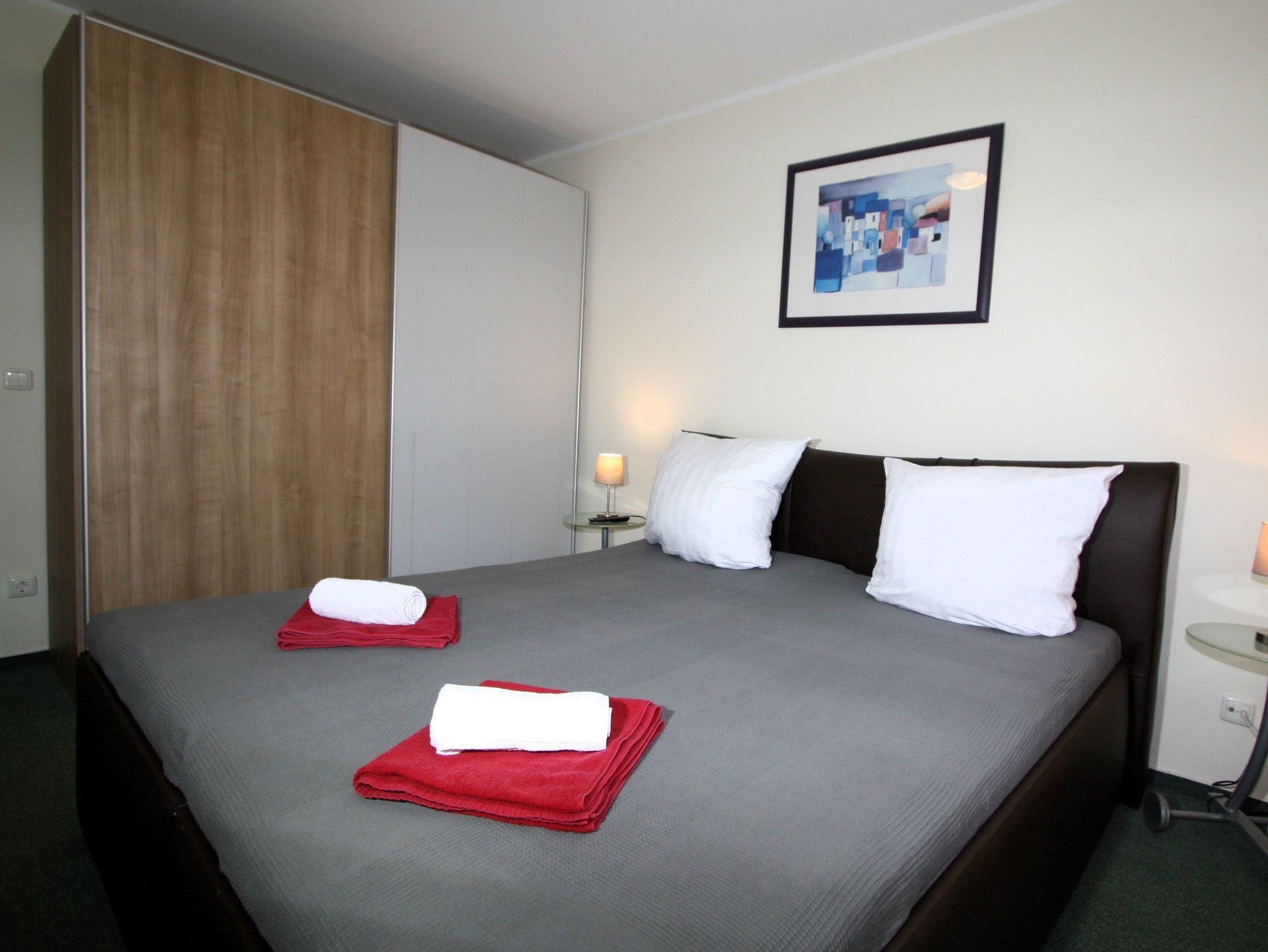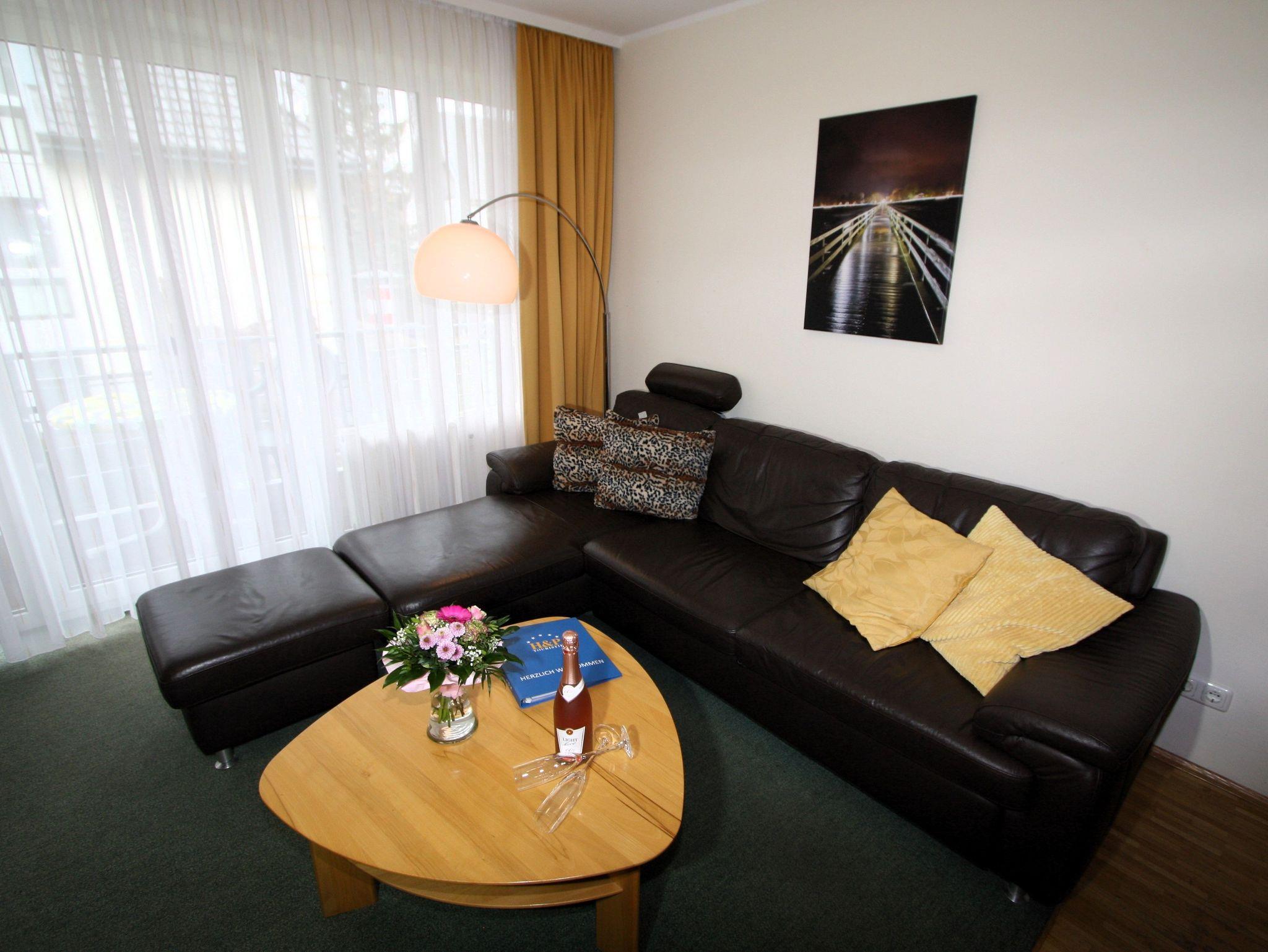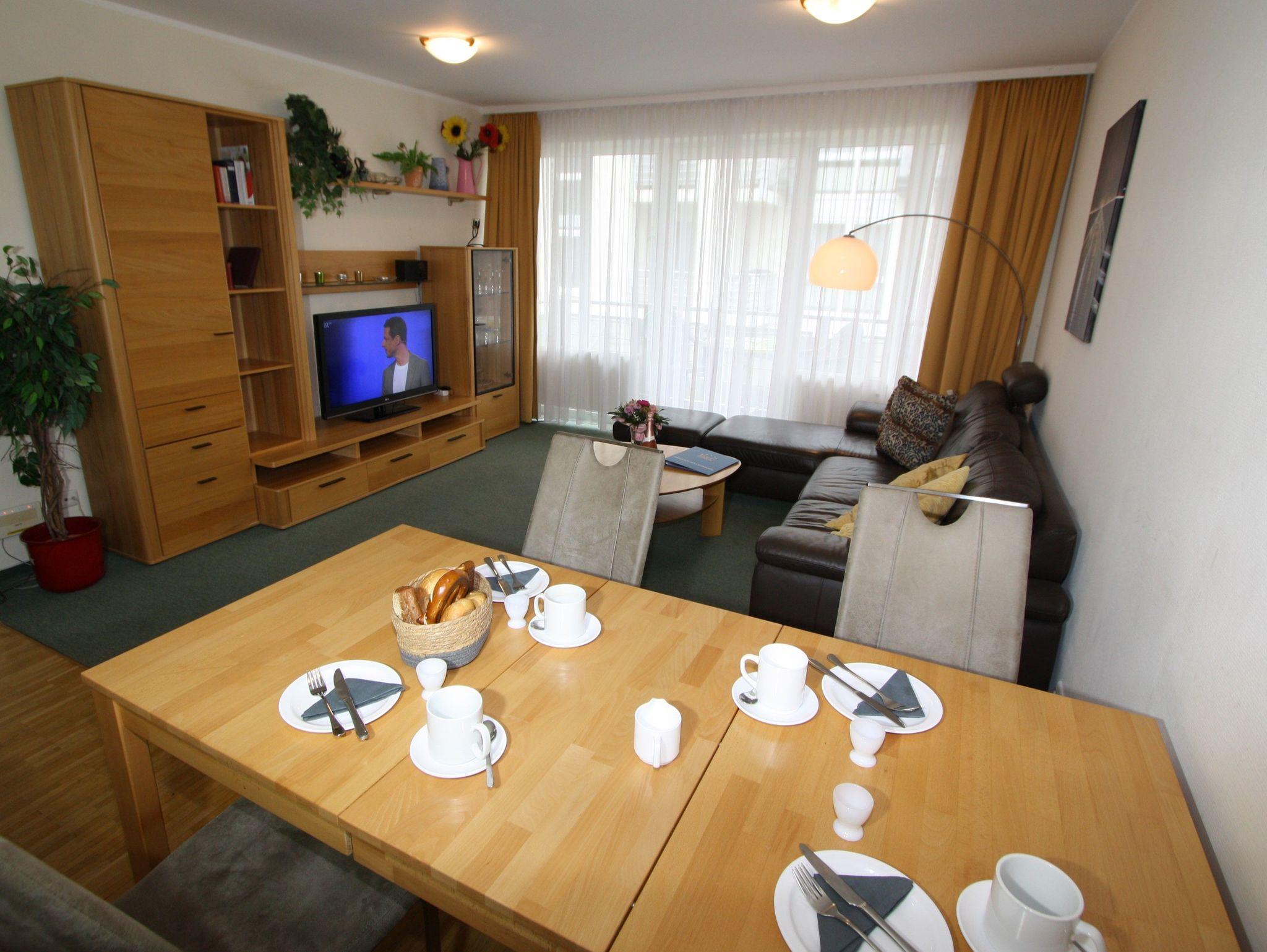Ihre gut ausgestattete Zwei-Zimmer-Ferienwohnung für bis zu vier Personen verfügt über einen Balkon oder Terrasse, kostenfreies WLAN und sky-Empfang. Sie erreichen die Wohnung bequem mit dem Aufzug, für Ihren PKW steht ein Platz in der Tiefgarage zur Verfügung. Dort befindet sich zudem ein Waschraum mit Münzwaschmaschinen und Münzwäschetrockner und ein Platz für Ihre Fahrräder.