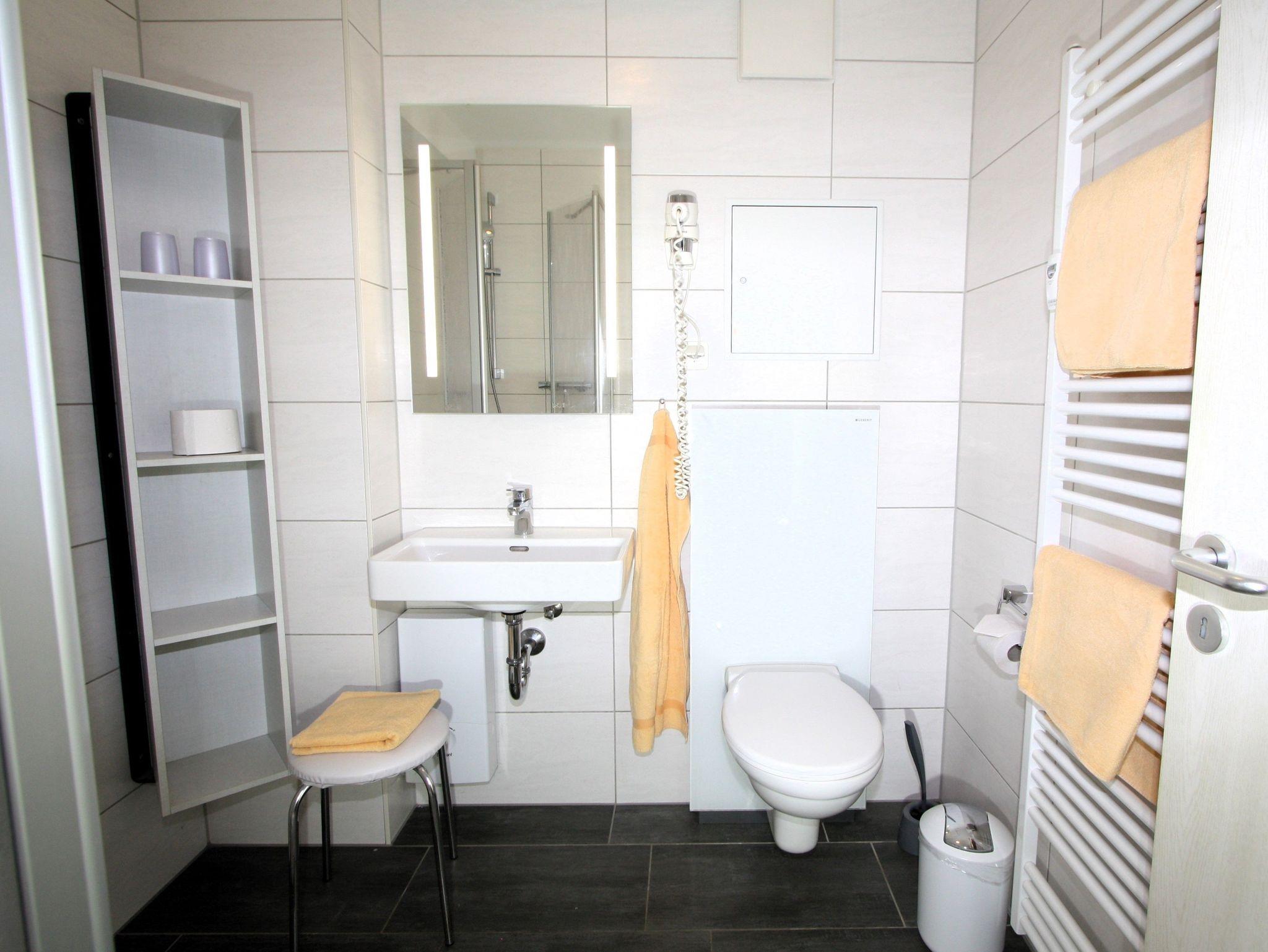 Das moderne Badezimmer mit Dusche/WC wird durch praktische Extras wie Föhn und beleuchteten Schminkspiegel ergänzt. Der geflieste Boden sorgt für ein gepflegtes und frisches Ambiente.