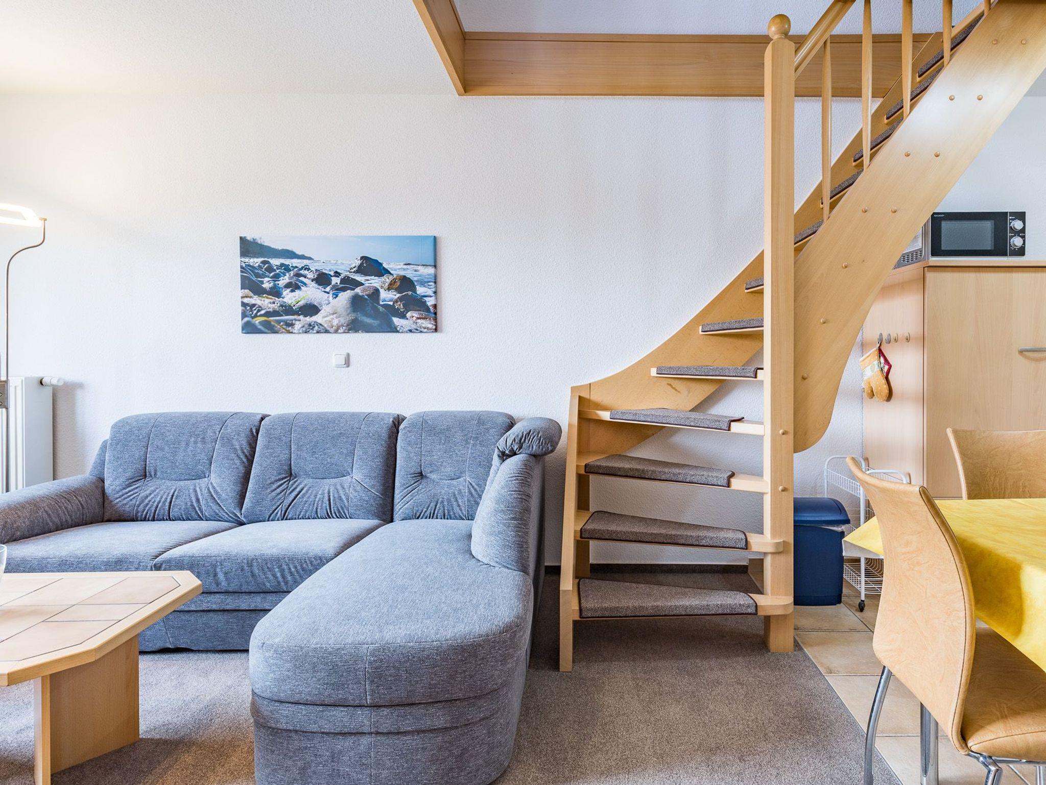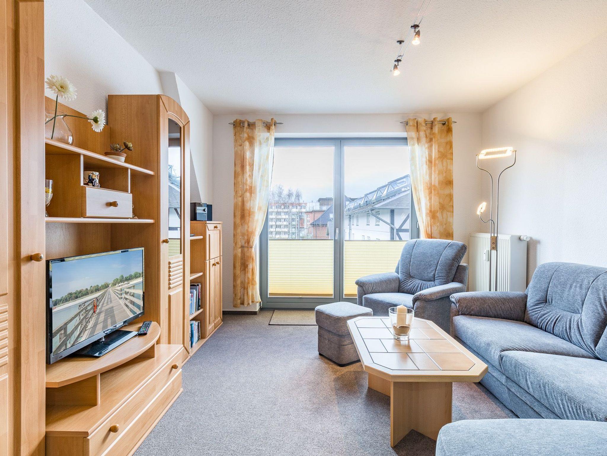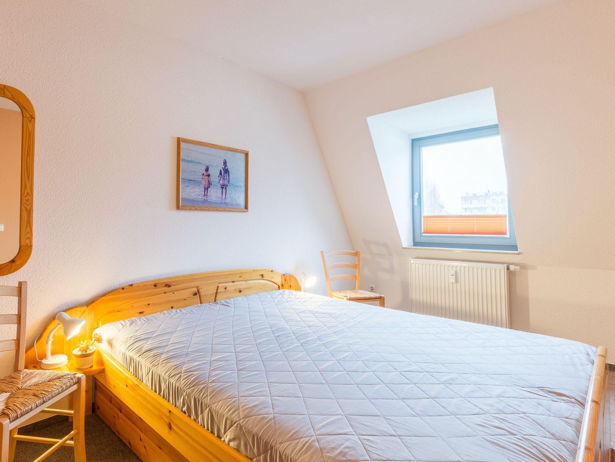 Über den Wohn- und Essbereich haben Sie direkten Zugang zum Balkon. Die Ferienwohnung bietet mit zwei separaten Schlafzimmern, 1 Doppelbett (180x200) mit geteilter Matratze, 1 Etagenbett ( 90 x 200 cm ) und 1 Schlafcouch ( 150 x 200 cm ), Platz für bis zu 4 Personen.
