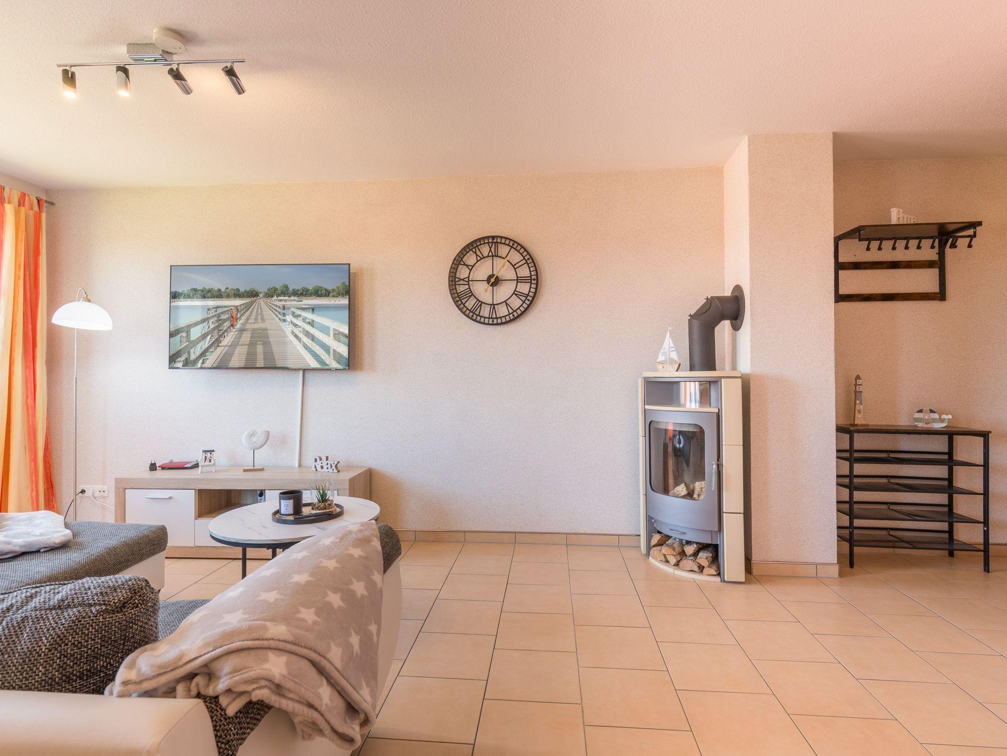 Besonders in den kälteren Monaten sorgt der Kamin/Ofen im Wohnzimmer für eine angenehme Wärme und eine gemütliche Atmosphäre. Für Unterhaltung ist ebenfalls gesorgt, denn in der Ferienwohnung steht ein moderner TV-Flachbild zur Verfügung.