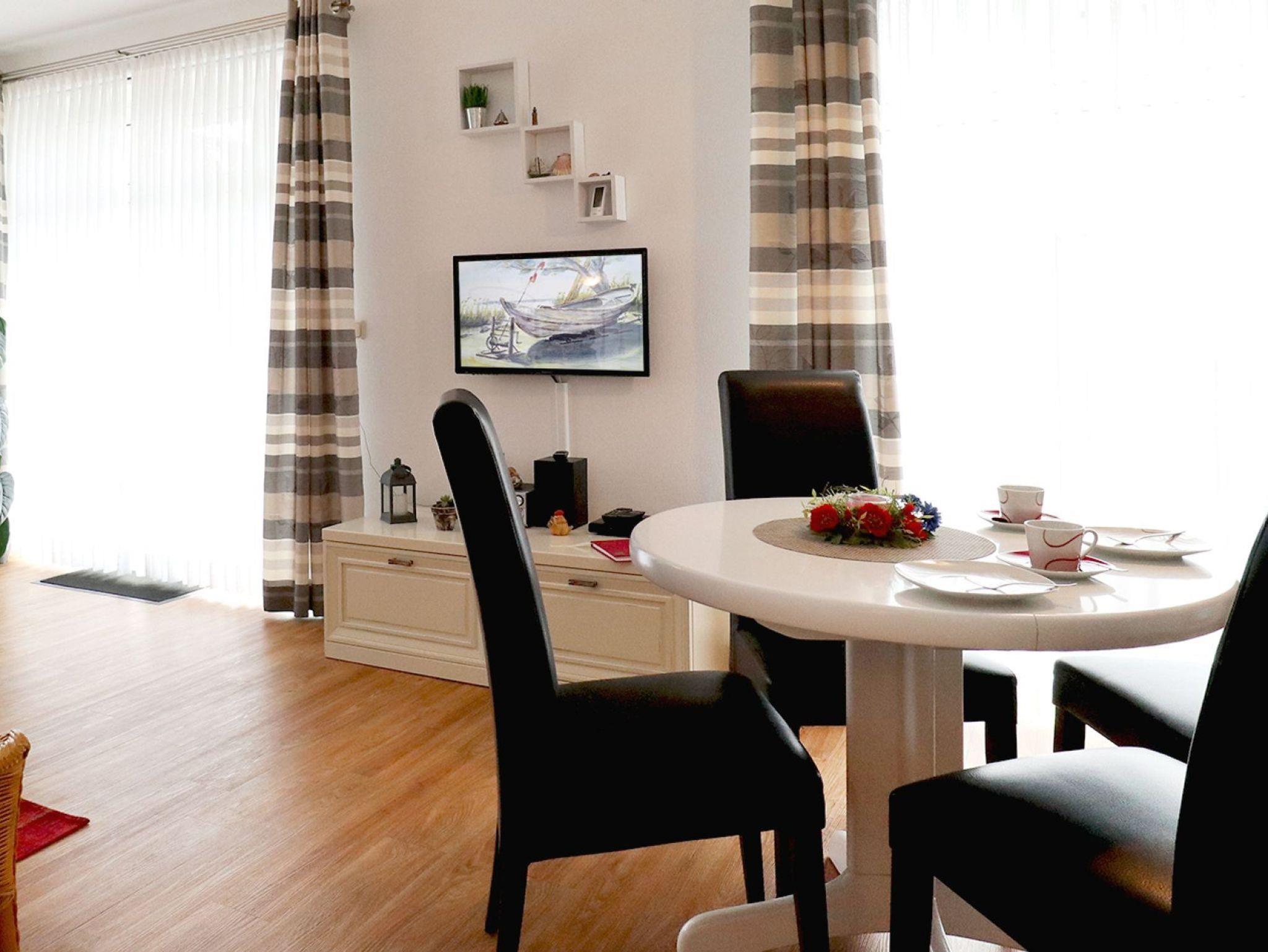Das sehr geschmackvoll eingerichtete 2- Zimmer Ferienappartement Haffblick 18 befindet sich im Parterre des Hauses und bietet Ihnen eine Terrasse mit Strandkorb und seitlichem Wiesenblick. Die Wohnfläche beträgt 50qm und ist gut geeignet für einen entspannten Aufenthalt mit bis zu 4 Personen. Im gemütliche Wohn-Essbereich erwartet Sie eine ausziehbare Sofagarnitur, welche Ihnen zwei zusätzliche Schlafmöglichkeiten bieten kann. Für gemeinsame Mahlzeiten nutzen Sie einen großzügigen Esstisch. Zudem ist moderne Unterhaltungselektronik mit SKY Empfang Flachbildfernseher, DVD-Player, Musikanlage und WLAN kostenfrei vorhanden. Des Weiteren ist eine voll ausgestattete offenen Wohnküche integriert mit Ceranherd, Backofen, Mikrowelle, Kühlschrank mit Gefrierfach sowie Wasserkocher, Kaffeemaschine und Toaster. Ihre Nächte verbringen Sie in einem separaten Schlafzimmer mit Boxspringbett und Kleiderschrank. Zugehörig ist ein innenliegendes modernes Badezimmer mit Dusche, Waschtisch und WC. Für Ihr Fahrzeug steht ein reservierter PKW-Außenstellplatz kostenfrei bereit. Haustiere sind gegen Gebühr herzlich willkommen. Rauchen ist nicht gestattet. Den feinsandigen Strand, wie auch herrliche Spazierwege entlang der Haffwiesen erreichen Sie in wenigen Gehminuten. Auf Wunsch können Sie gerne Wäschepakete mit Bettwäsche und Handtücher gegen Gebühr zu buchen. Der Sauna- Sportbereich ermöglicht allen Gästen Erholung teilweise gegen Gebühr. Waschmaschine und Wäschetrockner sind gegen Gebühr gemeinschaftlich zu nutzen. Mitgebrachte Fahrräder können in einem Fahrradabstellschuppen untergebracht werden.