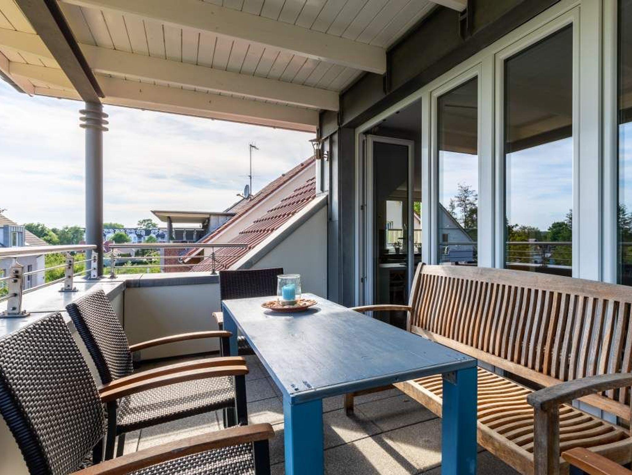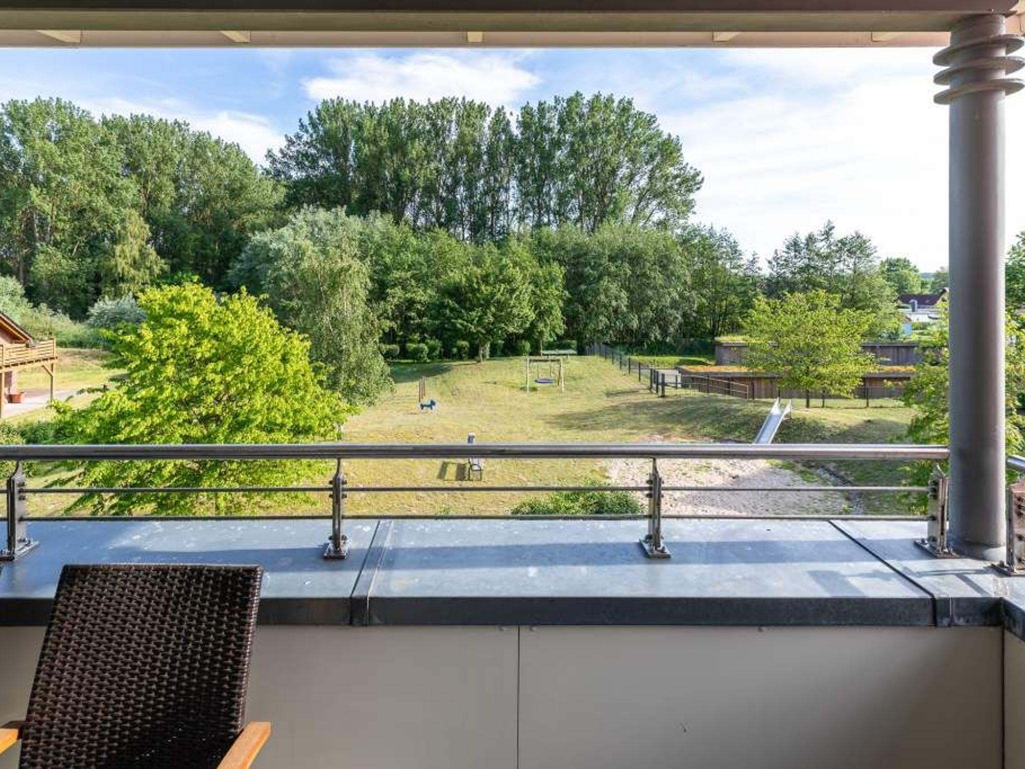 Vom Wohnbereich aus gelangen Sie direkt auf den überdachten, möblierten Südost-Balkon, auf dem Sie die Tage an der Ostsee entspannt ausklingen lassen können. Genießen Sie den Blick ins Grüne und auf den dortigen Spielplatz.