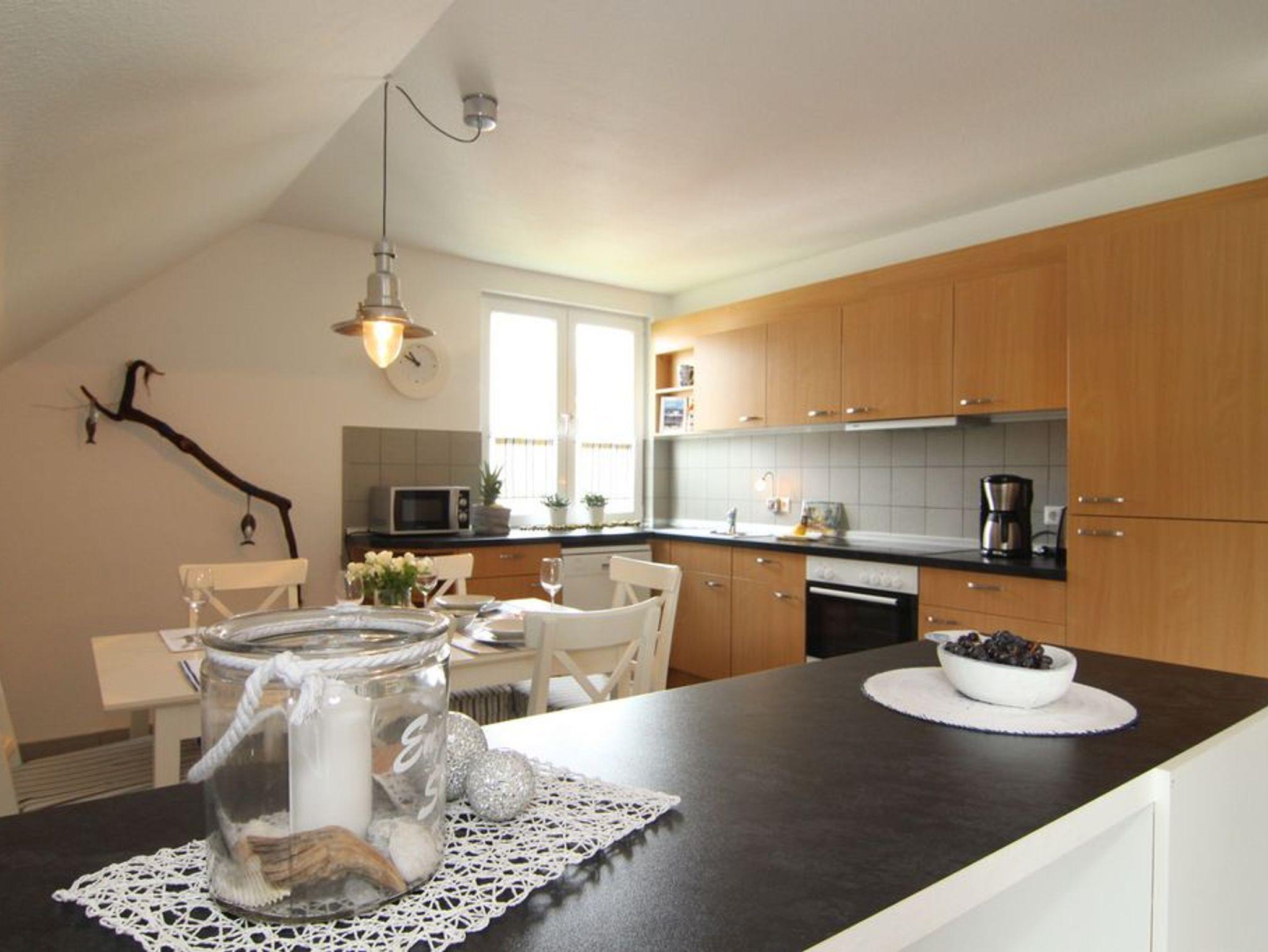 Die in den Wohnbereich integrierte Küche ist umfassend ausgestattet. Herd, Backofen, Geschirrspüler, Mikrowelle, ein Kühlschrank mit Gefrierfach sowie ausreichend Geschirr und Gläser bilden die Voraussetzung dafür, dass das Urlaubsessen gut und schnell gelingen wird. An der schönen Essecke können Sie Ihre Mahlzeiten dann bequem einnehmen.