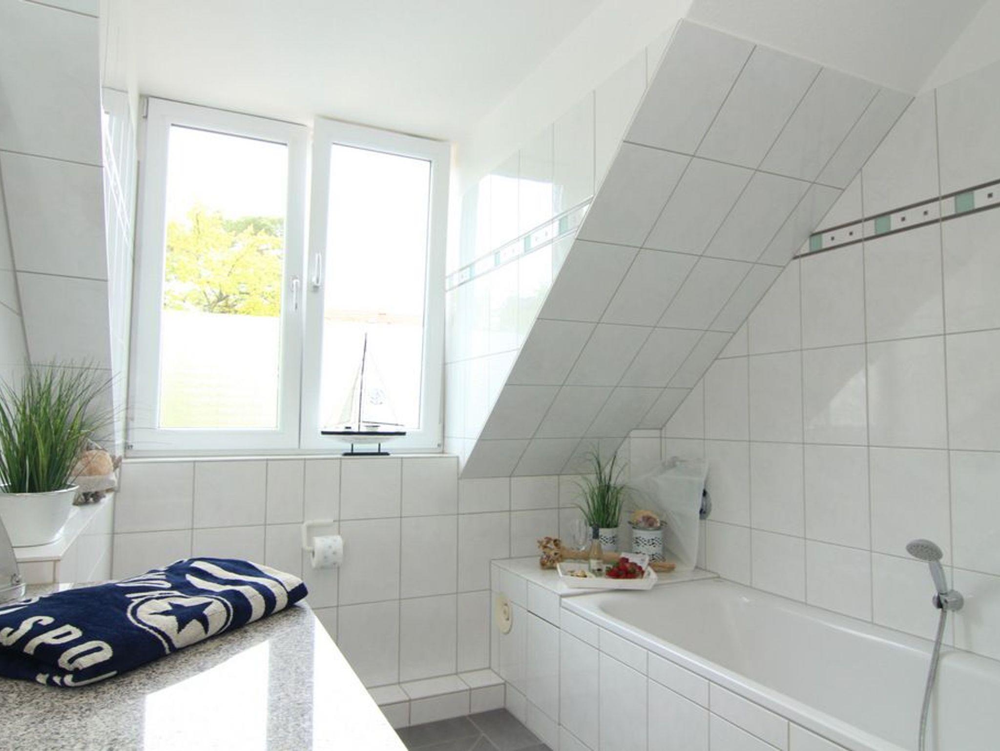Ein großzügiges, helles Bad mit Fenster bietet sowohl eine Badewanne als auch eine Dusche, WC und einem großen Waschtisch.