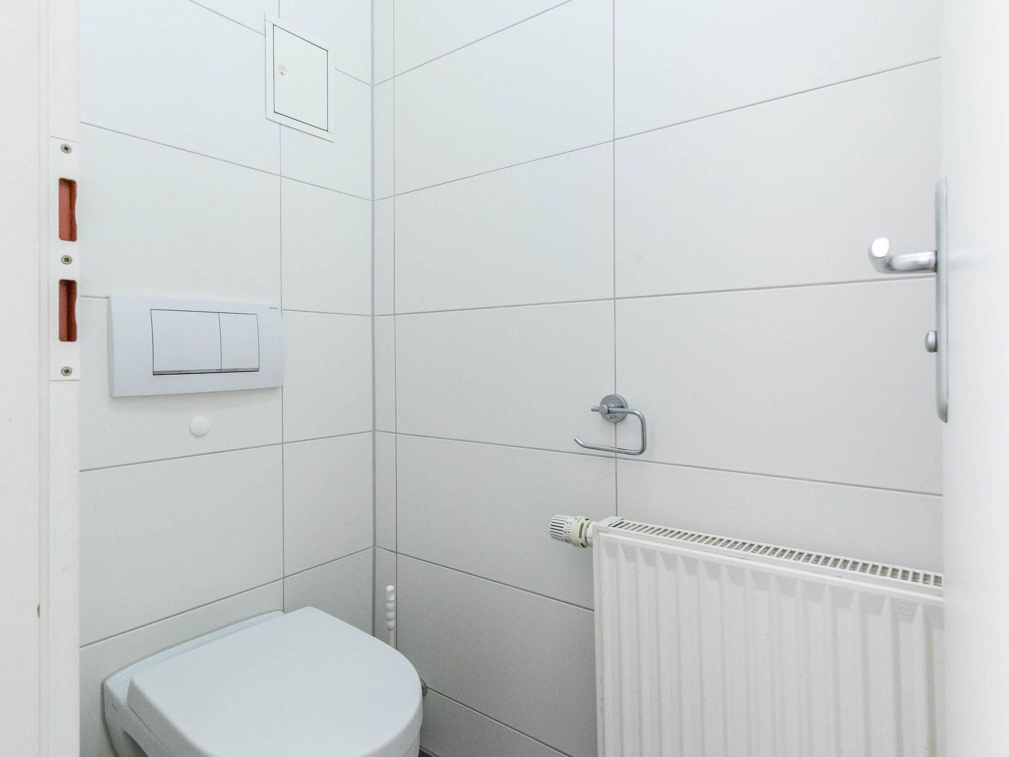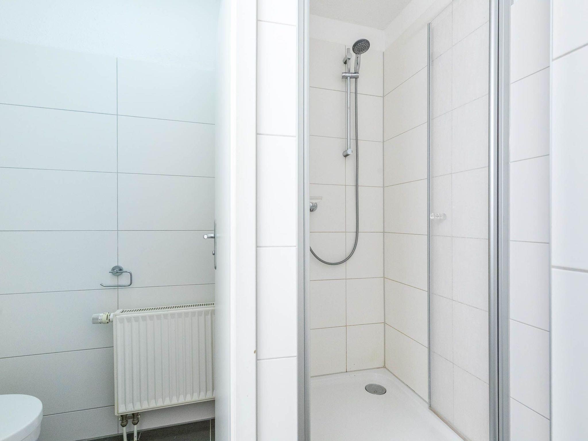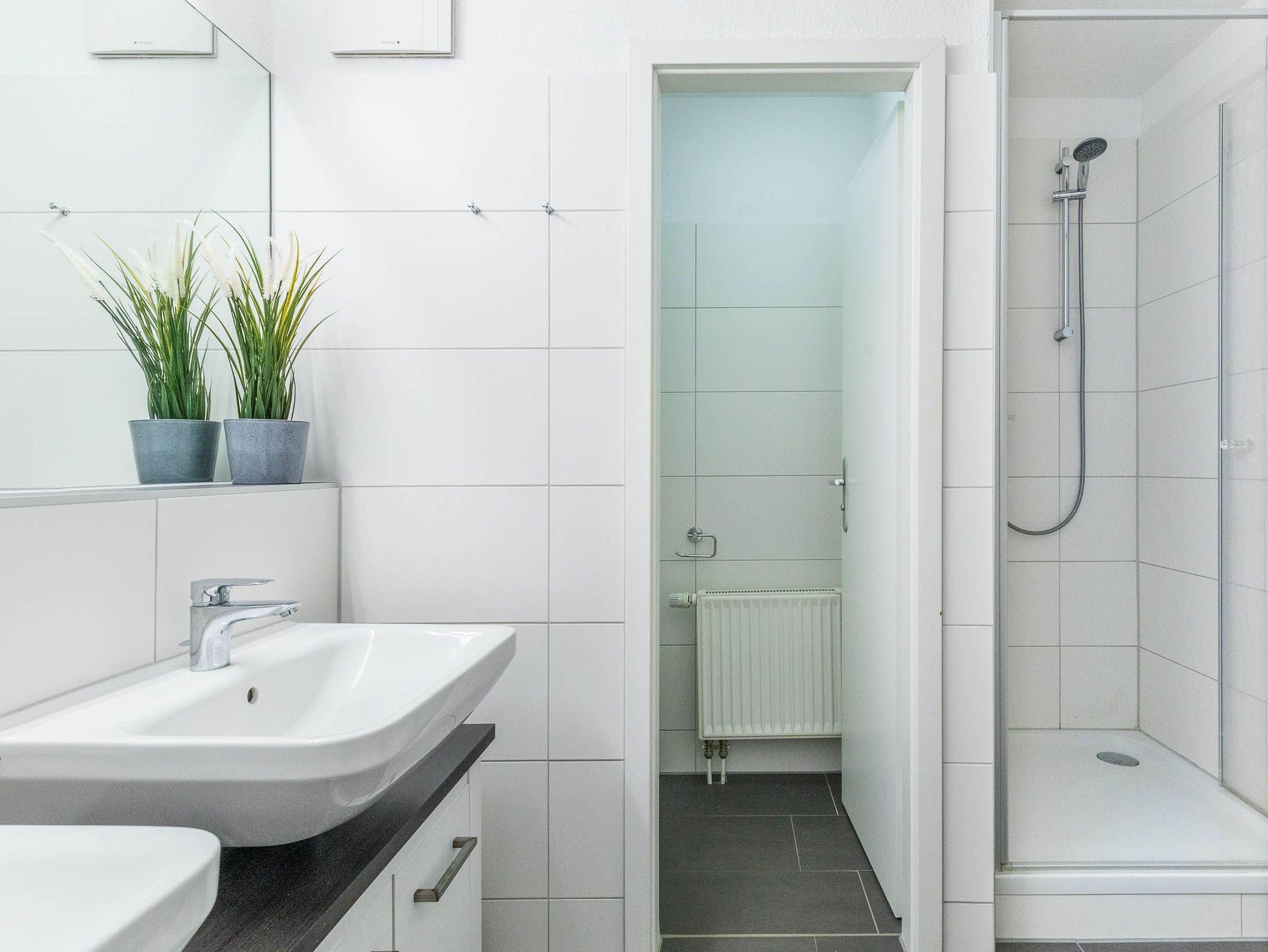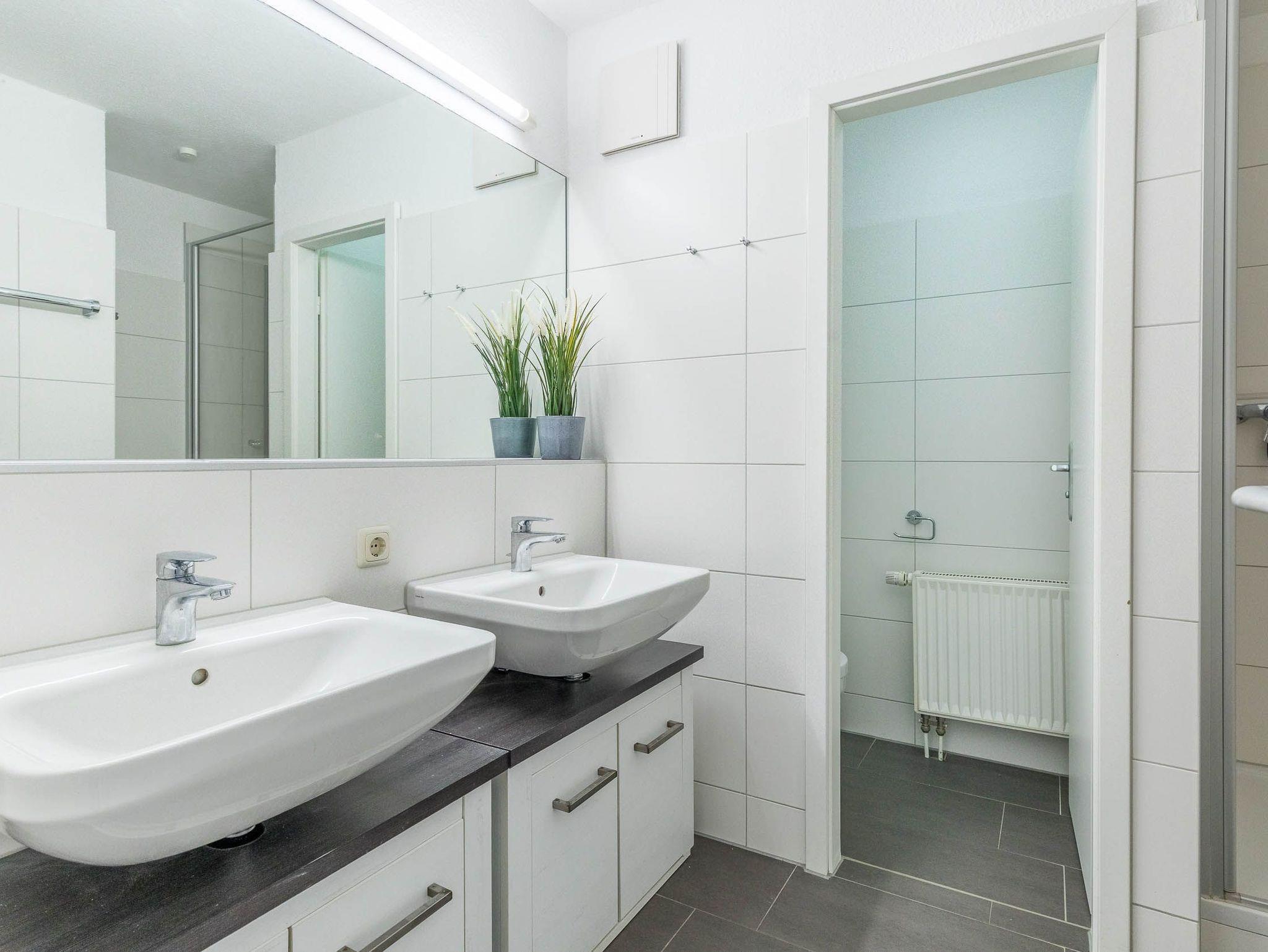 Starten Sie den Tag im hellen, gefliesten Duschbad mit Dusche und WC und zwei Waschbecken und Radio. Das WC ist getrennt vom Waschbereich.