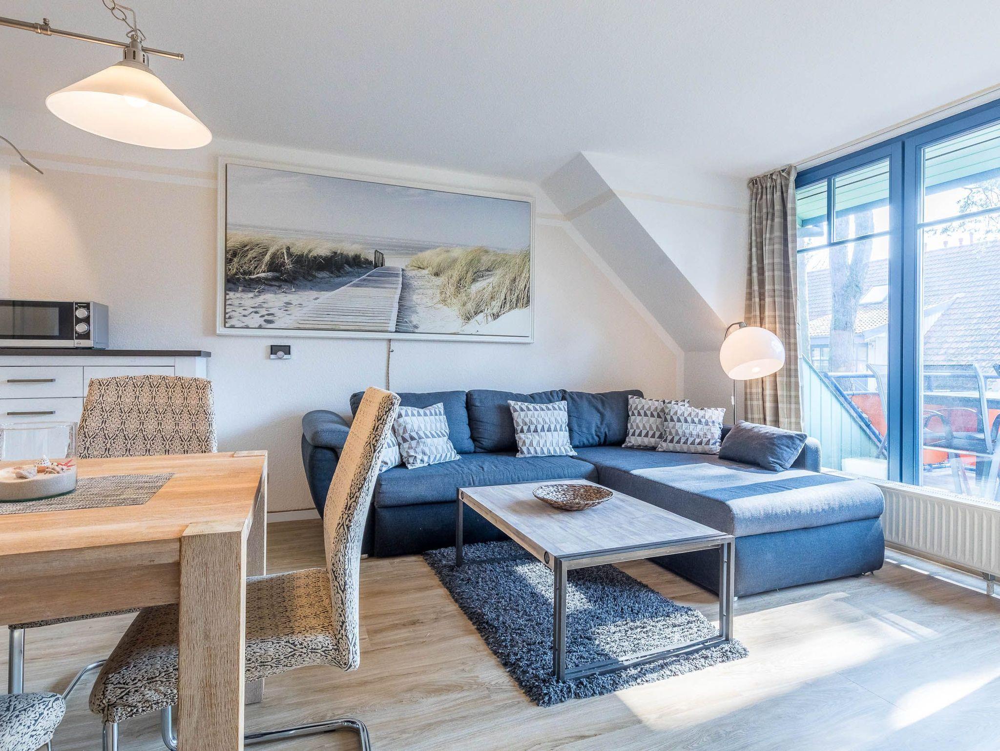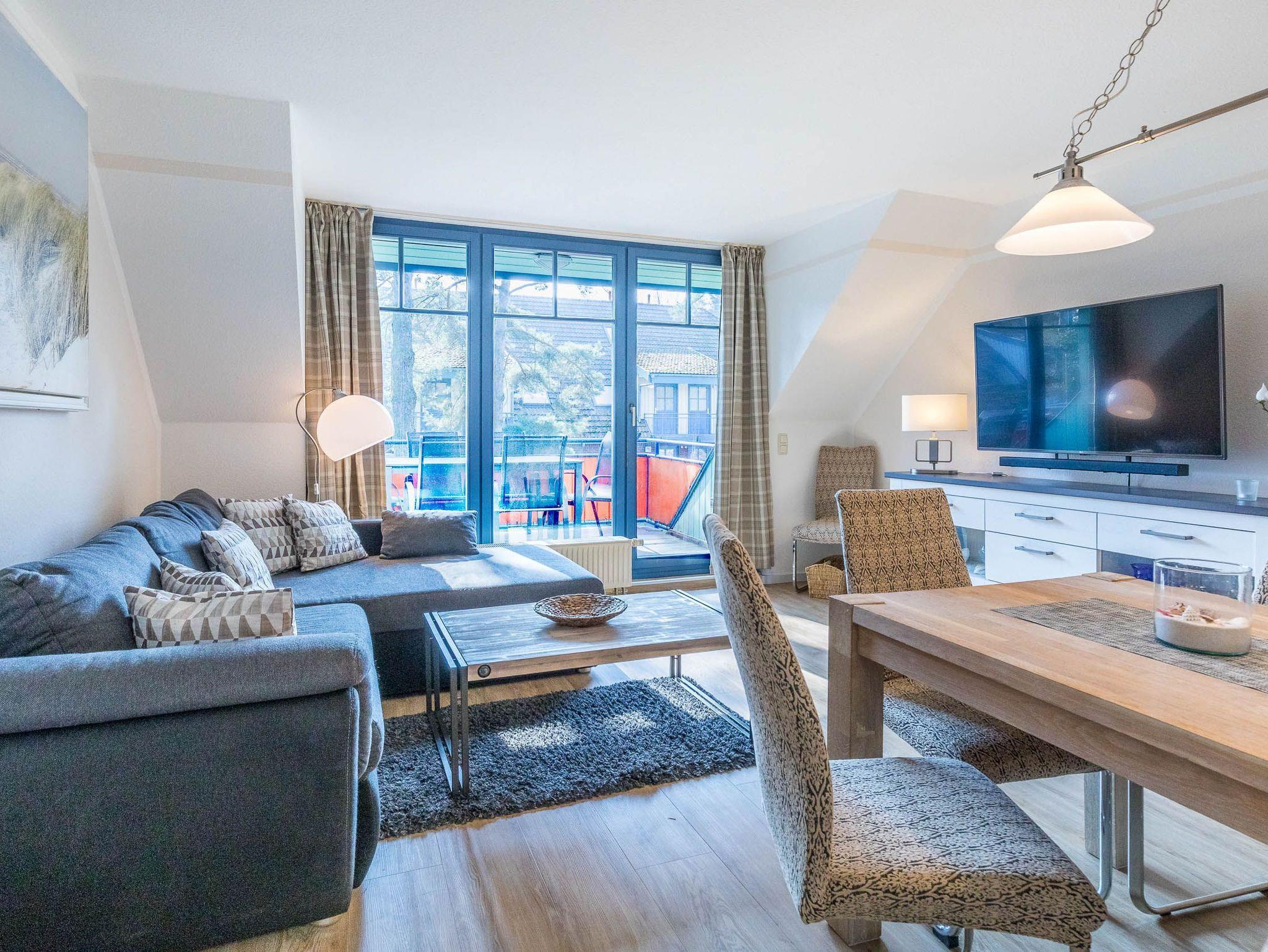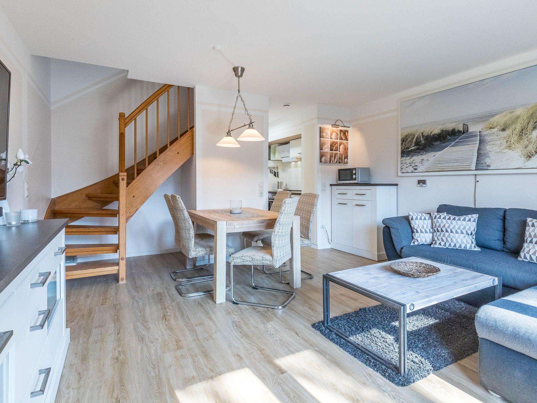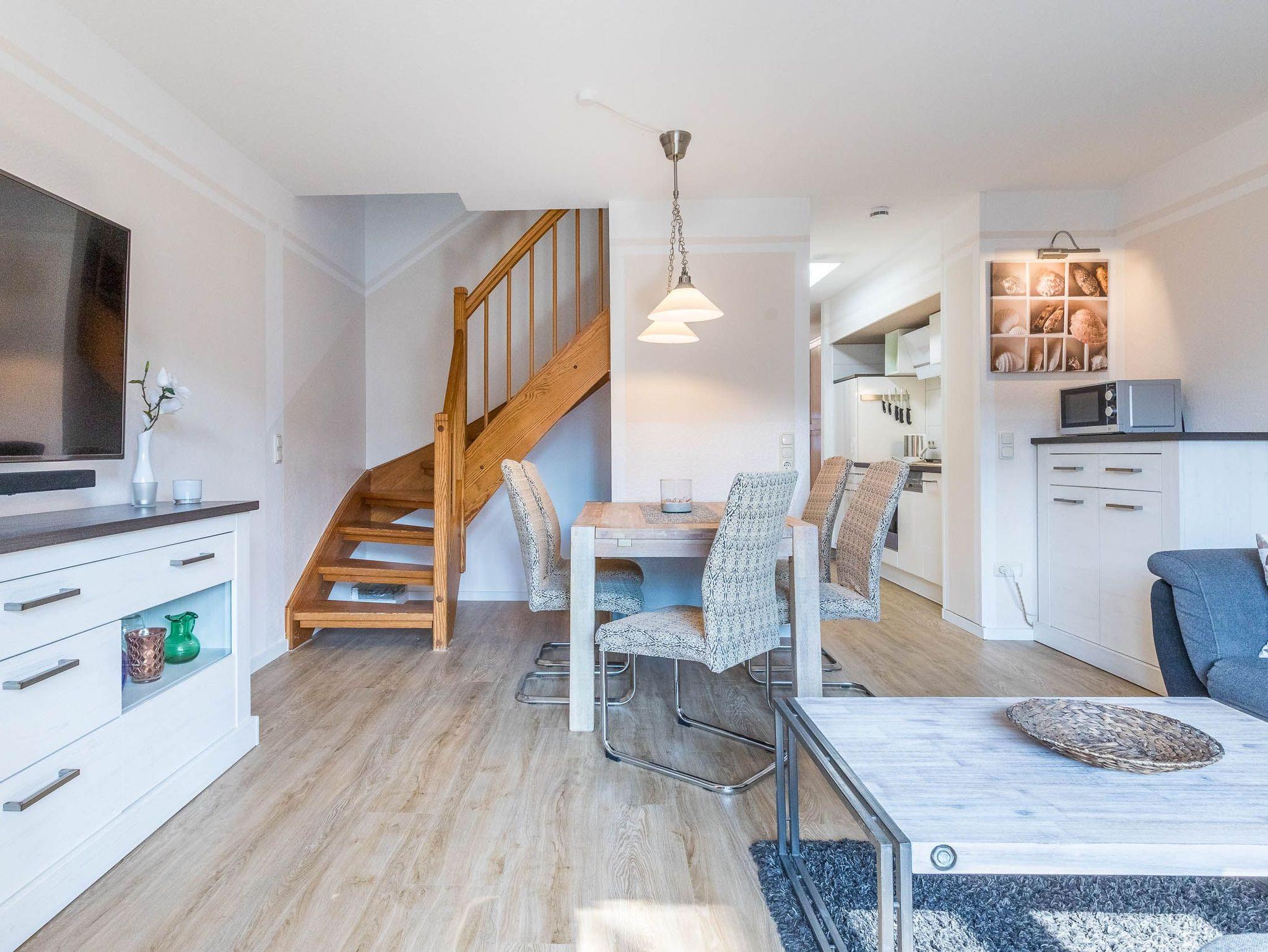 Diese Ferienwohnung wurde in 2025 umfassend renoviert mit neuen Möbeln, einem neuen Fußboden sowie einem komplett neuen Farbanstrich und verfügt über einen offenen Wohn- und Essbereich mit integrierter Küchenzeile. Der Wohnbereich mit großer Sofalandschaft ist hell und gemütlich möbliert. Für Ihre Multimediaunterhaltung sorgt ein großer Smart TV inklusive Soundbar.
