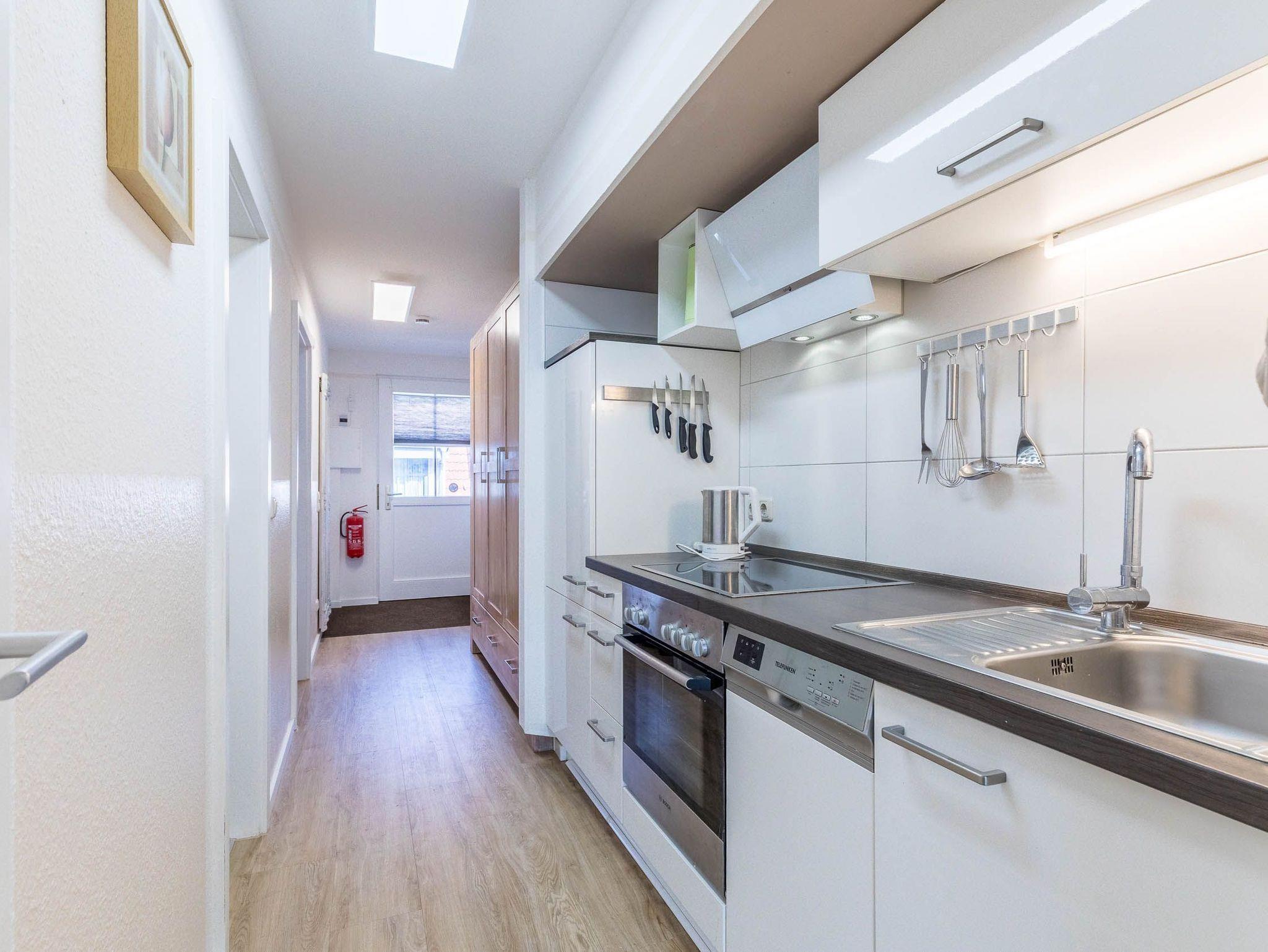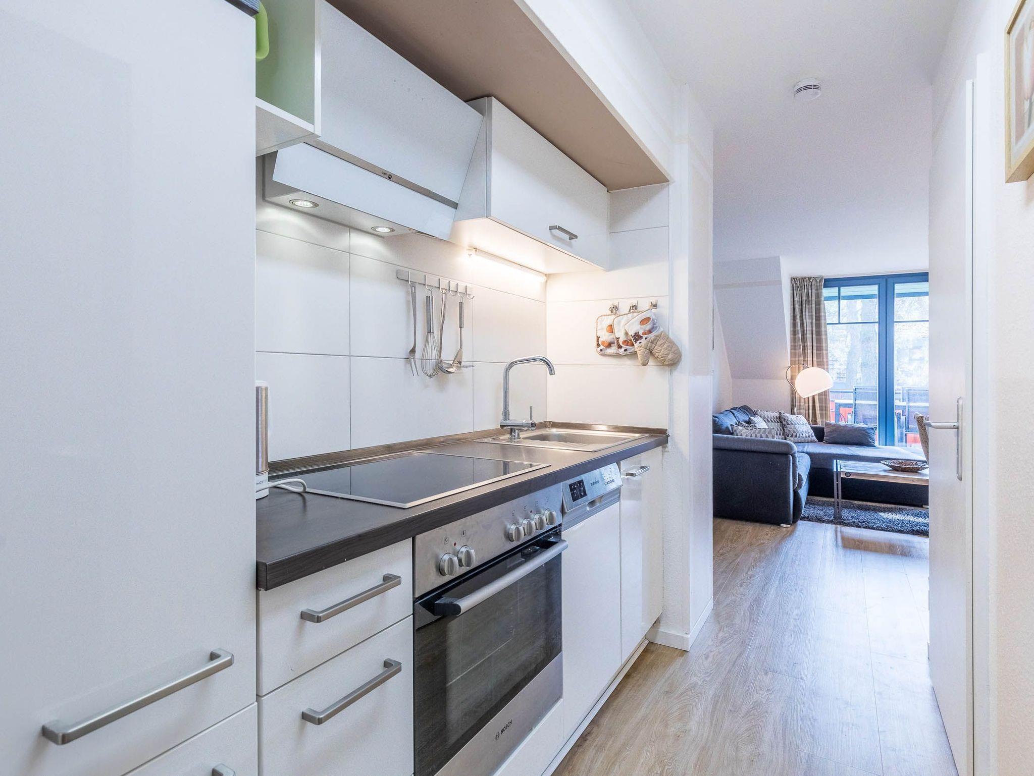Die Küchenzeile ist gut ausgestattet. So finden Sie einen Backofen mit Herdplatten, Mikrowelle, Spülmaschine, Toaster, Wasserkocher und ebenso eine Kaffeemaschine. Gemeinsame Mahlzeiten nehmen Sie am Esstisch ein, der mit vier Schwingstühlen bestückt ist. Vom Essbereich aus blicken Sie direkt auf den Balkon mit Gartenmöbeln.