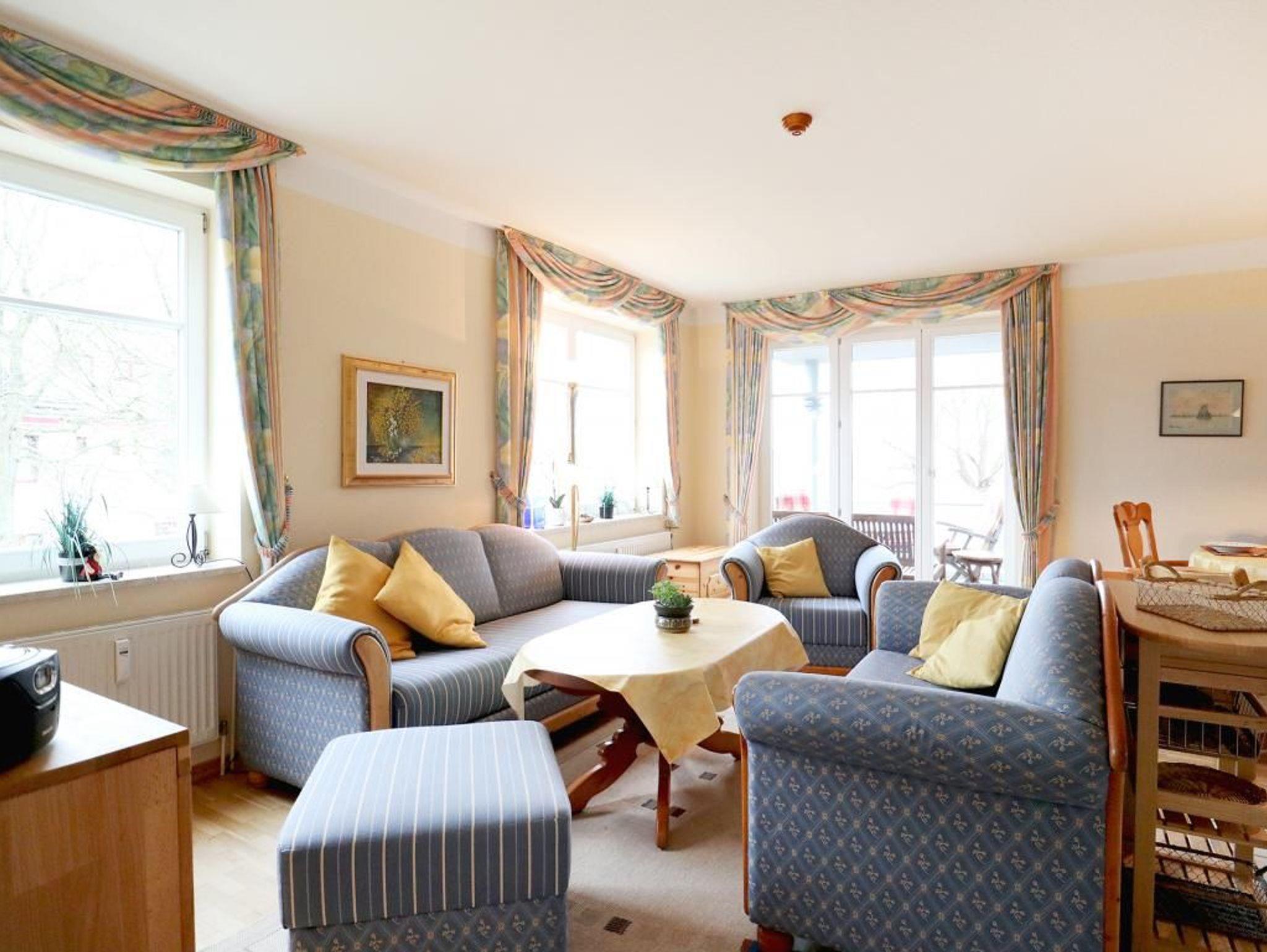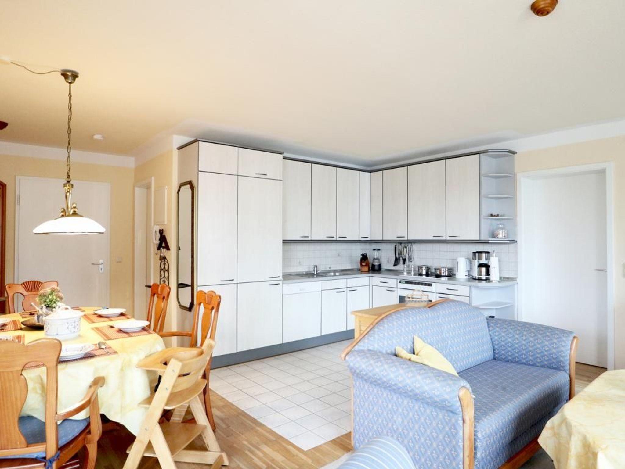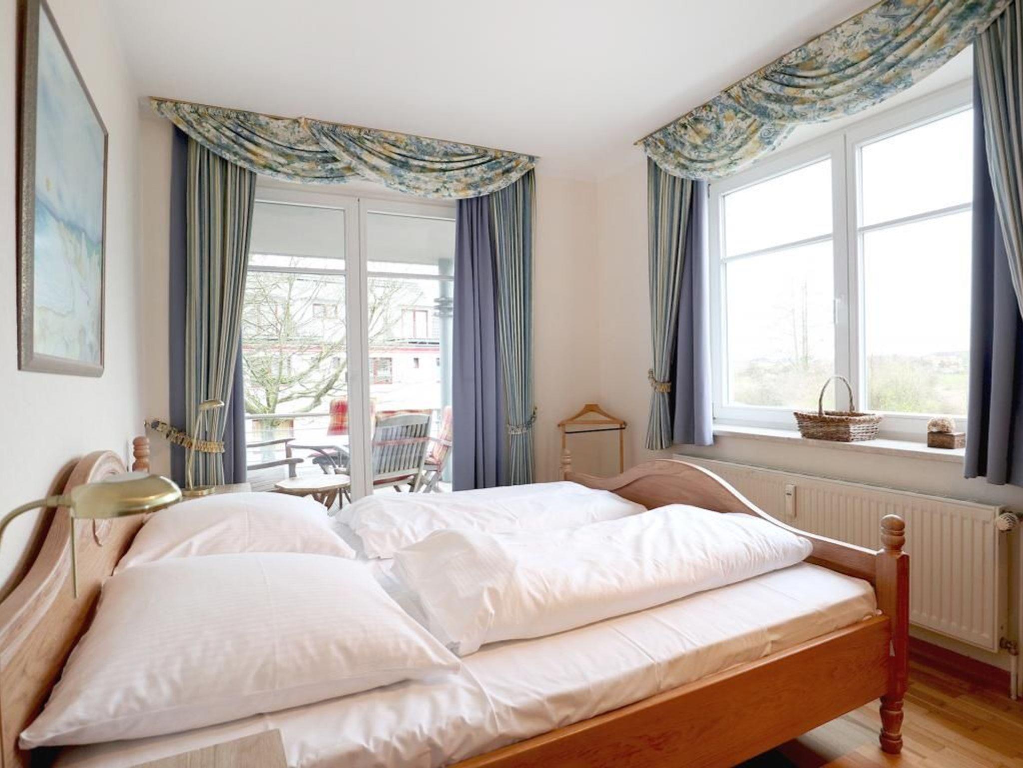 Die wohnlich möblierte 3-Zimmerwohnung für bis zu 6 Personen, befindet sich im 1. OG und besitzt zwei Balkone. Die Wohnfläche beträgt 70qm. Im Wohn-Essbereich empfängt Sie eine Sofagarnitur, Esstisch sowie Kommoden. Ein Fernseher, Musikanlage und gebührenfreies WLAN sind selbstverständlich vorhanden. Die gut ausgestattete Wohnküche ist offen gestaltet und ermöglicht die eigenständige Versorgung mit Urlaubsmahlzeiten: Herd, Backofen, Kühlschrank mit sep. Gefrierfach, Kaffeemaschine, Toaster, Geschirrspüler usw. Ihre Mahlzeiten nehmen Sie am großen Esstisch zu sich, oder Sie genießen die Vorzüge des saisonal möblierten, sonnigen Balkon, den Sie vom Wohnbereich und auch vom einem der Schlafzimmer betreten können. Die Wohnung verfügt über zwei separate Schlafzimmer mit insgesamt 6 Schlafplätzen. 1x mit Doppelbett, Kleiderschrank und Balkonzugang. 1x mit zwei Etagenbetten, Schreibplatz, einem weiteren Fernseher, Balkonzugang. Zugehörig ist ein zweckmäßiges Duschbad mit Waschtisch, Handtuchheizung, Föhn, WC. Für Kleinkinder stehen ein Kinderhochstuhl, Bügeleisen, Bügelbrett in der Wohnung bereit. Waschmaschine und Wäschetrockner stehen allen Gästen gegen Gebühr zur Verfügung. Mitgebrachte Fahrräder können auf dem hauseigenen Grundstück an Fahrradständern, oder nach Verfügbarkeit im Untergeschoss des Hauses untergebracht werden. Ihren PKW parken Sie in der Tiefgarage. Haustiere sind nicht gestattet. Nichtraucherwohnung.