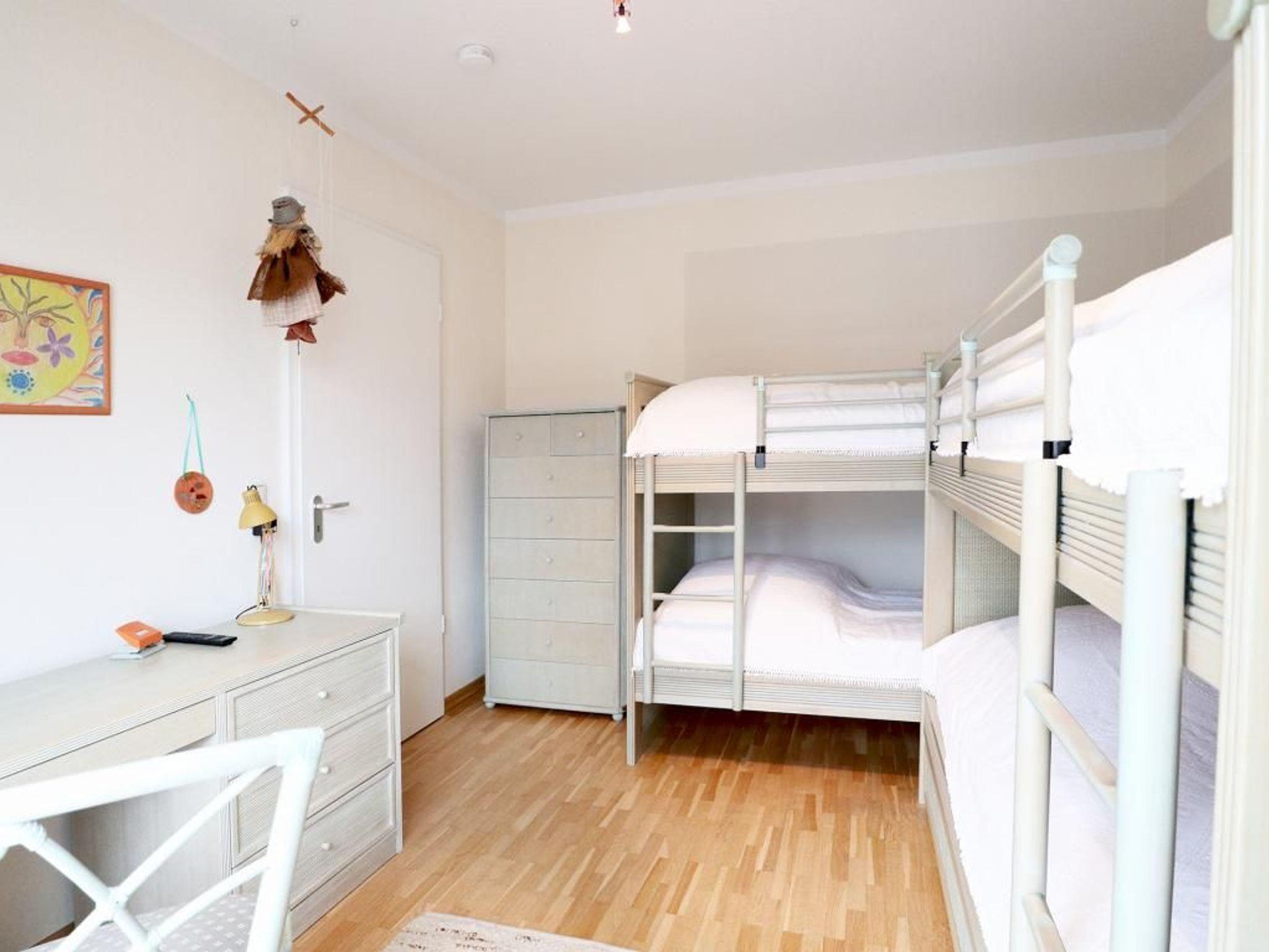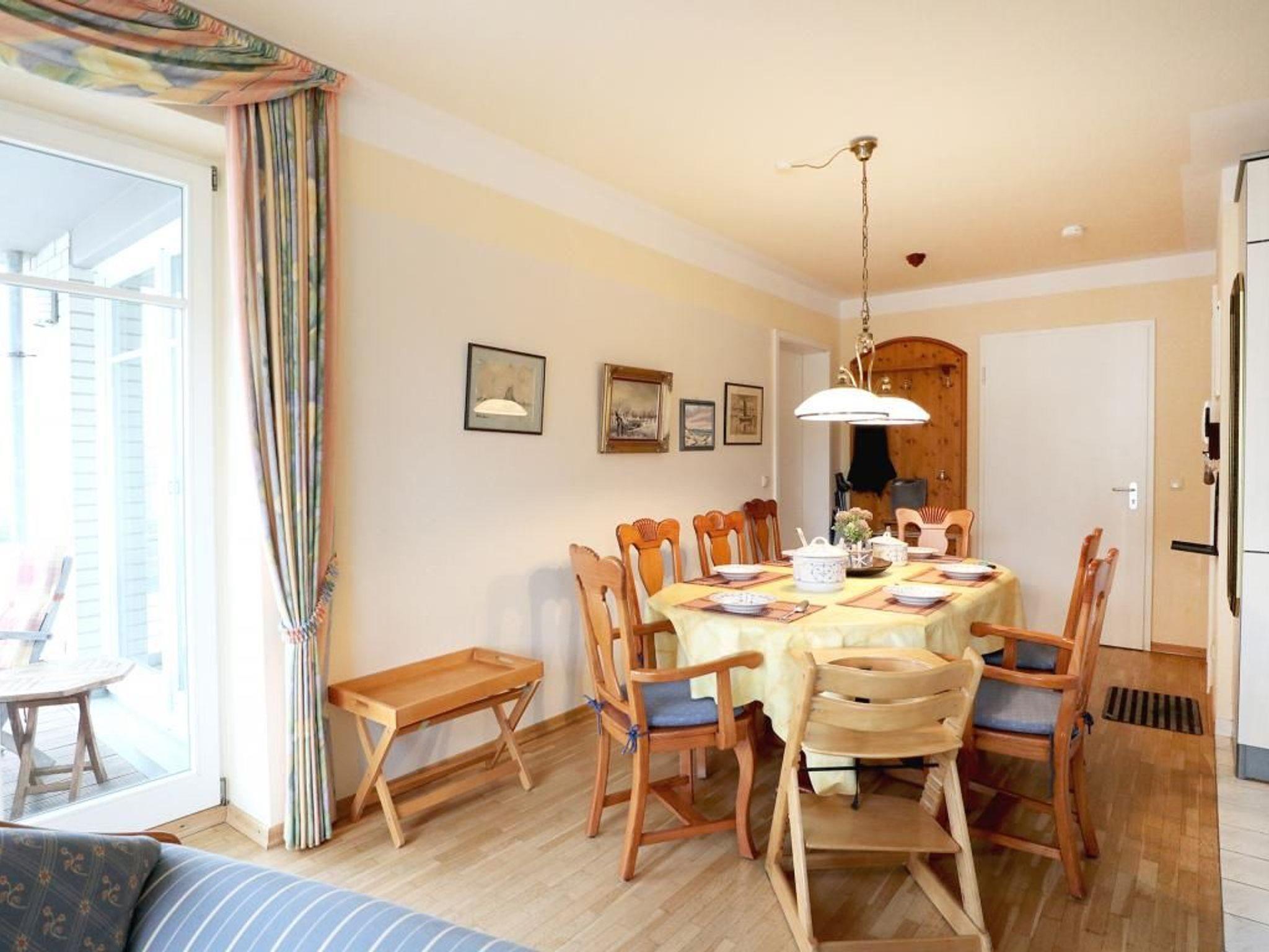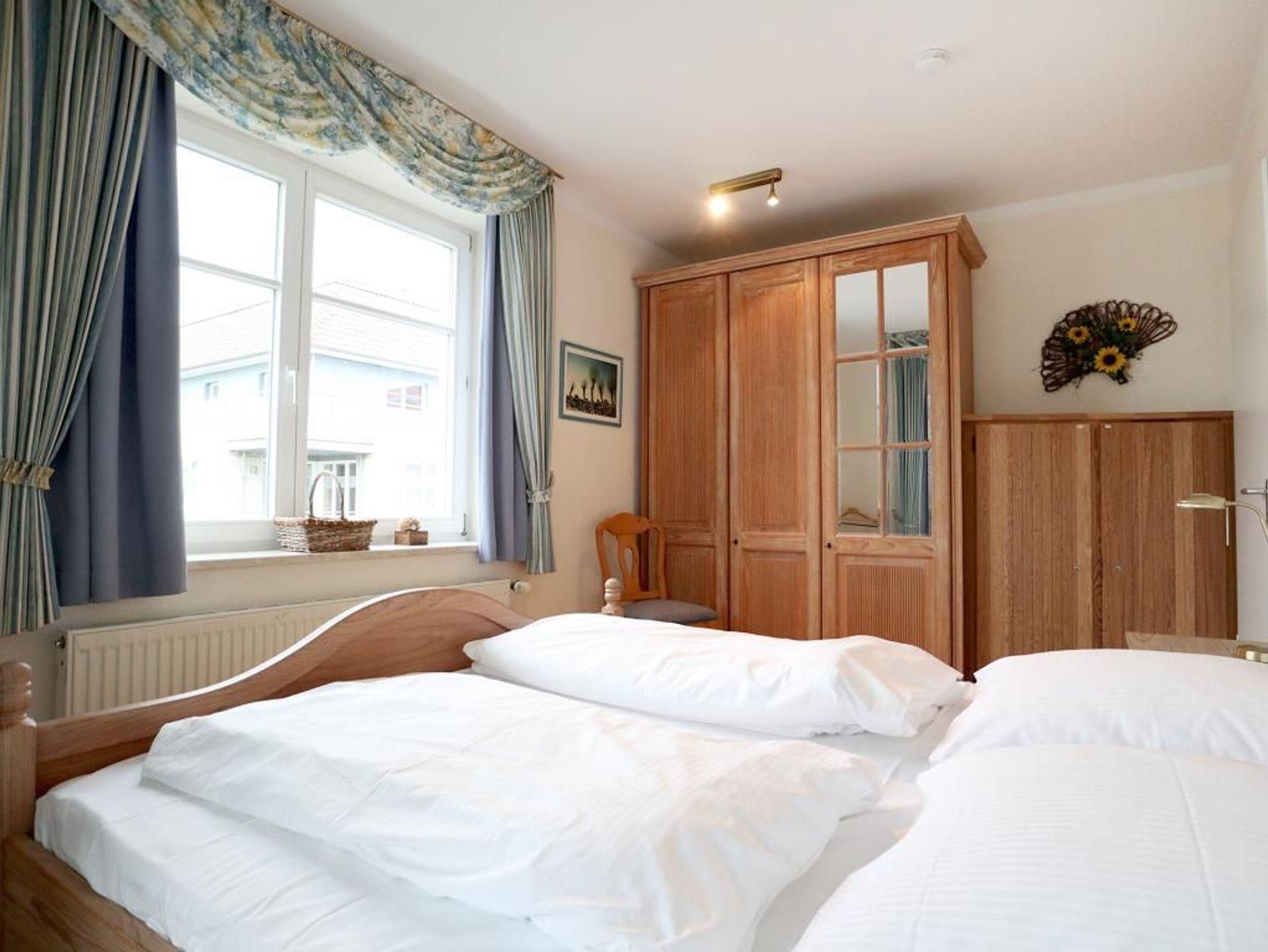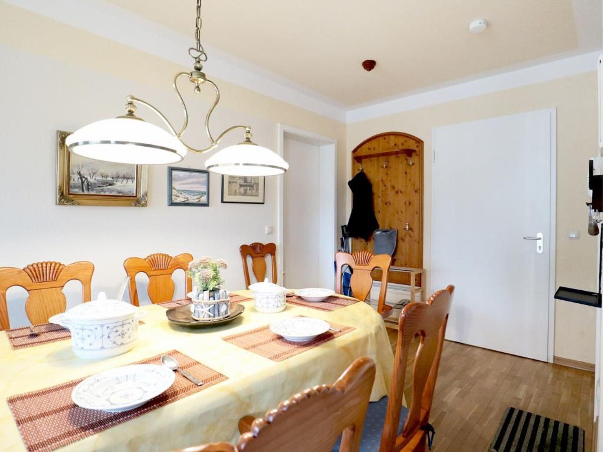 Die wohnlich möblierte 3-Zimmerwohnung für bis zu 6 Personen, befindet sich im 1. OG und besitzt zwei Balkone. Die Wohnfläche beträgt 70qm. Im Wohn-Essbereich empfängt Sie eine Sofagarnitur, Esstisch sowie Kommoden. Ein Fernseher, Musikanlage und gebührenfreies WLAN sind selbstverständlich vorhanden. Die gut ausgestattete Wohnküche ist offen gestaltet und ermöglicht die eigenständige Versorgung mit Urlaubsmahlzeiten: Herd, Backofen, Kühlschrank mit sep. Gefrierfach, Kaffeemaschine, Toaster, Geschirrspüler usw. Ihre Mahlzeiten nehmen Sie am großen Esstisch zu sich, oder Sie genießen die Vorzüge des saisonal möblierten, sonnigen Balkon, den Sie vom Wohnbereich und auch vom einem der Schlafzimmer betreten können. Die Wohnung verfügt über zwei separate Schlafzimmer mit insgesamt 6 Schlafplätzen. 1x mit Doppelbett, Kleiderschrank und Balkonzugang. 1x mit zwei Etagenbetten, Schreibplatz, einem weiteren Fernseher, Balkonzugang. Zugehörig ist ein zweckmäßiges Duschbad mit Waschtisch, Handtuchheizung, Föhn, WC. Für Kleinkinder stehen ein Kinderhochstuhl, Bügeleisen, Bügelbrett in der Wohnung bereit. Waschmaschine und Wäschetrockner stehen allen Gästen gegen Gebühr zur Verfügung. Mitgebrachte Fahrräder können auf dem hauseigenen Grundstück an Fahrradständern, oder nach Verfügbarkeit im Untergeschoss des Hauses untergebracht werden. Ihren PKW parken Sie in der Tiefgarage. Haustiere sind nicht gestattet. Nichtraucherwohnung.