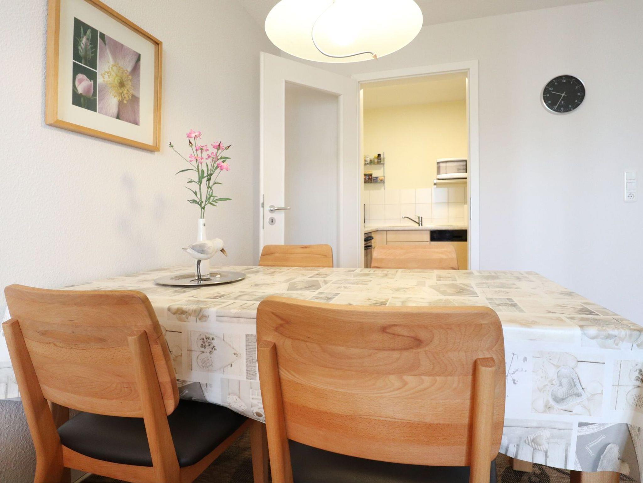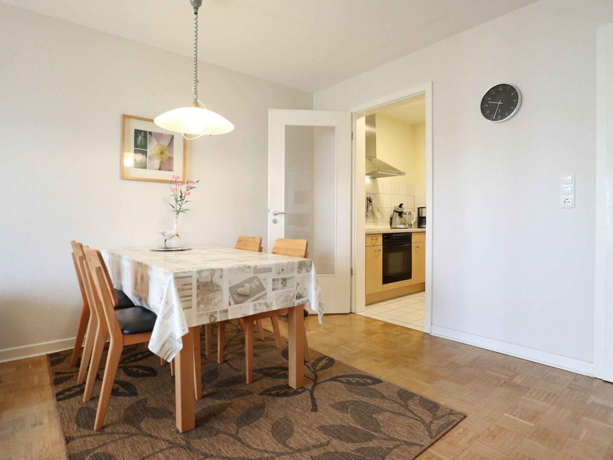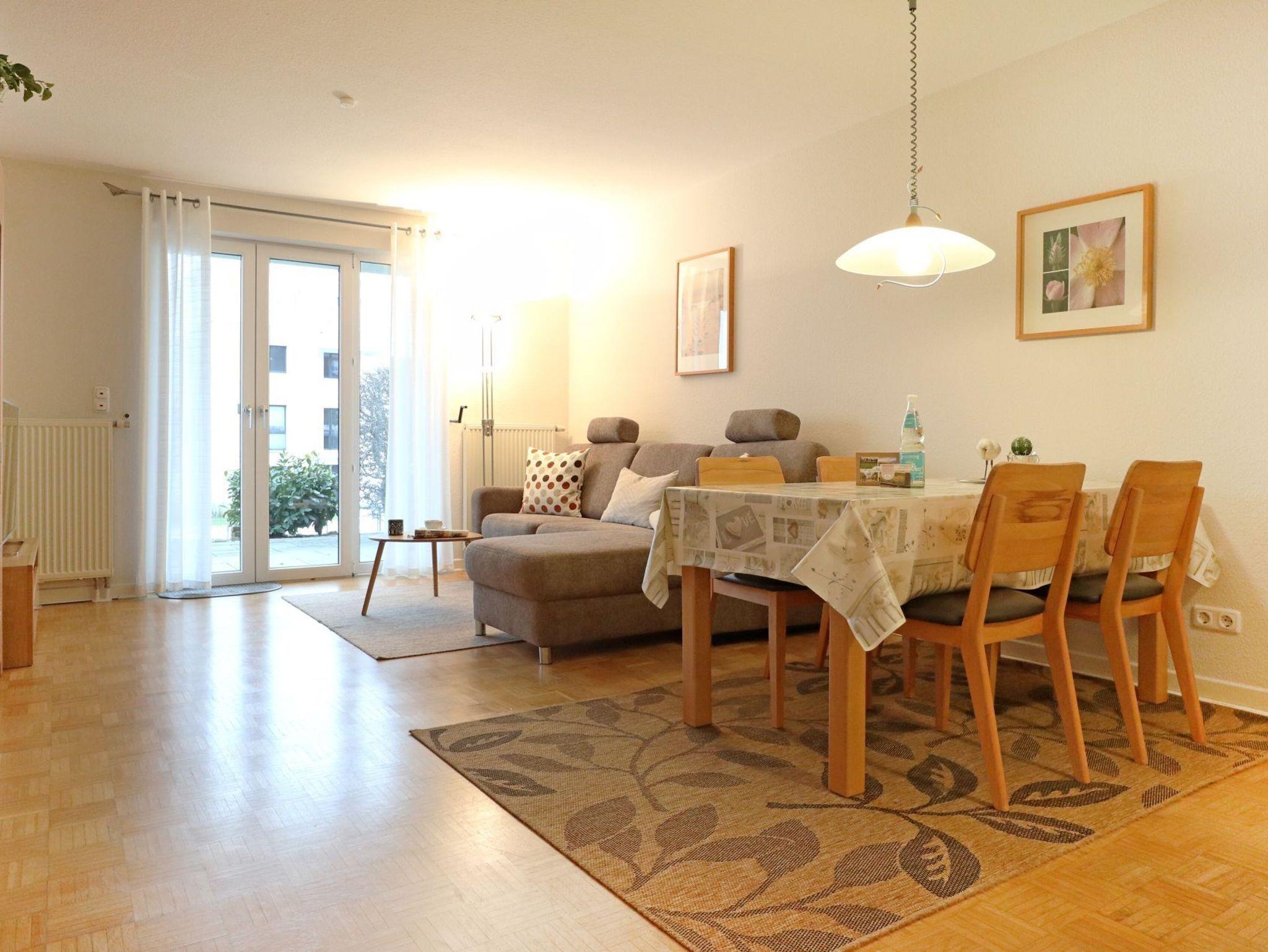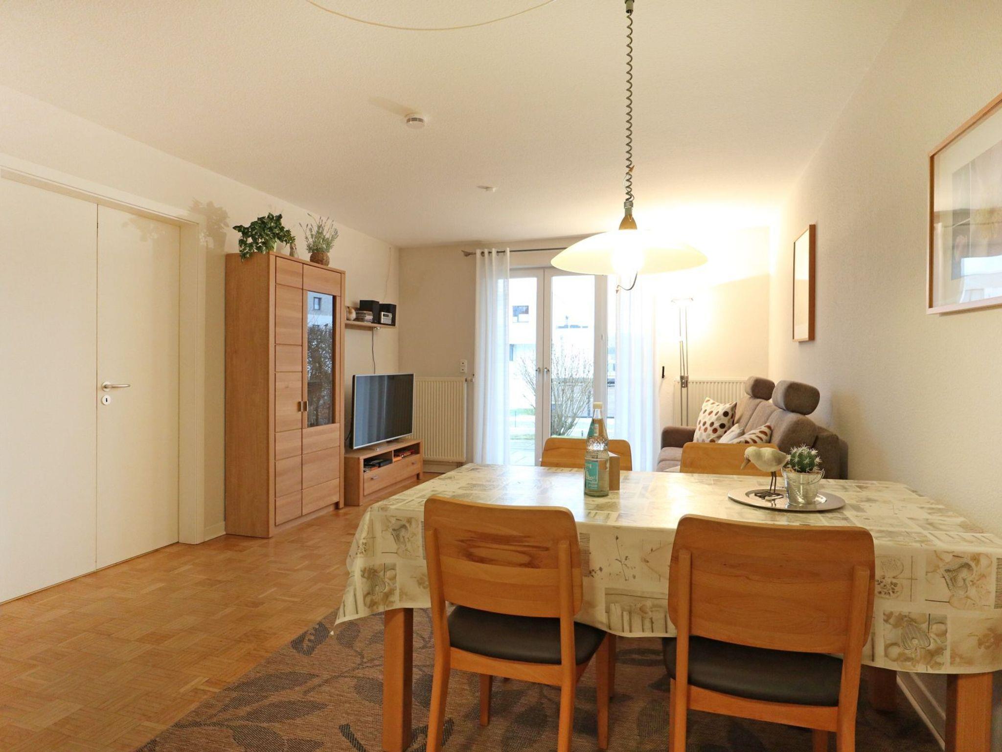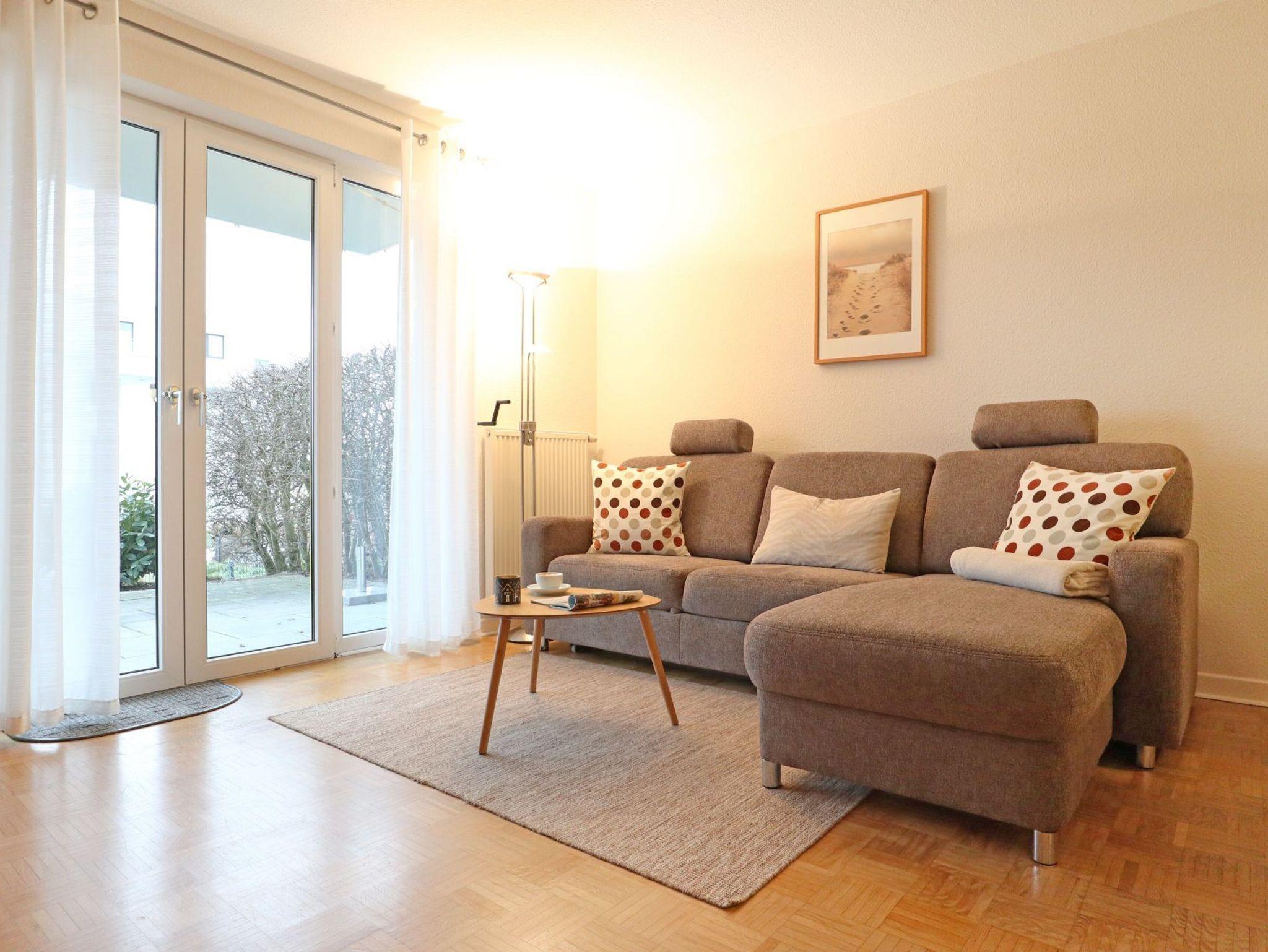 Das 2-Zimmer Appartement Seeschwalbe 4, bietet Ihnen eine Wohnfläche von ca.57qm und ist für eine Belegung mit bis zu 4 Personen geeignet. Mit dem Fahrstuhl gelangen Sie bequem von der Tiefgarage zum Erdgeschoss Appartement. Das komfortabel möblierte Wohn- und Esszimmer ist mit einem Sofa als ausziehbares Schlafsofa für zwei Personen sowie Beistelltisch, Esstisch mit vier Sitzplätzen, Fernseher und Musikanlage ausgestattet. WLAN kann gebührenfrei genutzt werden. Vom Wohnbereich aus gelangen Sie auf die saisonal möblierte Süd Terrasse. In der separaten, voll ausgestatteten Küche bereiten Sie Ihre Urlaubsmahlzeiten zu: Ceranfeldherd, Backofen, Mikrowelle, Kühlschrank mit integr. Gefrierfach, Kaffeemaschine, Wasserkocher, Toaster usw. Ihre Nächte verbringen Sie in einem Komfortschlafzimmer mit Boxspringbett und Kleiderschrank. Zugehörig ist ein modernisiertes Duschbad mit Waschtisch, Handtuchheizung, Föhn, WC und Waschmaschine. Ebenso befinden sich ein Bügeleisen und Bügelbrett in der Wohnung. Für Ihren PKW steht ein Stellplatz in der hauseigenen Tiefgarage zur Verfügung. In der Nichtraucherwohnung sind Haustiere nicht gestattet.