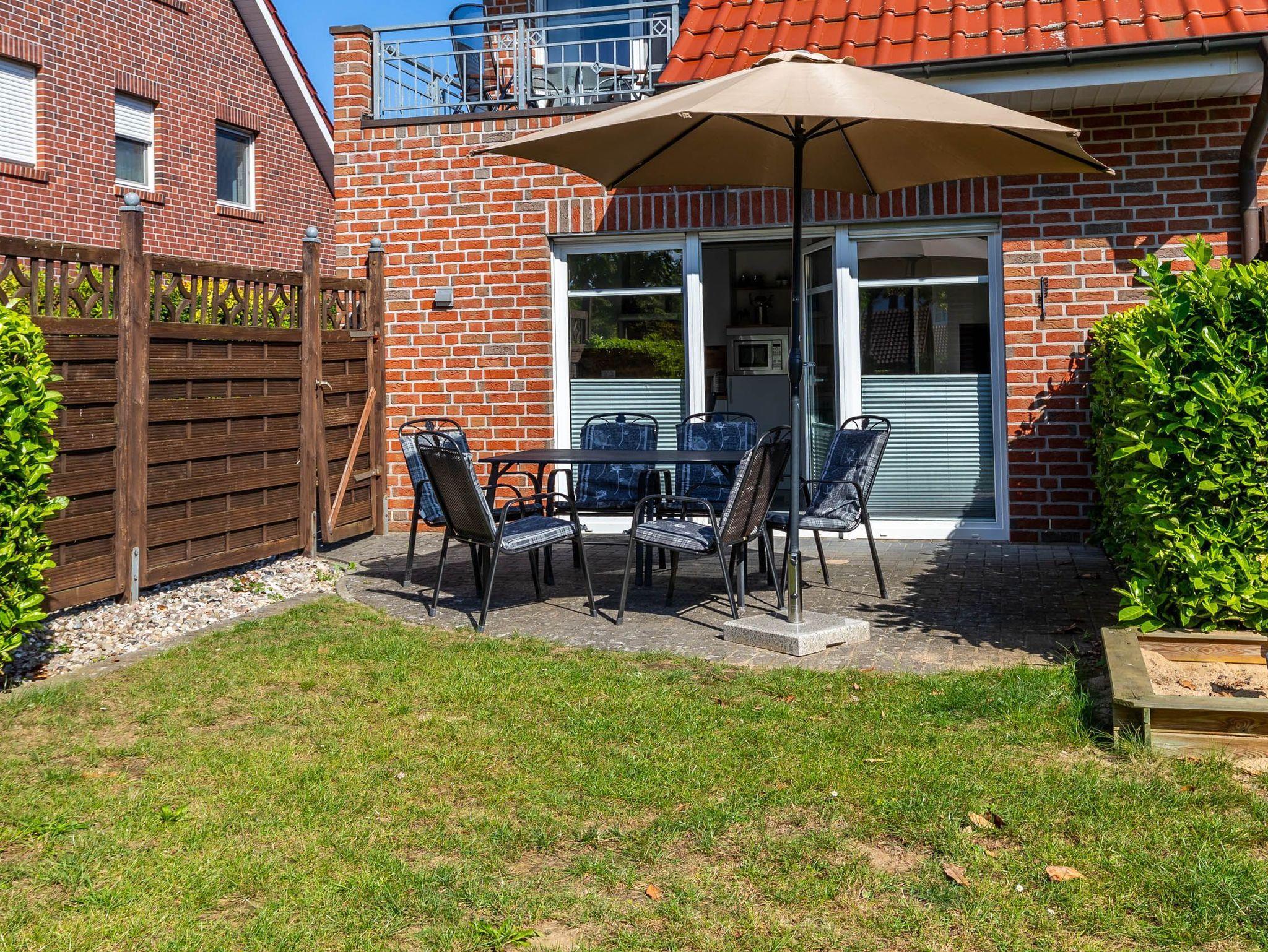 Zur Wohnung gehört eine Terrasse mit Gartenmöbeln und Garten.