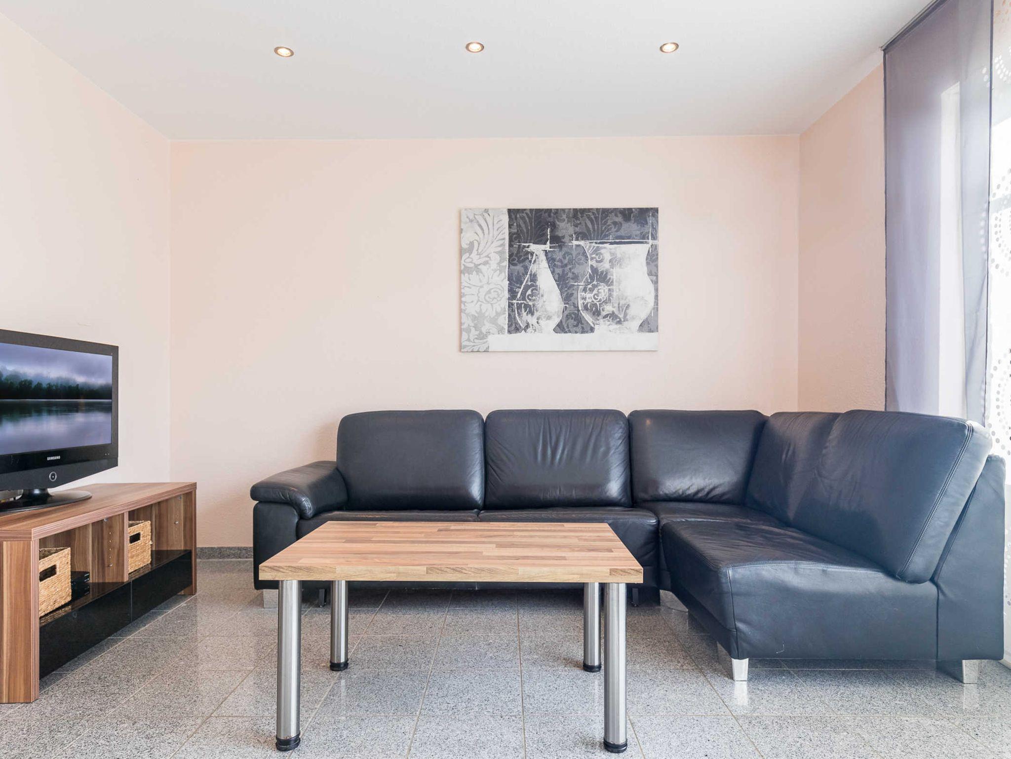 Im Wohnbereich erwartet Sie Sat-TV, eine Essecke sowie eine Schlafcouch, auf der ein weiterer Gast schlafen könnte.