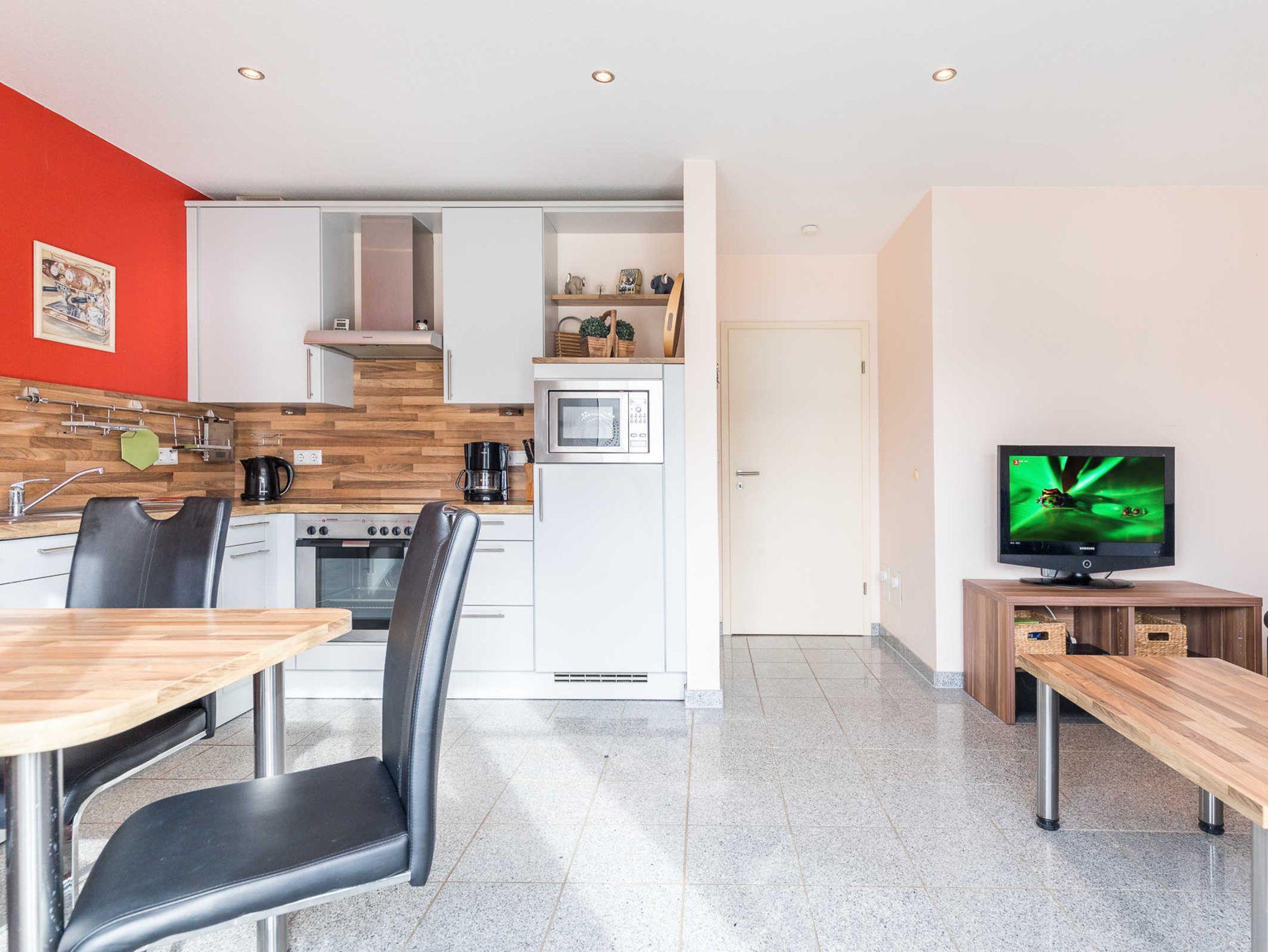 Die offene Küche bietet neben einem Cerankochfeld mit Backofen einen Kühlschrank mit Gefrierfach, eine Mikrowelle, eine Spülmaschine, einen Toaster und einen Wasserkocher.