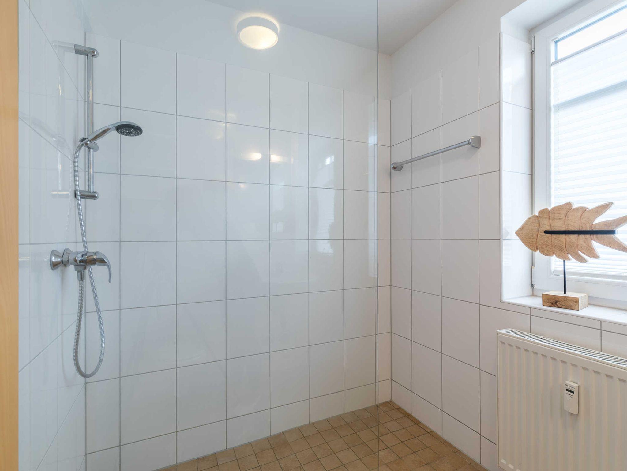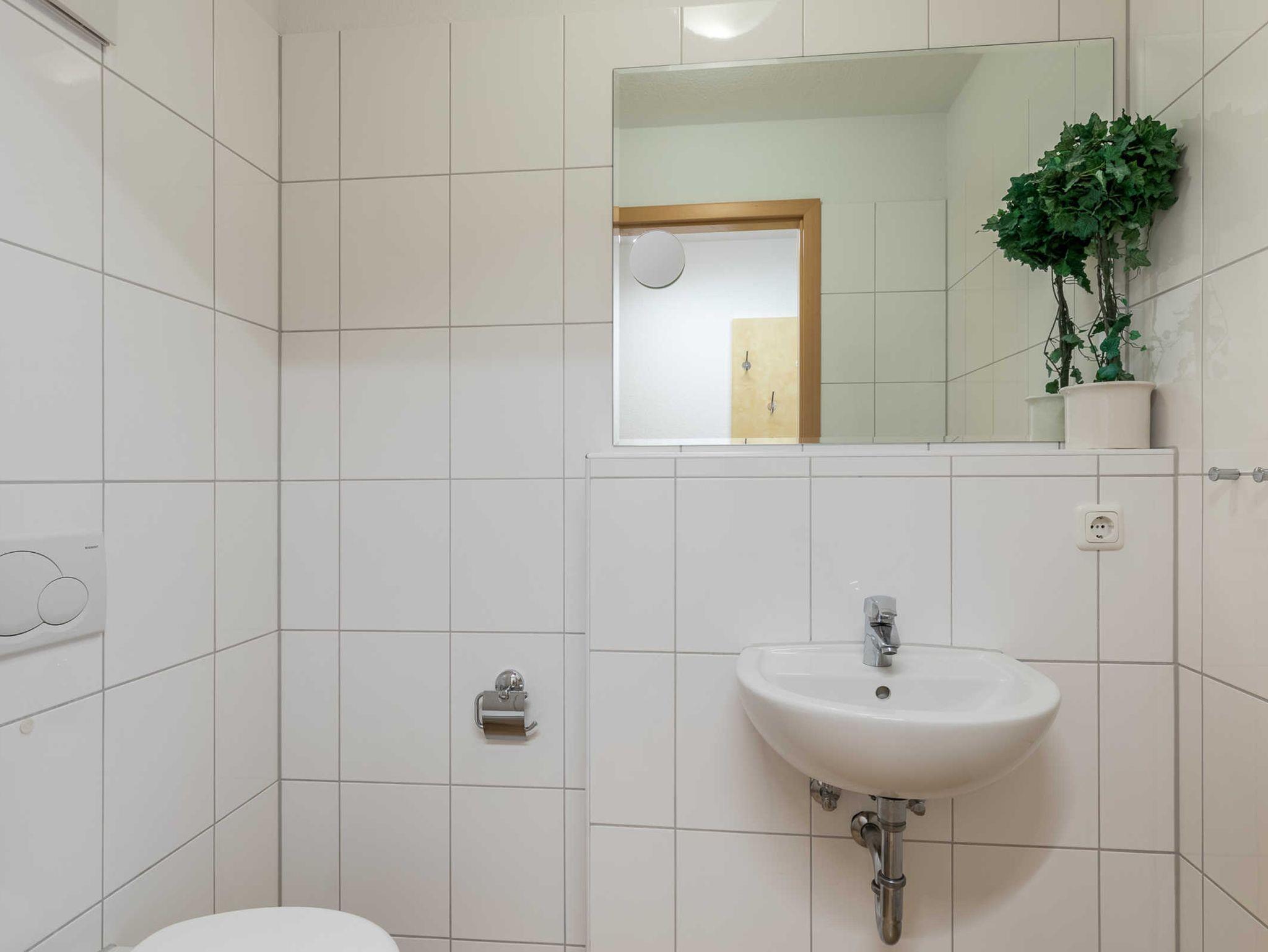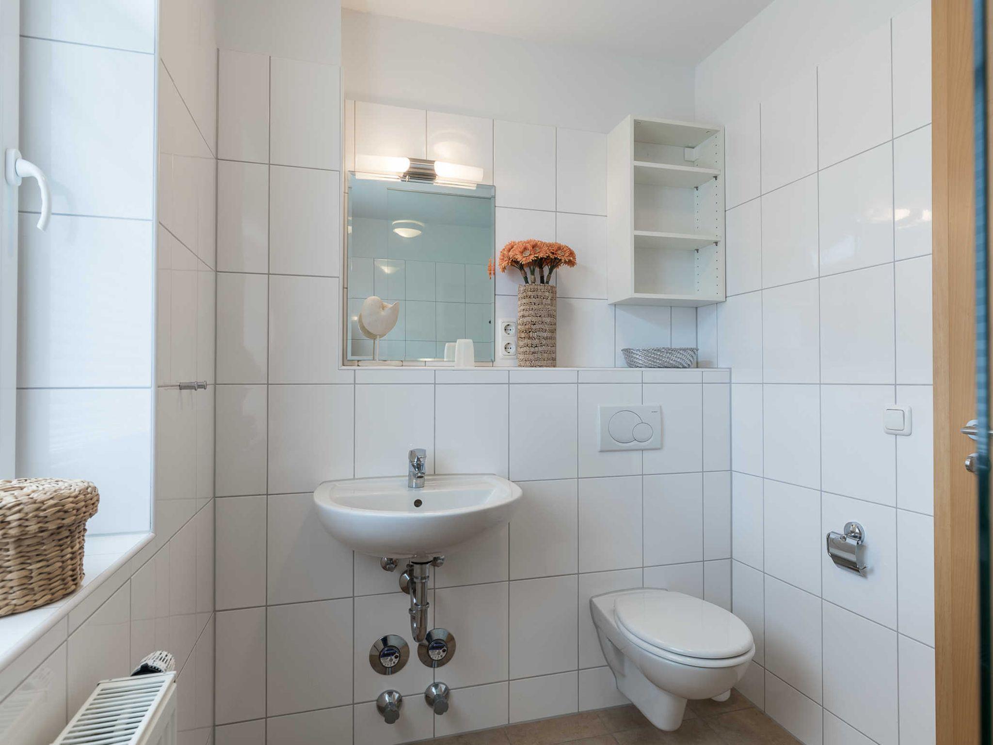Das Badezimmer mit WC und einer bodengleichen Dusche sorgt für entspanntes Duschen. Ein zusätzliches Gäste-WC erleichtert den Aufenthalt bei mehreren Personen.