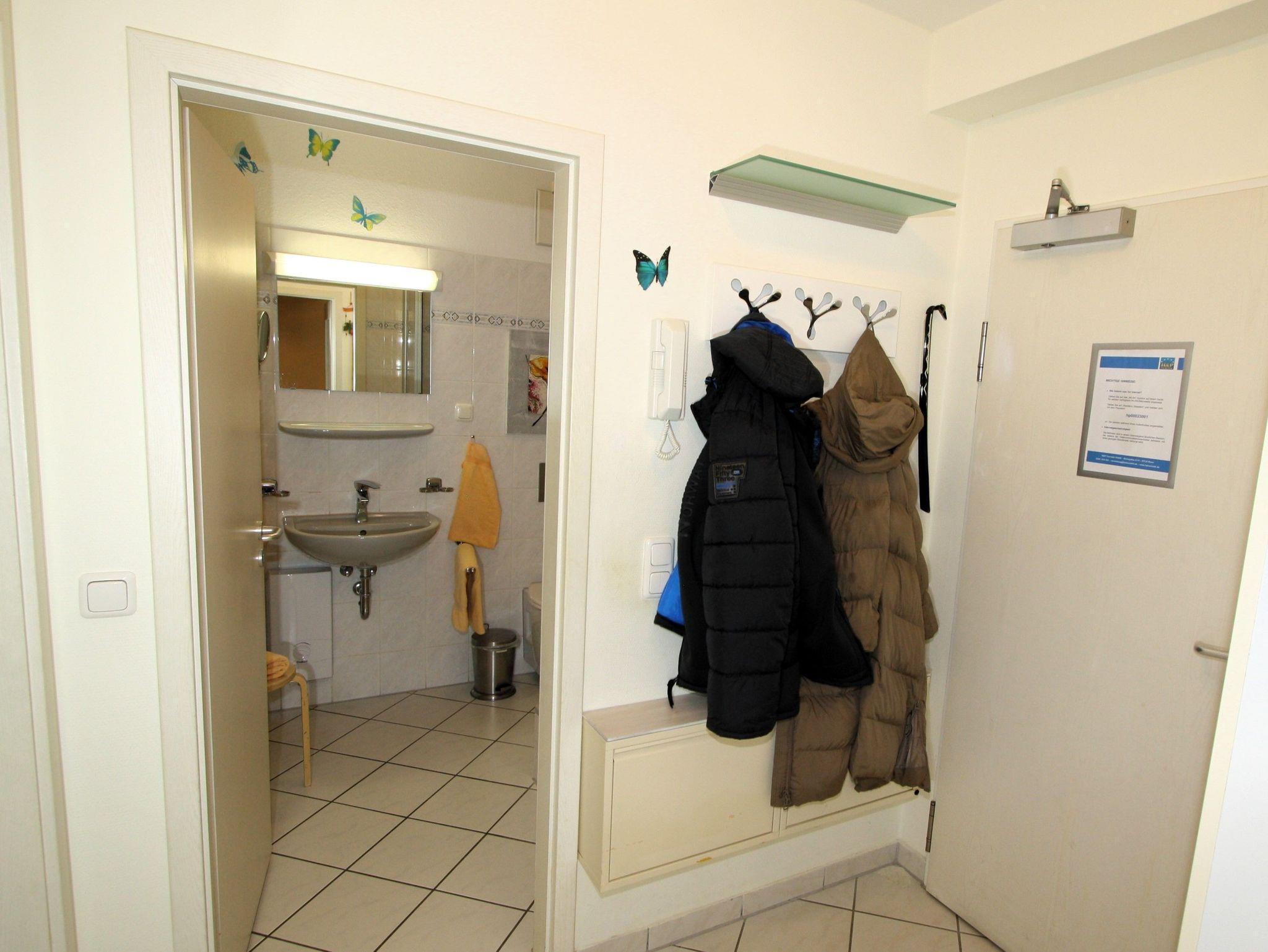 Das Bad mit Dusche und dem um 5 cm über Standartmaß erhöhten WC ist über den Flur von jedem Zimmer separat zugänglich.
