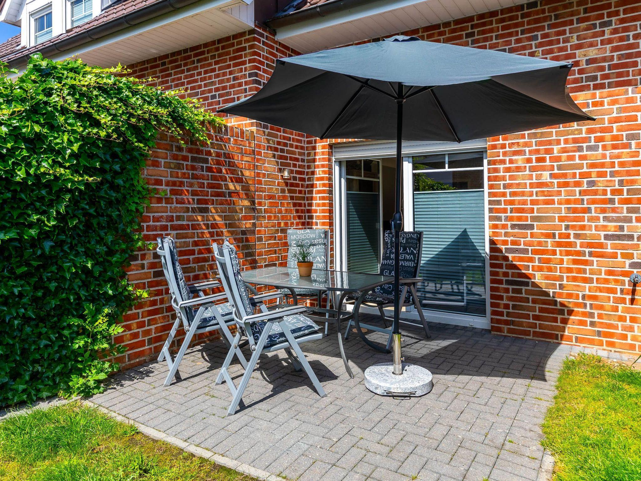 Die Gartenmöbel auf der Südwest-Terrasse sind mit passenden Bezügen ausgestattet, was den Komfort zusätzlich erhöht.