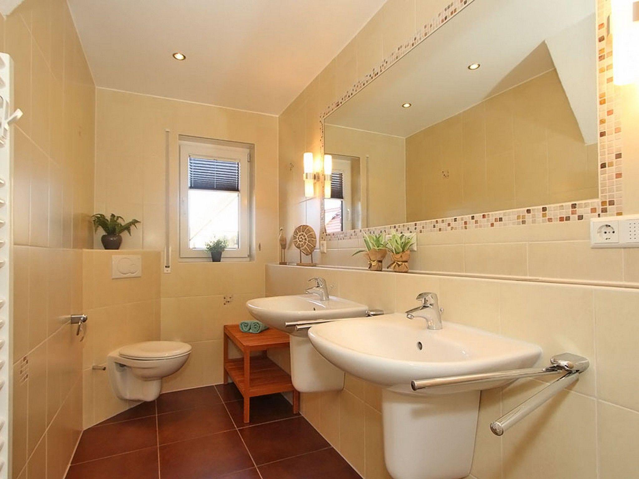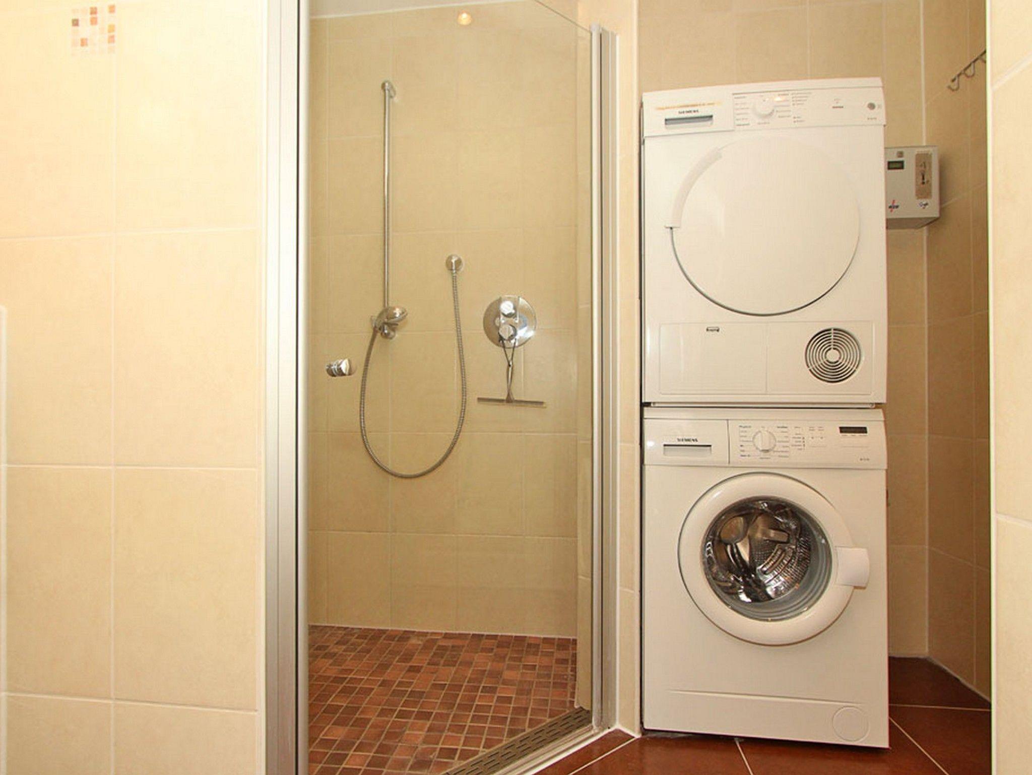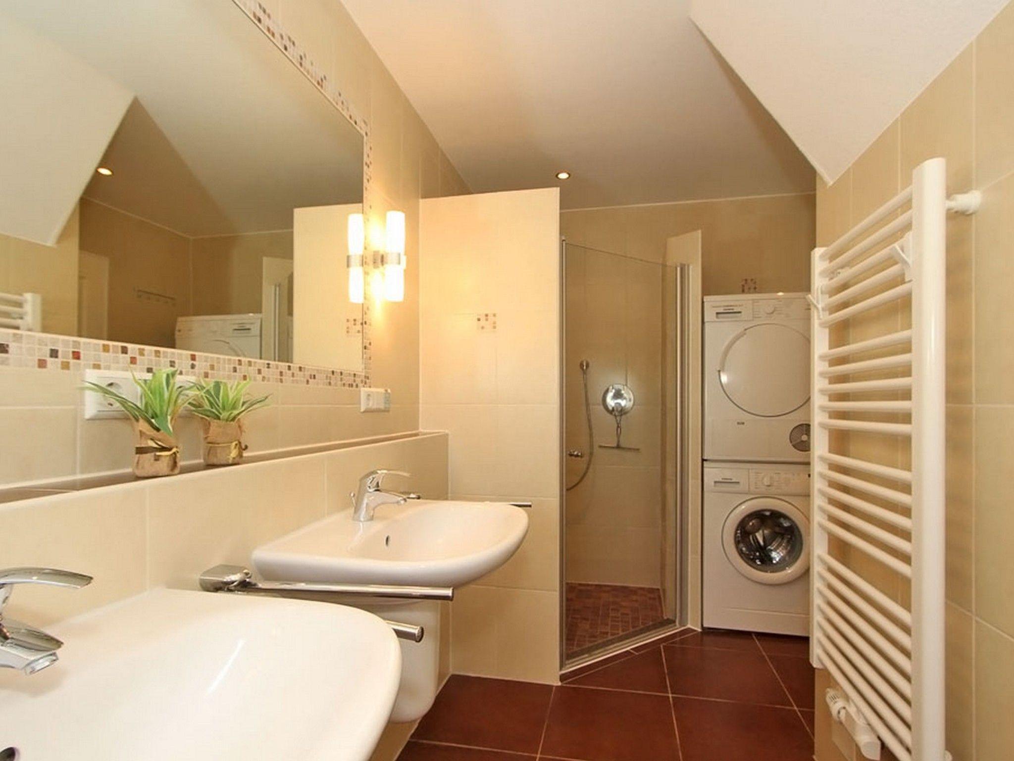 Im Badezimmer gibt es zwei Waschtische, eine Dusche und ein WC. Gegen Gebühr können Sie auch Waschmaschine und Trockner nutzen. Das Fenster im Bad spendet Tageslicht und erleichtert das Lüften, z.B. nach dem Duschen.