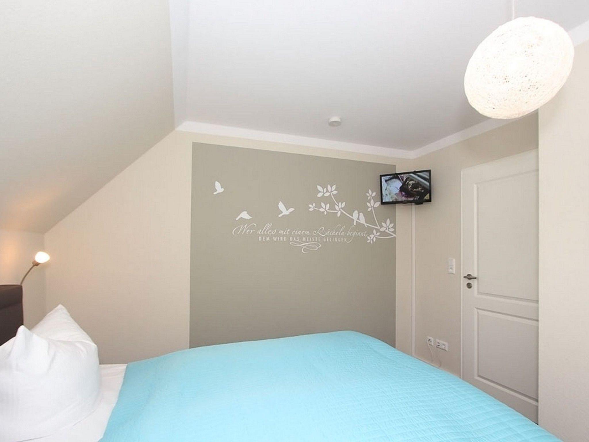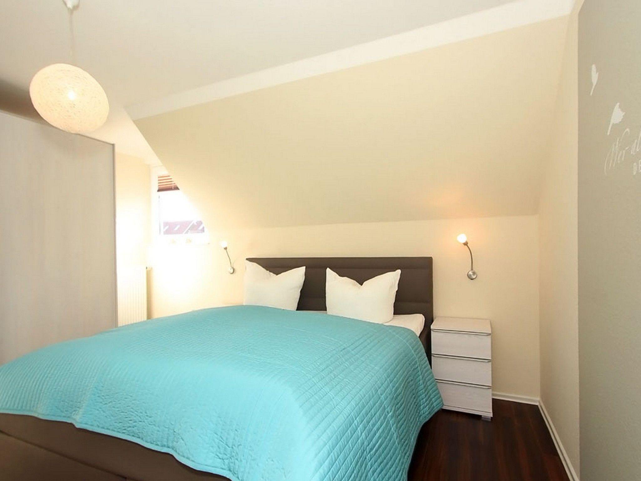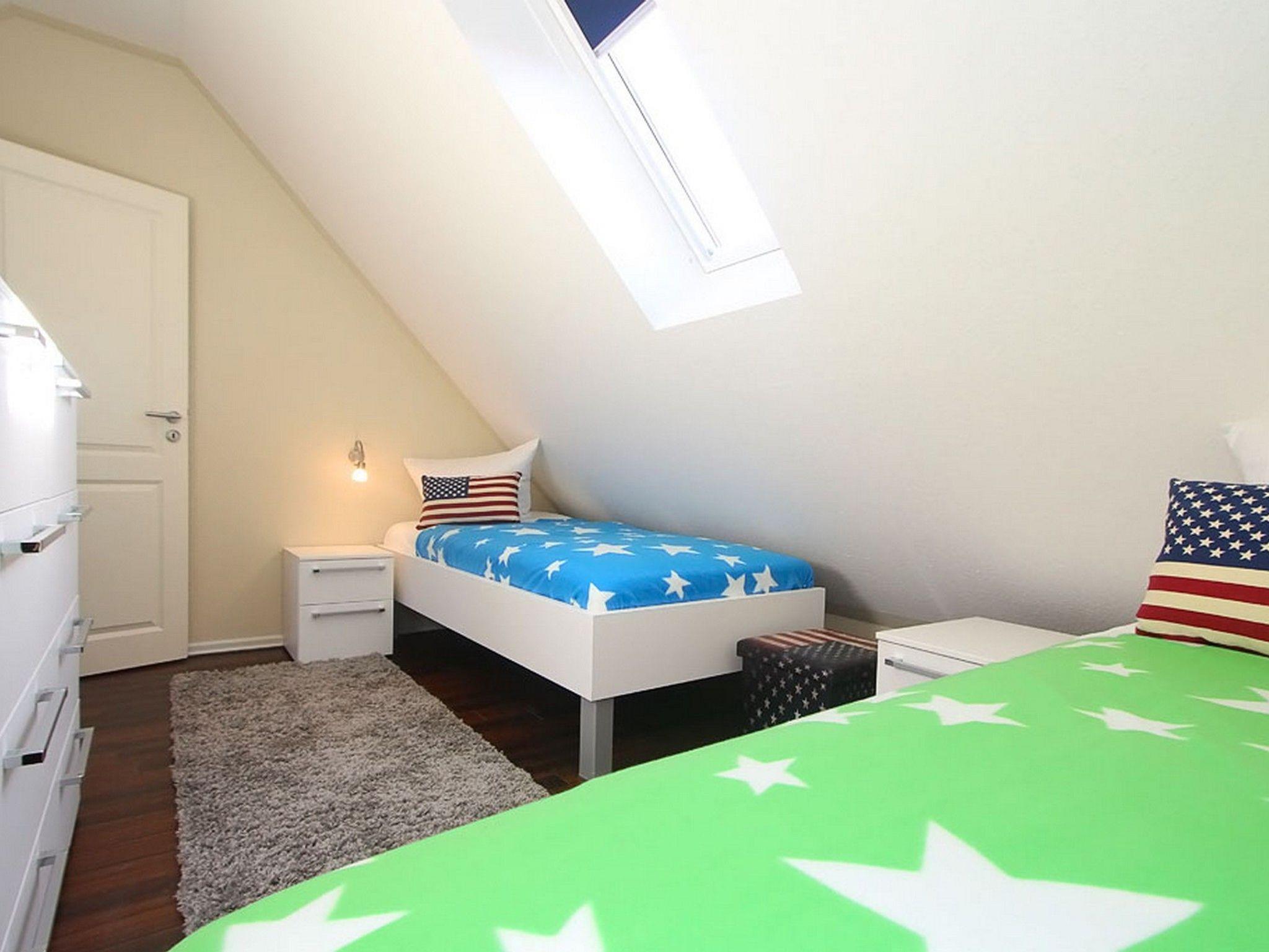 Die dritte Wohnebene, im DG, welche Sie über eine offene Holztreppe mit Treppenschutzgitter (oben) erreichen, ist mit einem weiteren Schlafzimmer mit zwei Einzelbetten (je 90x200cm), einer Kommode und SAT-TV ausgestattet. Ein Reisebettchen könnte hier bei Bedarf auch aufgestellt werden.