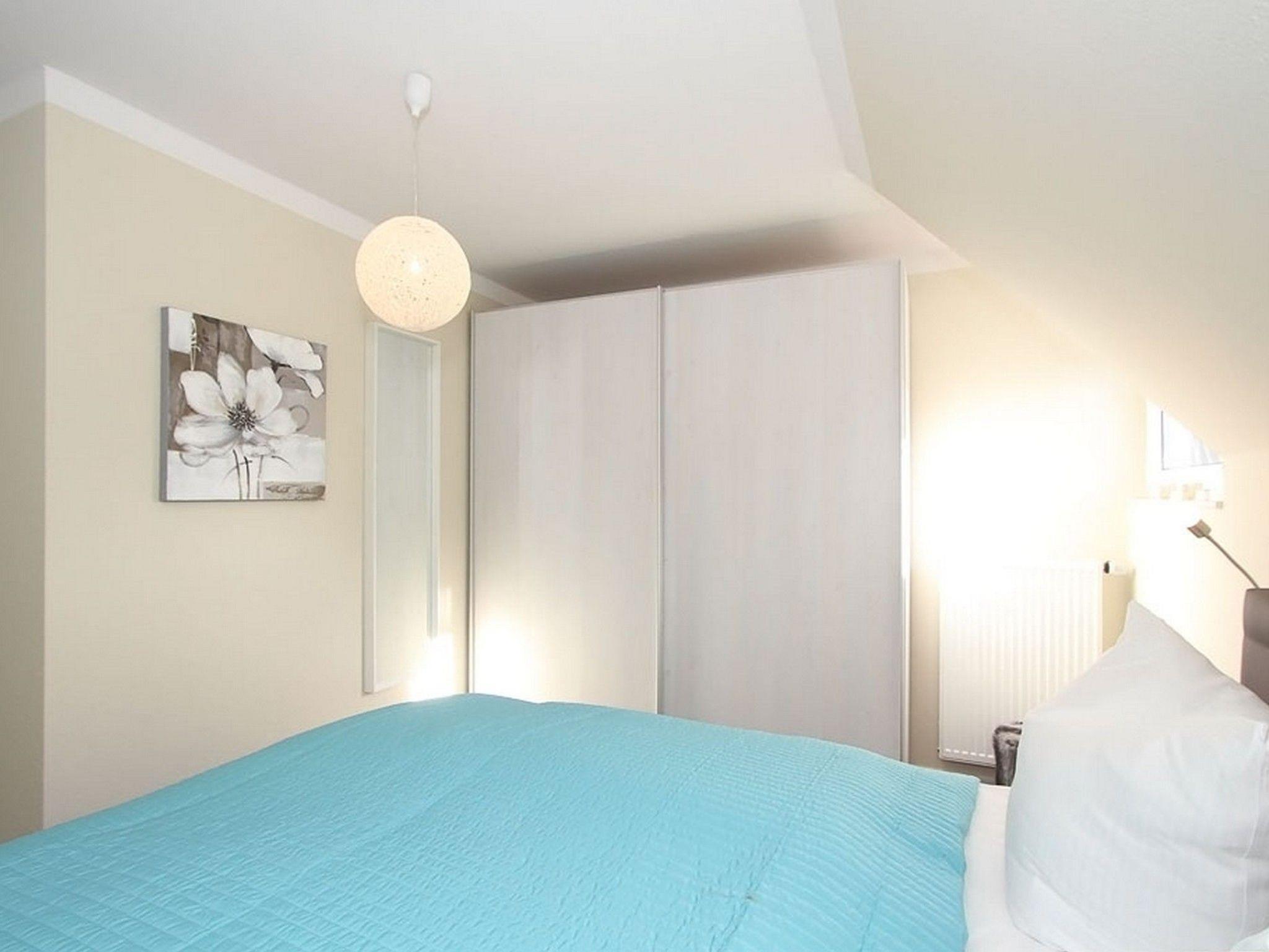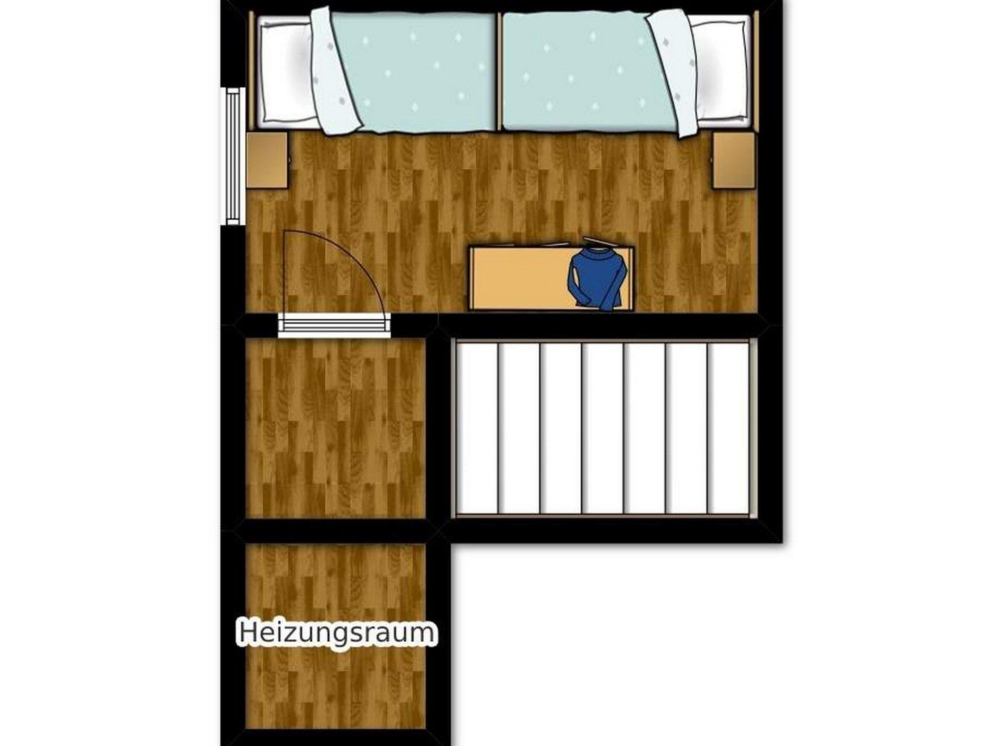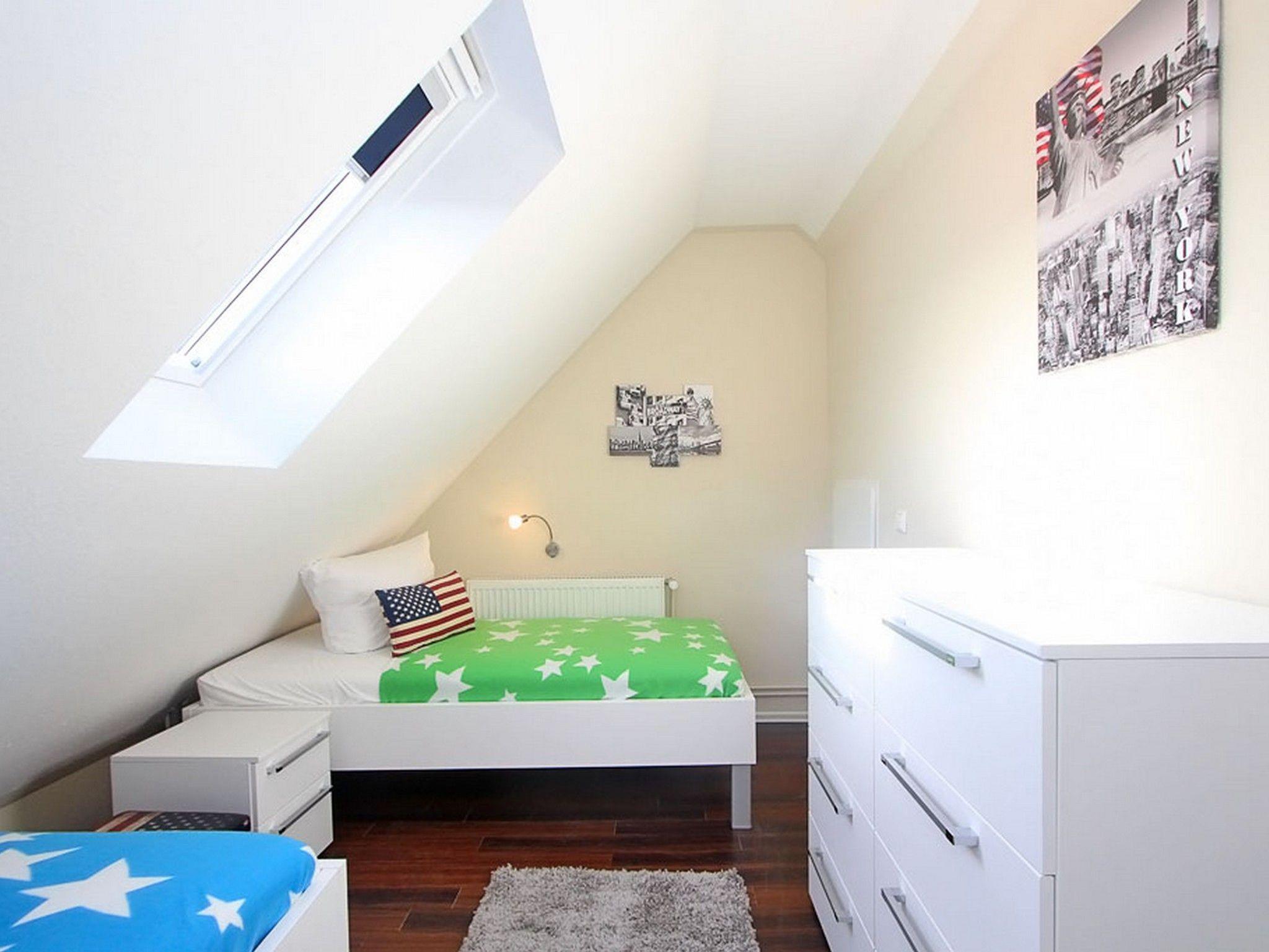 Die dritte Wohnebene, im DG, welche Sie über eine offene Holztreppe mit Treppenschutzgitter (oben) erreichen, ist mit einem weiteren Schlafzimmer mit zwei Einzelbetten (je 90x200cm), einer Kommode und SAT-TV ausgestattet. Ein Reisebettchen könnte hier bei Bedarf auch aufgestellt werden.