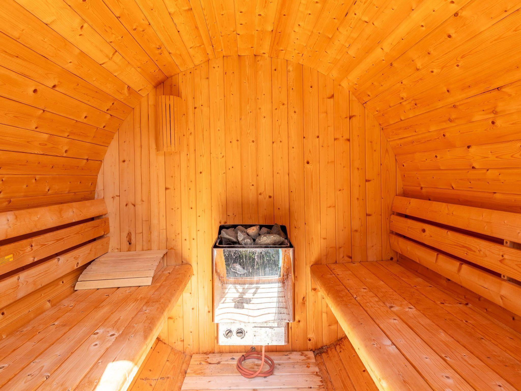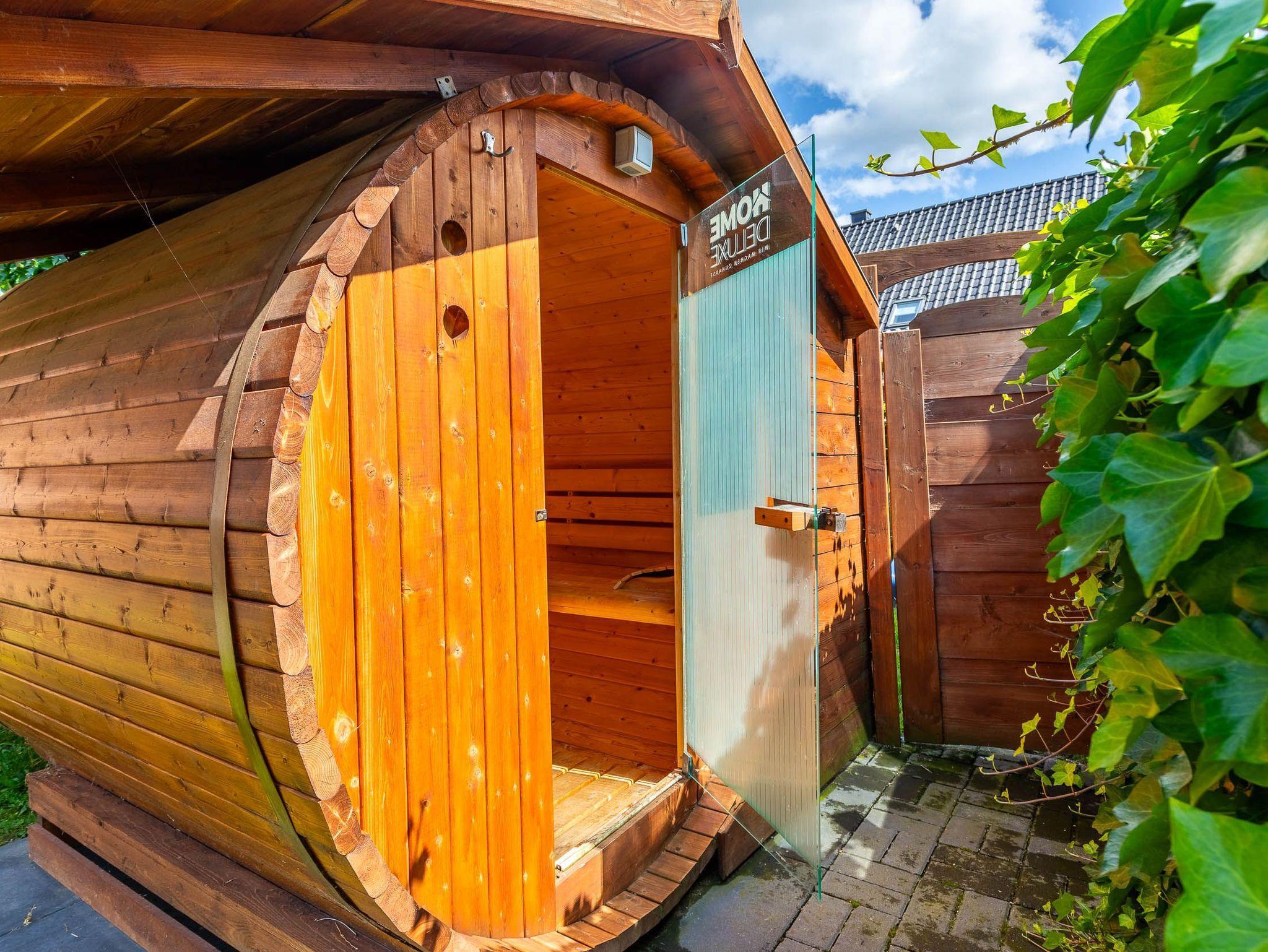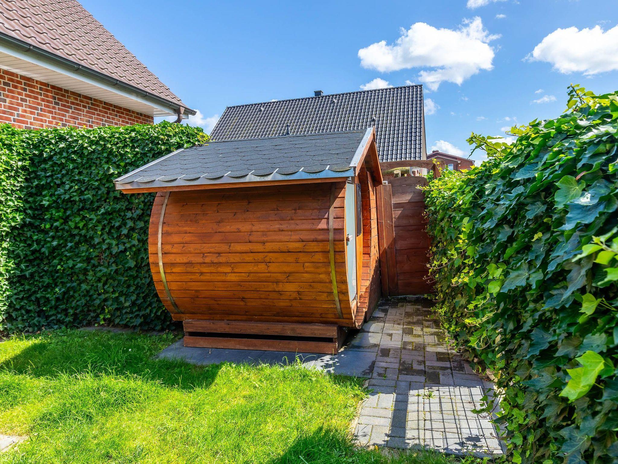 Die Fass-Sauna, welche sich auf dem hauseigenen Grundstück zwischen Haus 1 und 1a befindet, kann sowohl von den Gästen von Haus 1 als auch von den Gäste von Haus 1A kostenfrei genutzt werden. Gleichzeitig trennt die Sauna beide Grundstücke voneinander.