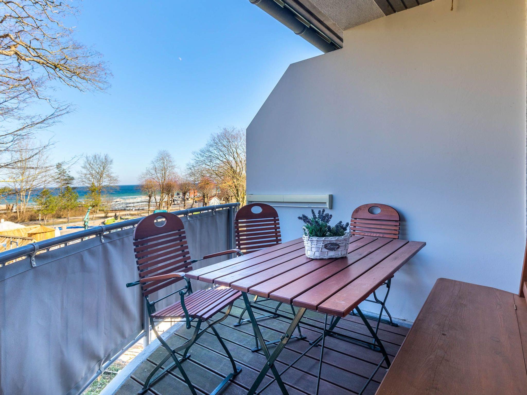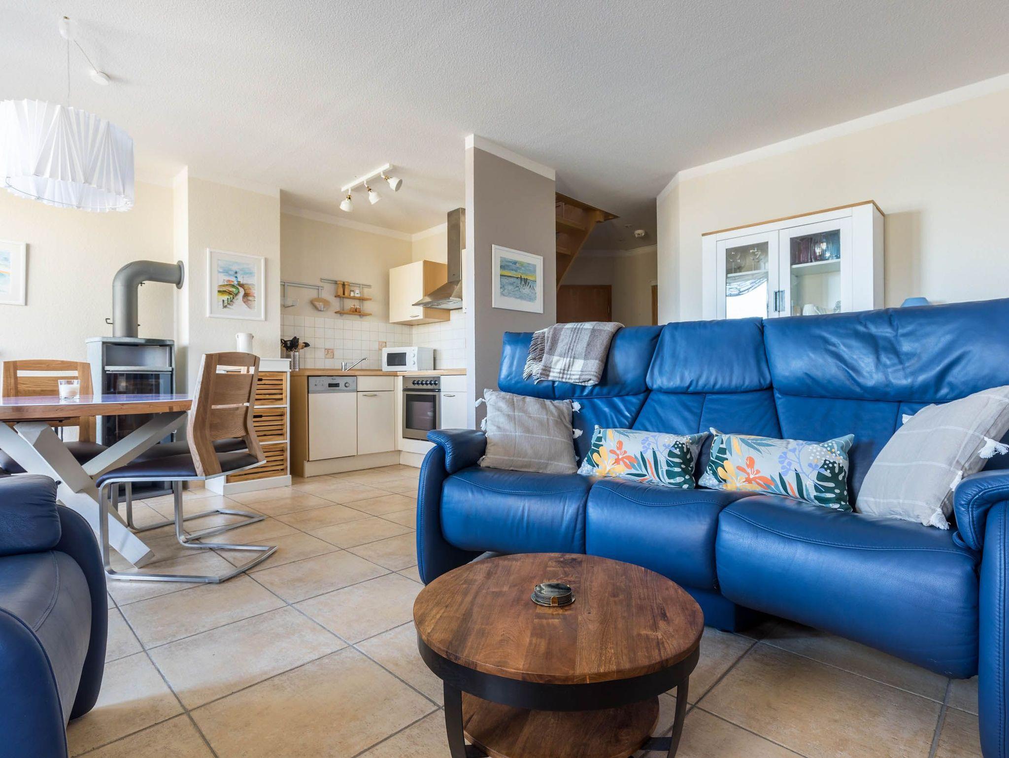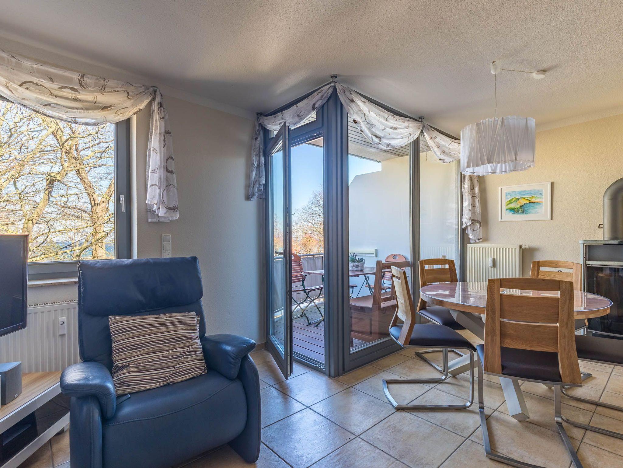 Im Wohnbereich, welches sich in der ersten Wohnebene befindet, sorgen bequeme Ledermöbel für Wohnkomfort, der vorhandene Flatscreen-TV sorgt für die Multimediaunterhaltung. Von hier aus gelangen Sie auf den möblierten Nordost-Balkon mit tollem Ostseeblick (im Frühjahr/ Sommer etwas eingeschränkter durch ein paar Bäume).