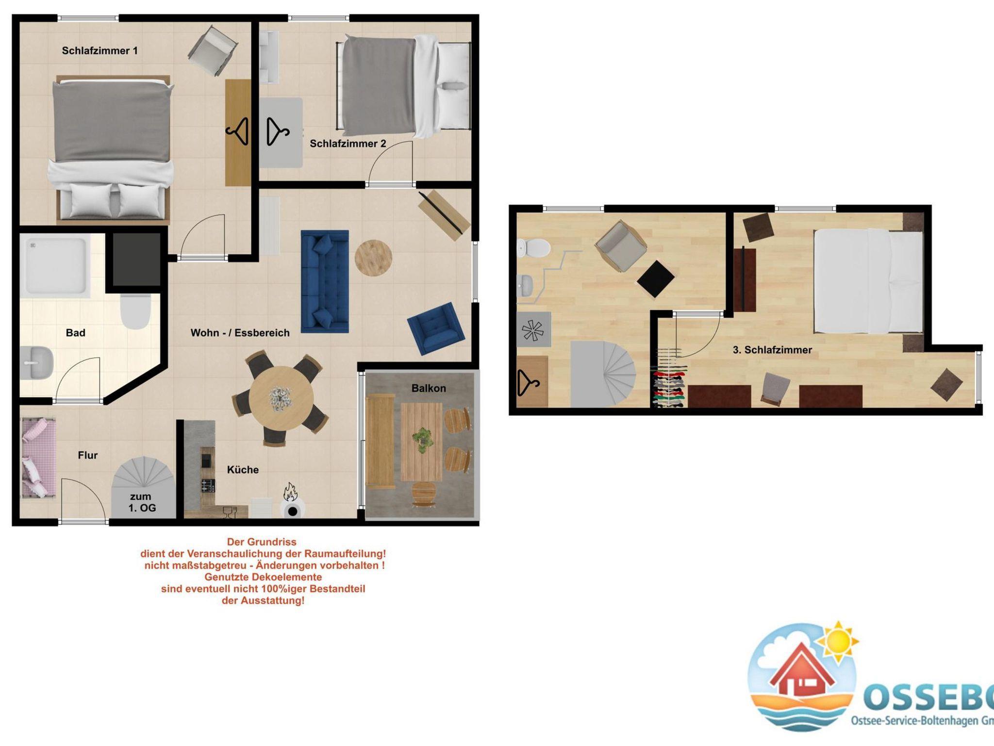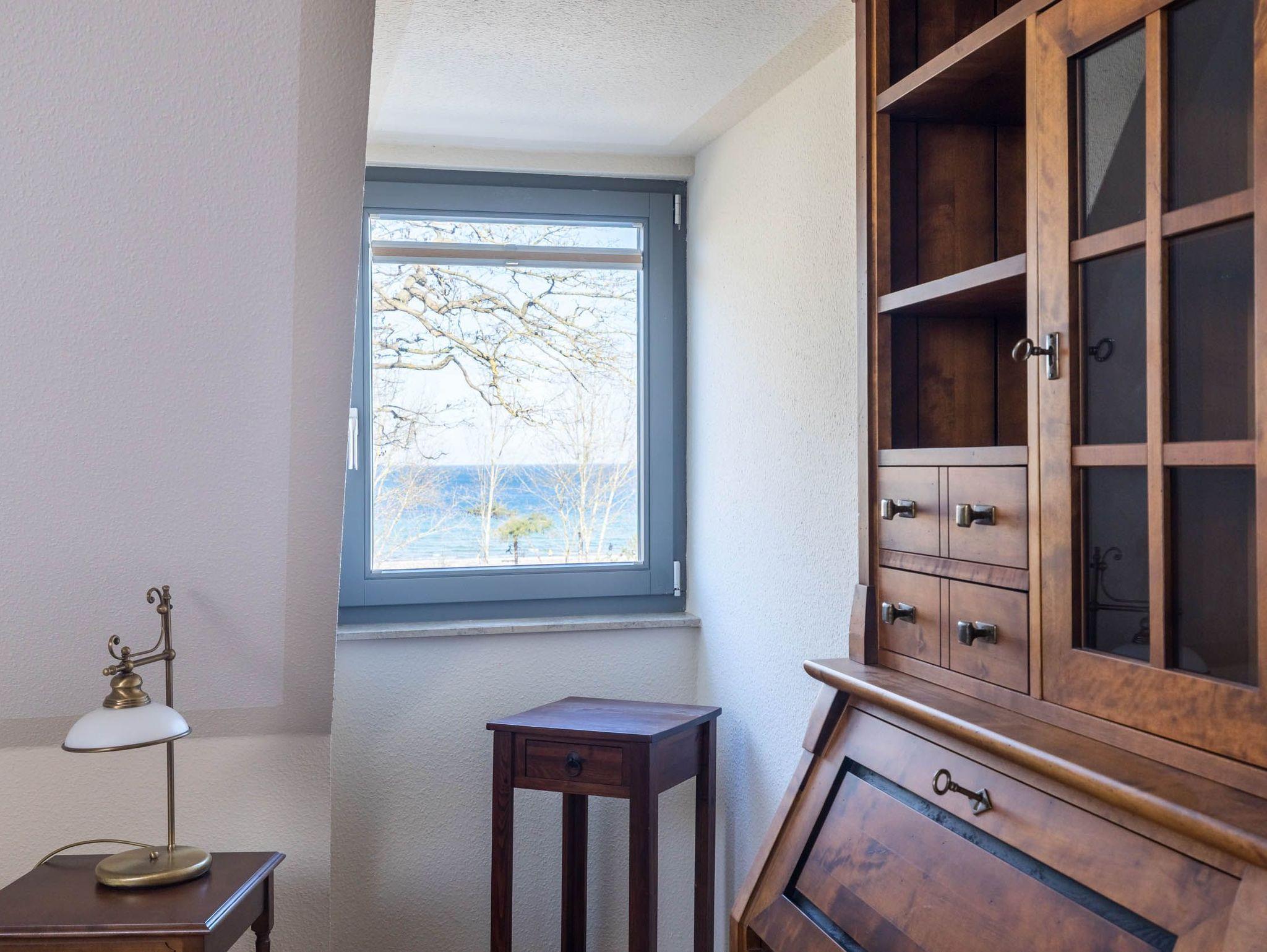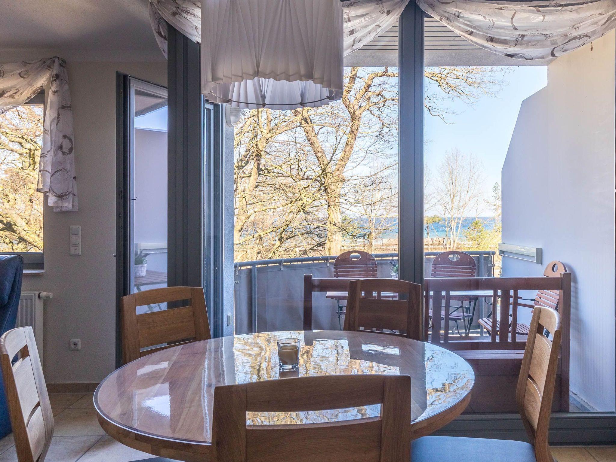 Im Wohnbereich, welches sich in der ersten Wohnebene befindet, sorgen bequeme Ledermöbel für Wohnkomfort, der vorhandene Flatscreen-TV sorgt für die Multimediaunterhaltung. Von hier aus gelangen Sie auf den möblierten Nordost-Balkon mit tollem Ostseeblick (im Frühjahr/ Sommer etwas eingeschränkter durch ein paar Bäume).