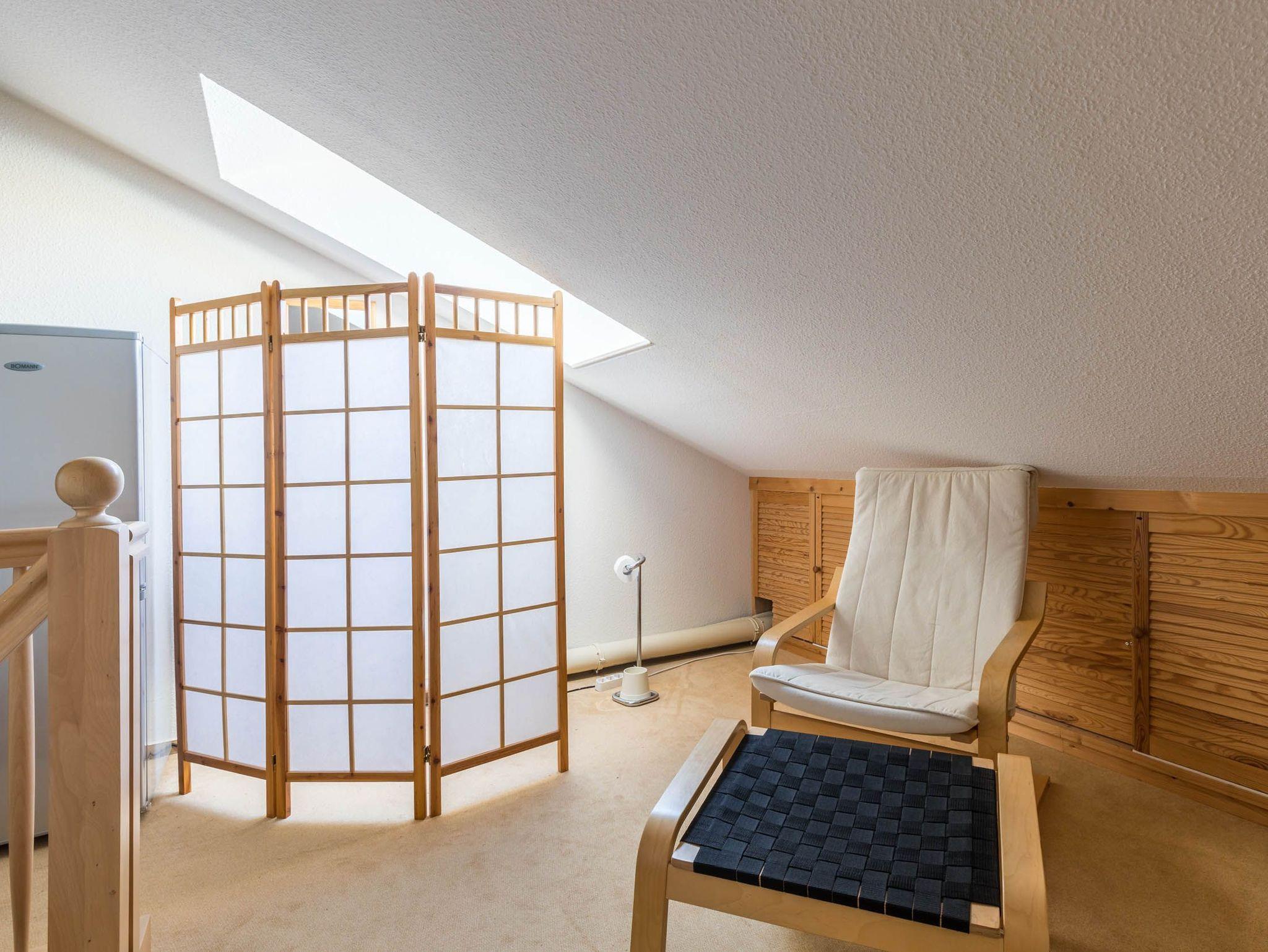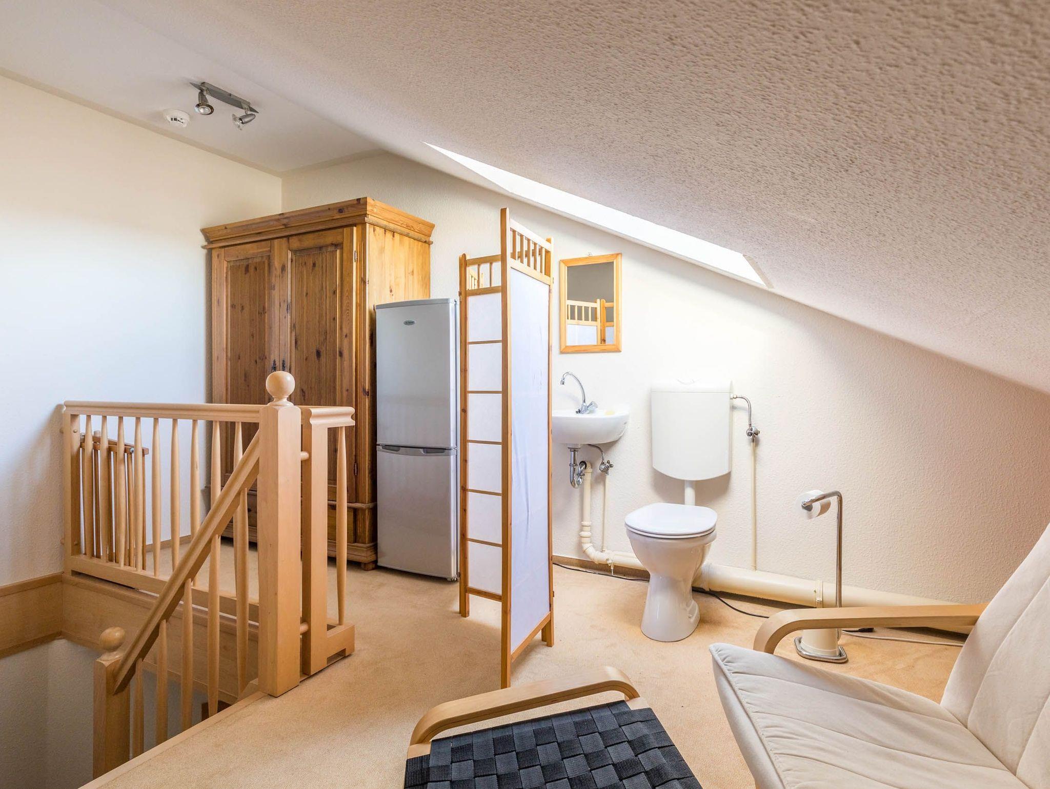Das Dachgeschoss als zweite Wohnebene empfängt Sie mit einem kleinen Vorraum als Galerie. Hier steht ein Kleiderschrank, ein Kühlschrank mit Gefrierfach und hinter dem Paravent ein zusätzliches Gäste-WC. Oder Sie nutzen die Galerie zum Abschalten und relaxen auf dem Sessel.