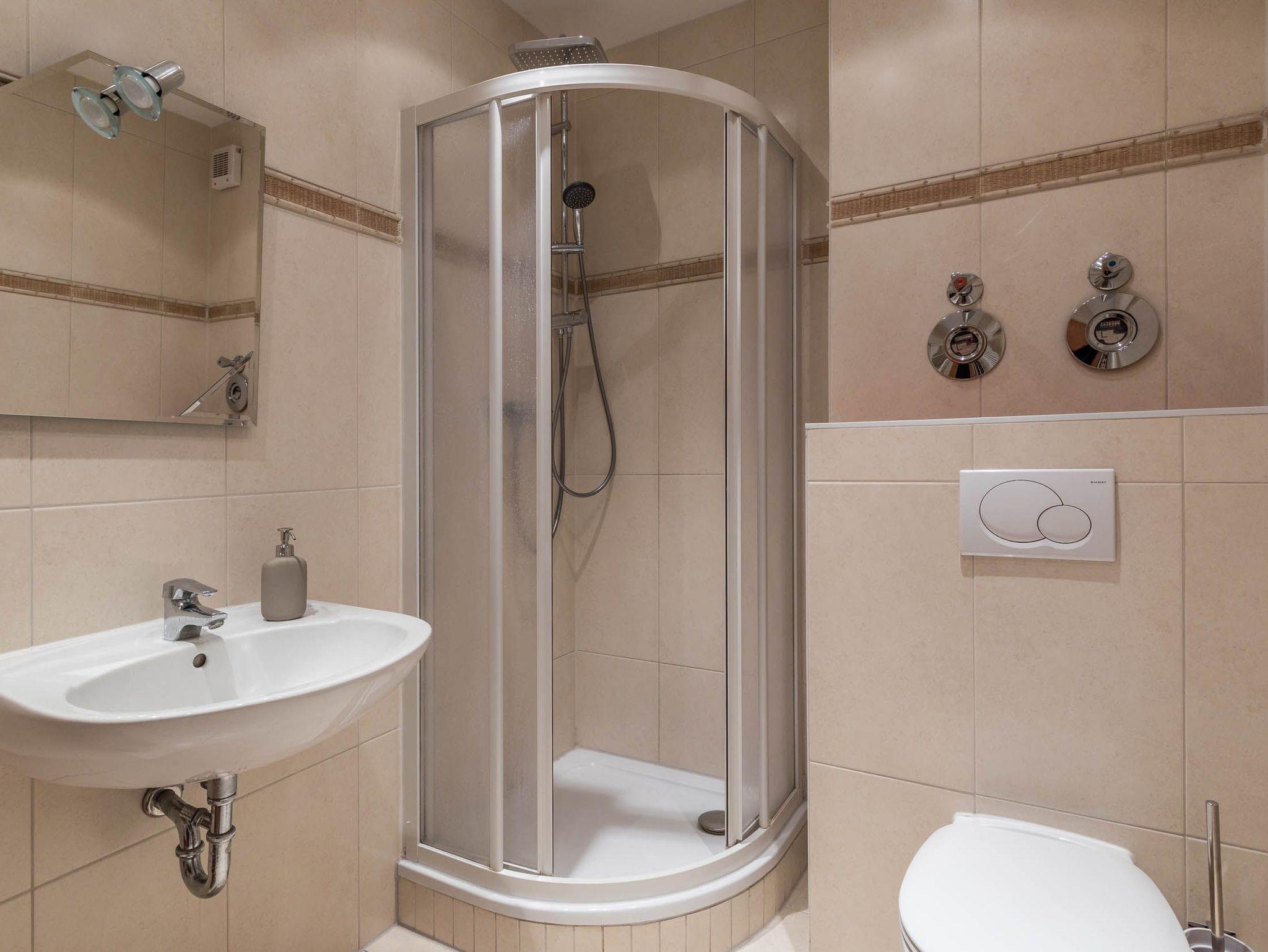 Auch das hell geflieste Badezimmer liegt in der ersten Etage. Hier finden Sie eine Dusche und das WC vor. Wärmen Sie Ihre Duschtücher gern an der elektrischen Handtuchheizung.