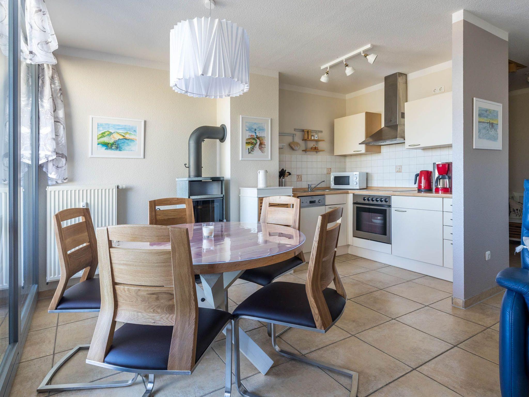 In der offenen Wohnküche finden Sie u.a. einen Backofen mit Cerankochfeld, einen Geschirrspüler, Mikrowelle, einen Kühlschrank mit Gefrierfach, einen Wasserkocher, einen Toaster sowie eine Kaffeemaschine. Der Esstisch mit passenden Stühlen sorgt für Wohlfühlatmosphäre.