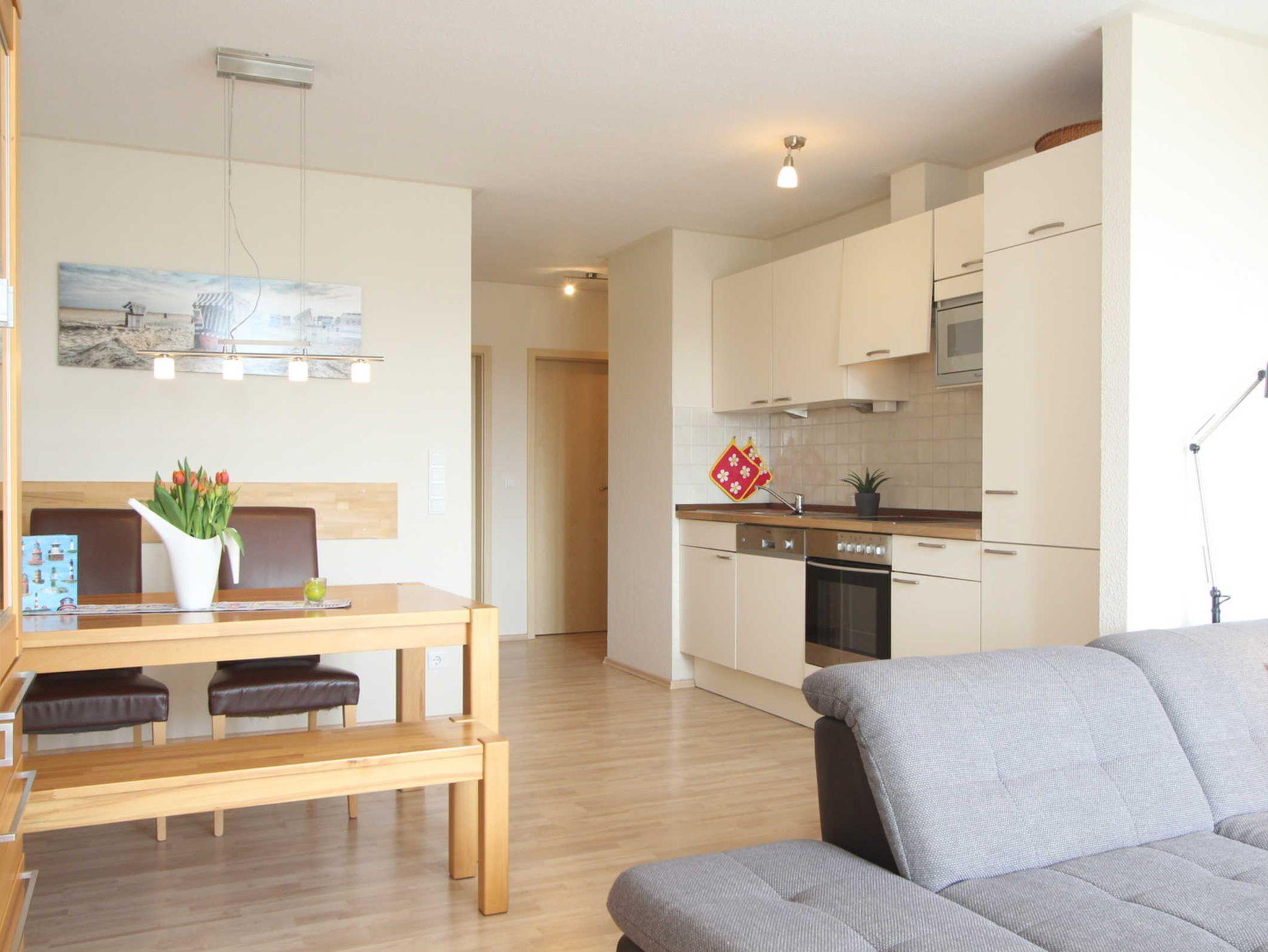 Die offene Küchenzeile ist mit Geschirrspüler, Herd, Backofen und Mikrowelle voll ausgestattet. An der separaten Essecke können Sie bequem Ihre Mahlzeiten einnehmen.