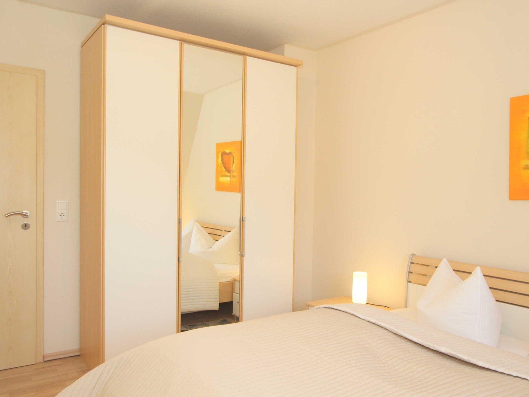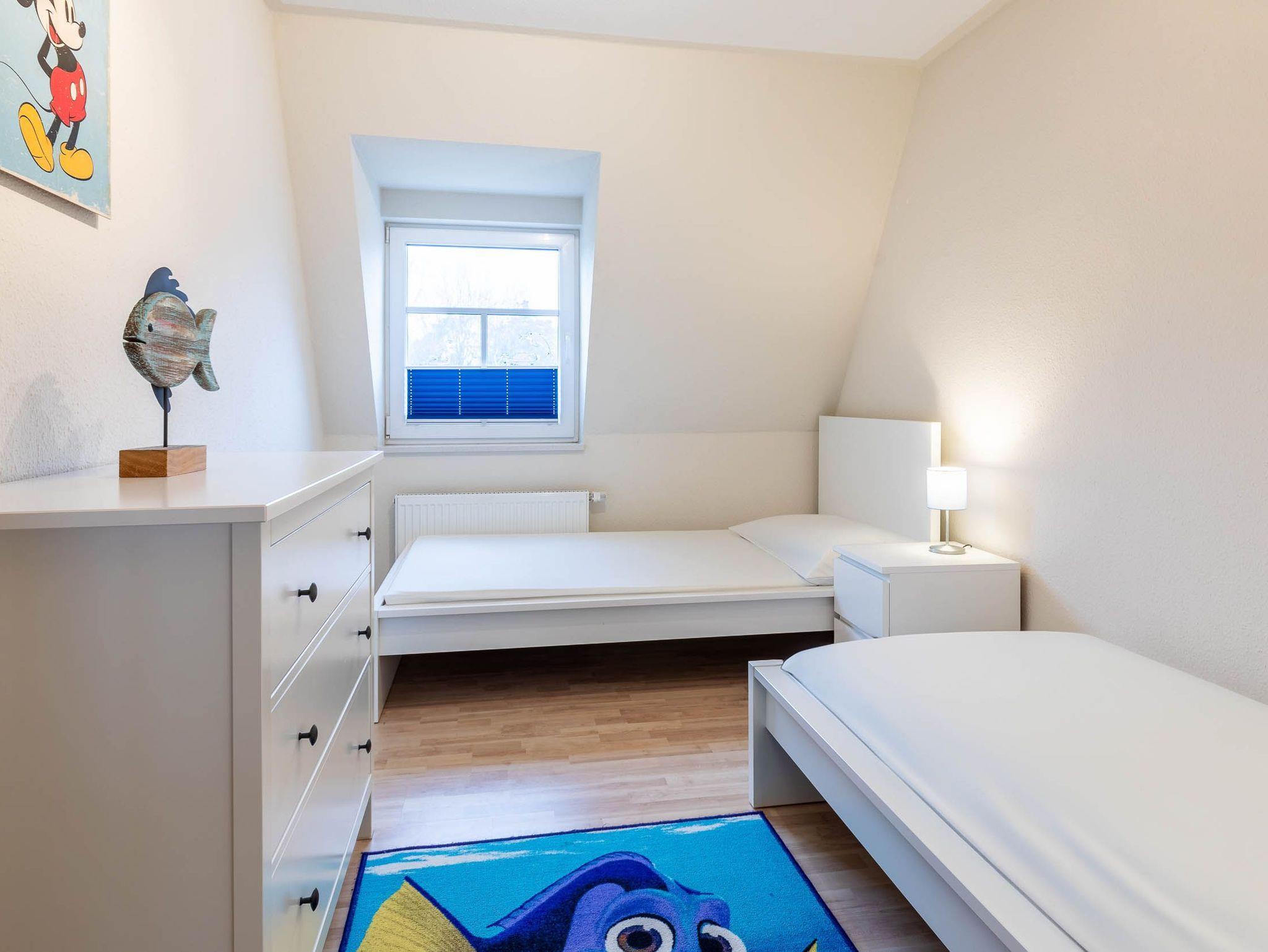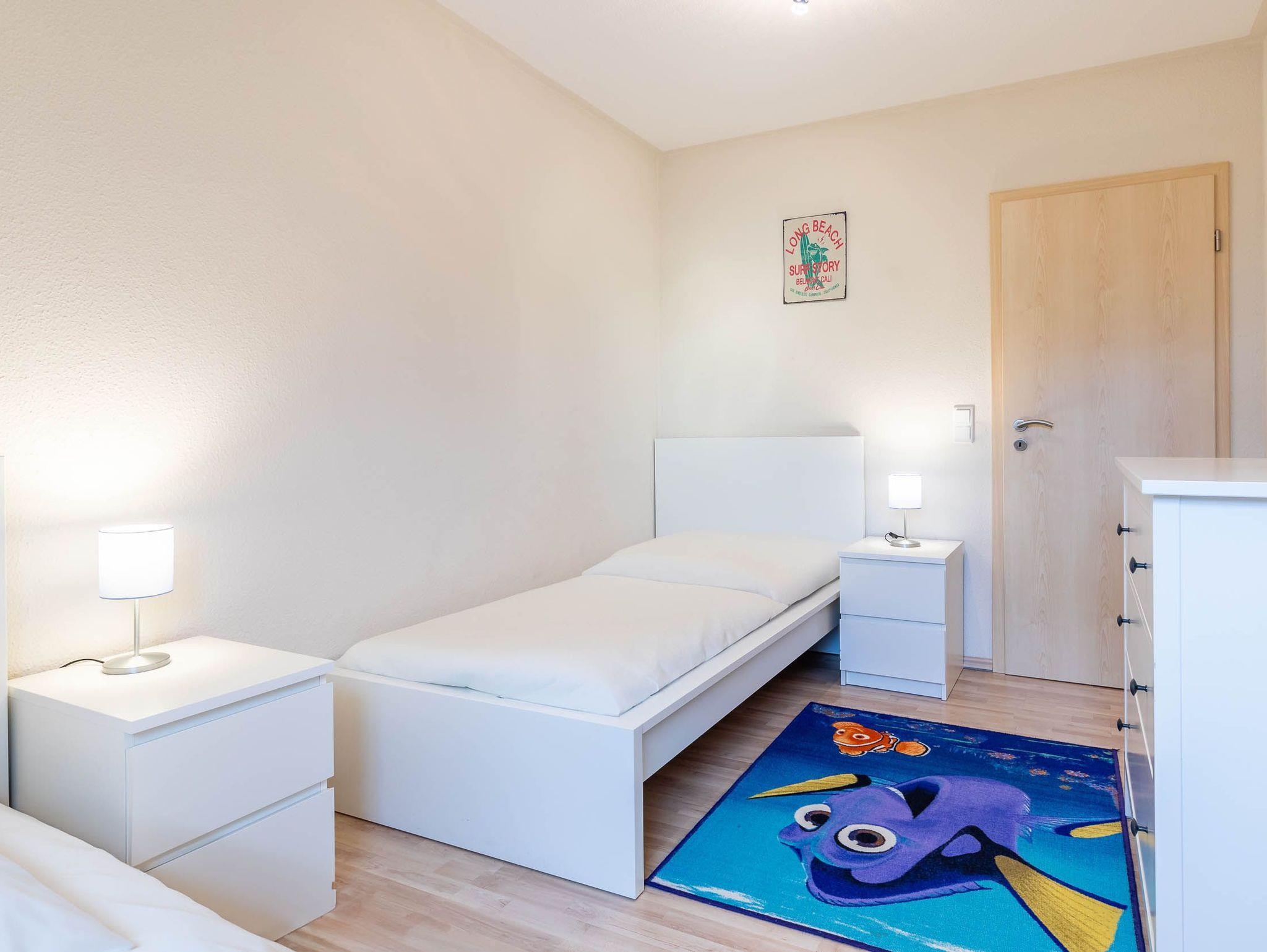 Durch zwei Schlafzimmer, eines mit Doppelbett und Kleiderschrank und eins mit zwei Einzelbetten und Kommode, bietet die Wohnung eine ideale Schlafaufteilung für Familien.