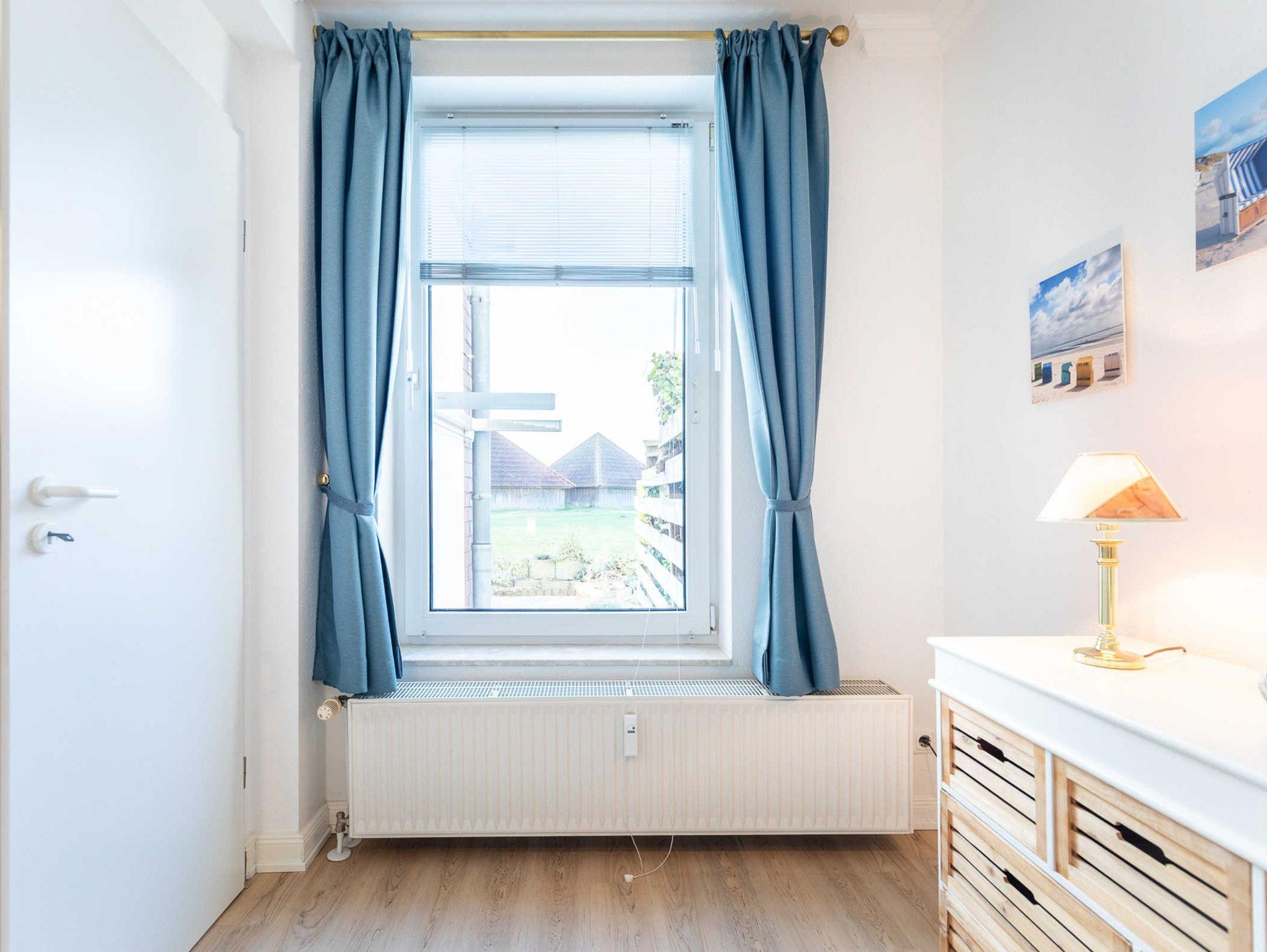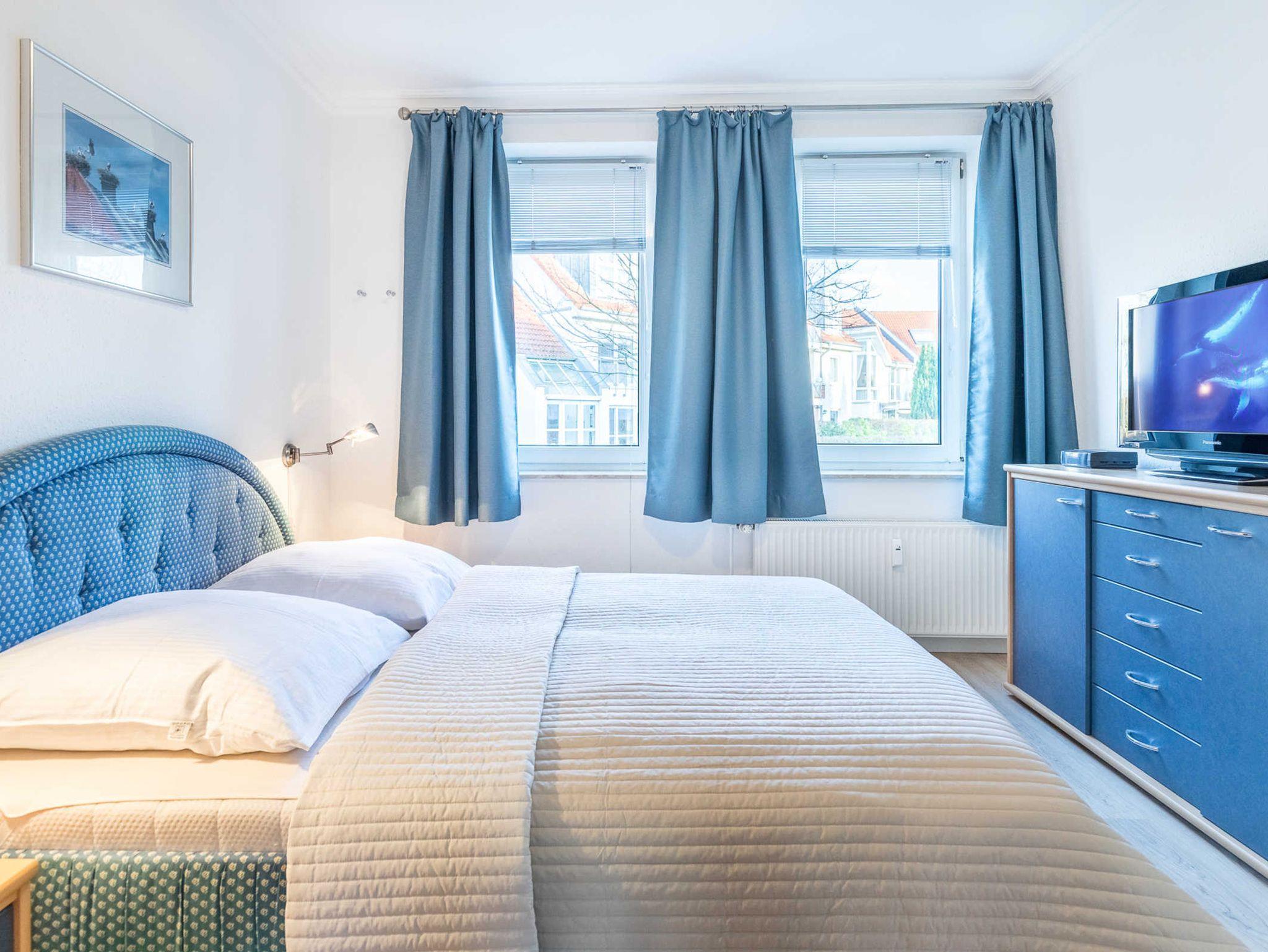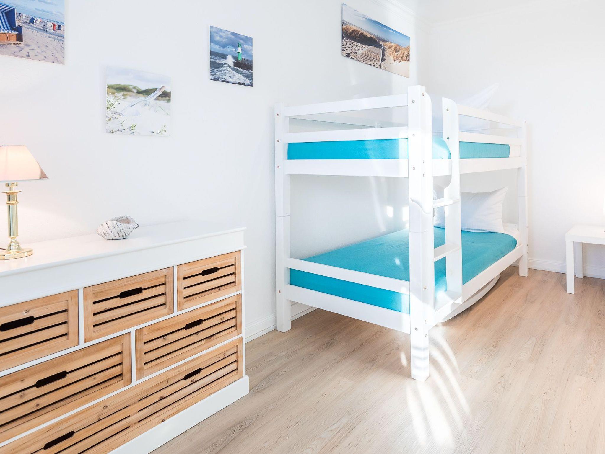 Die Wohnung bietet ein Schlafzimmer mit Doppelbett (160 x 200cm), einem großem Kleiderschrank und eigenem TV sowie ein Gäste-/ Kinderzimmer mit einem Etagenbett (je 80 x 200cm) mit einer Kommode.