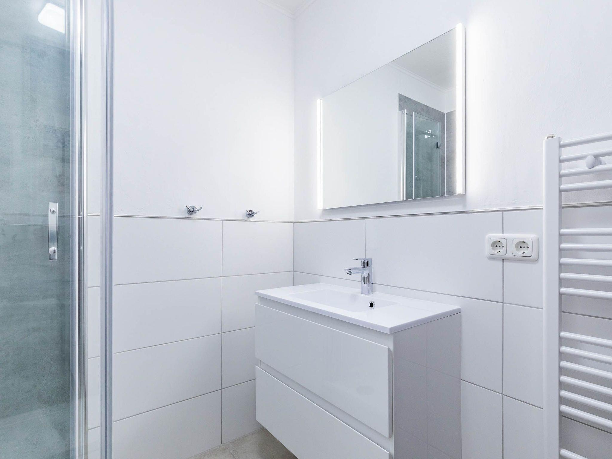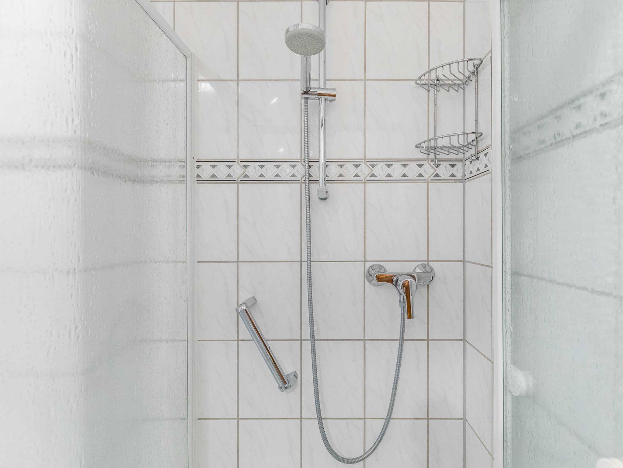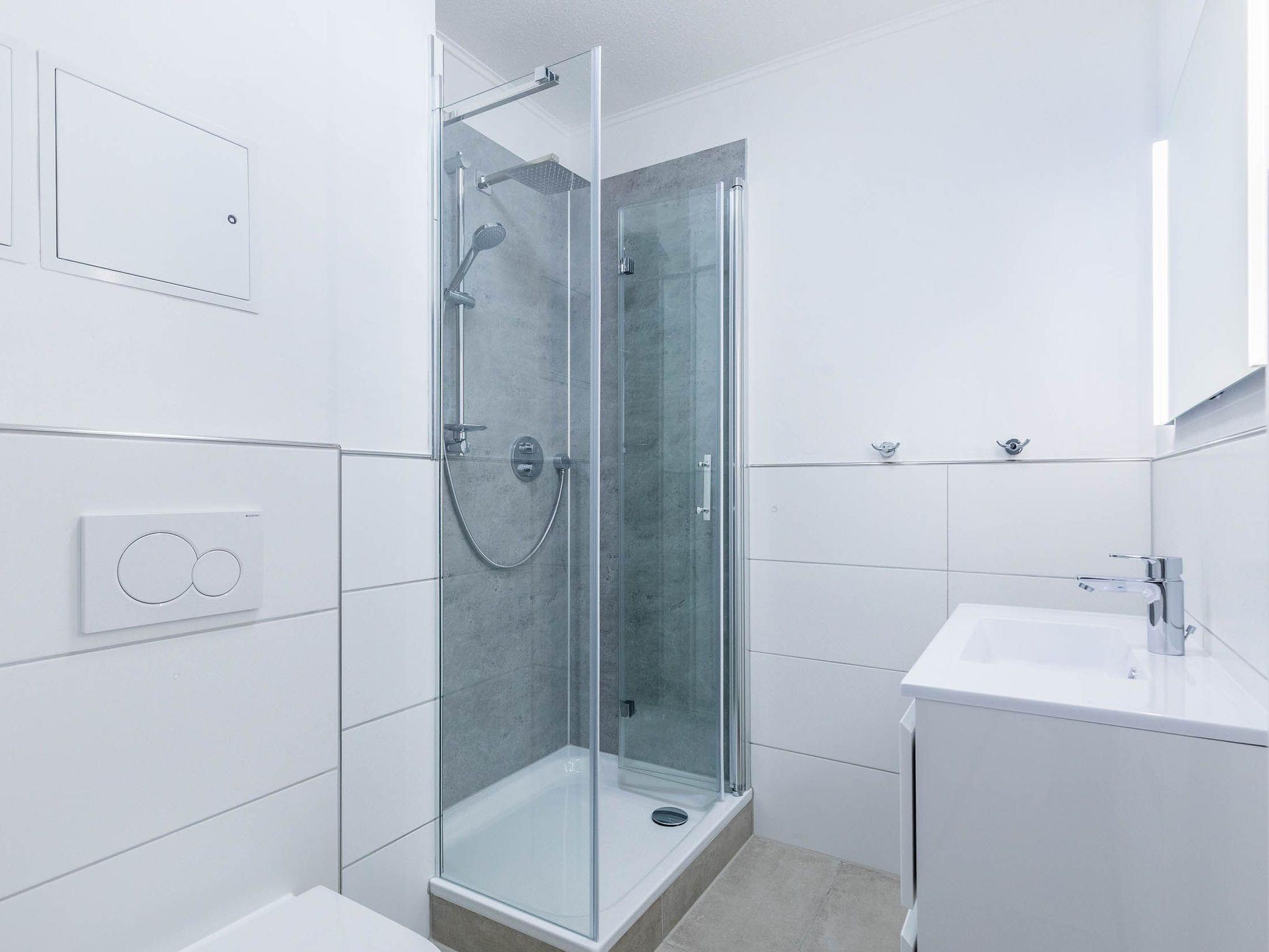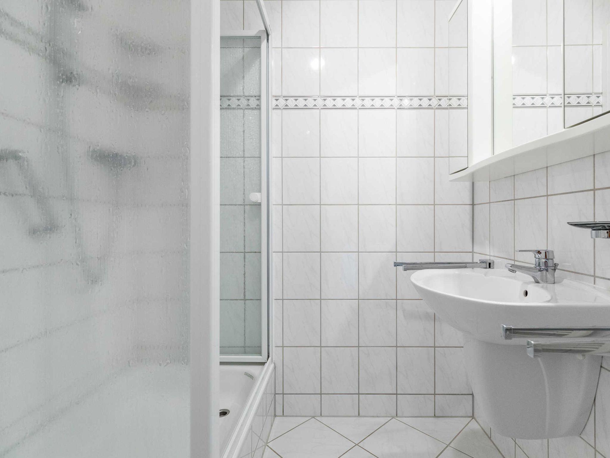 Das Bad ist mit Dusche, Waschbecken und WC ausgestattet.