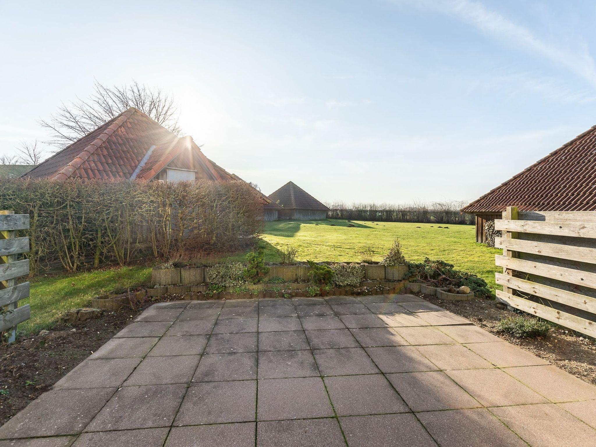 Die Terrasse mit Gartenmöbel und einer Markise runden die Ausstattung ab. Der Blick ins Grüne lädt hier zum Verweilen ein.