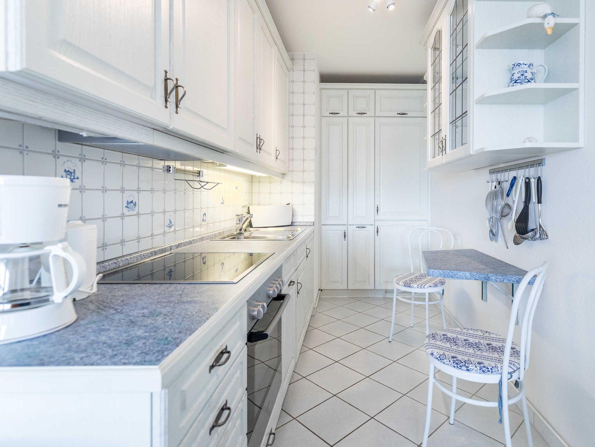 Die angrenzende Einbauküche mit Geschirrspüler bietet genügend Ausstattung zum Kochen. Am Esstisch können 4 Gäste bequem speisen oder einfach beisammen sitzen. In der Küchenzeile befindet sich weiterhin eine Waschmaschine, welche Sie kostenlos nutzen können.