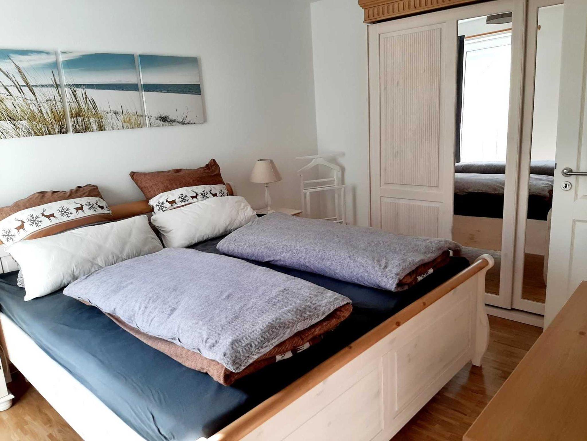 Das separate Schlafzimmer ist mit einem modernen bequemen Bett mit höhenverstellbaren Lattenrosten sowie hochwertigen Federkernmatratzen ausgestattet. Auch hier befindet sich ein Flatscreen-TV-Gerät sowie ein DVD-Player. Ausreichend Staufläche bieten der große Spiegel-Schwebetürenschrank sowie die Kommode. Sowohl vom Wohnzimmer als auch vom Schlafzimmer können Sie den nach Süden ausgerichteten Balkon mit Sonnenschirm betreten.