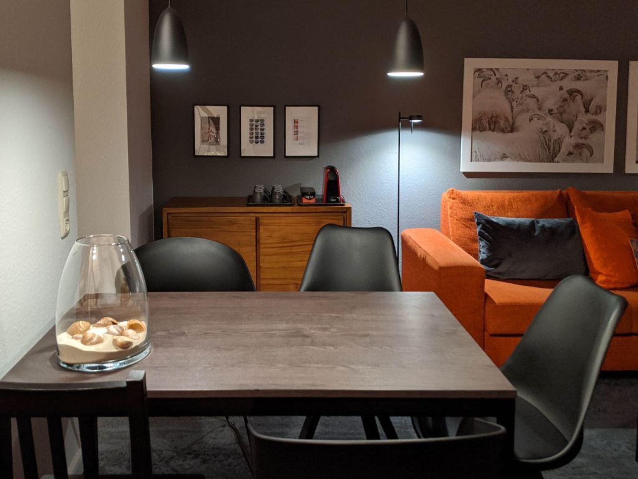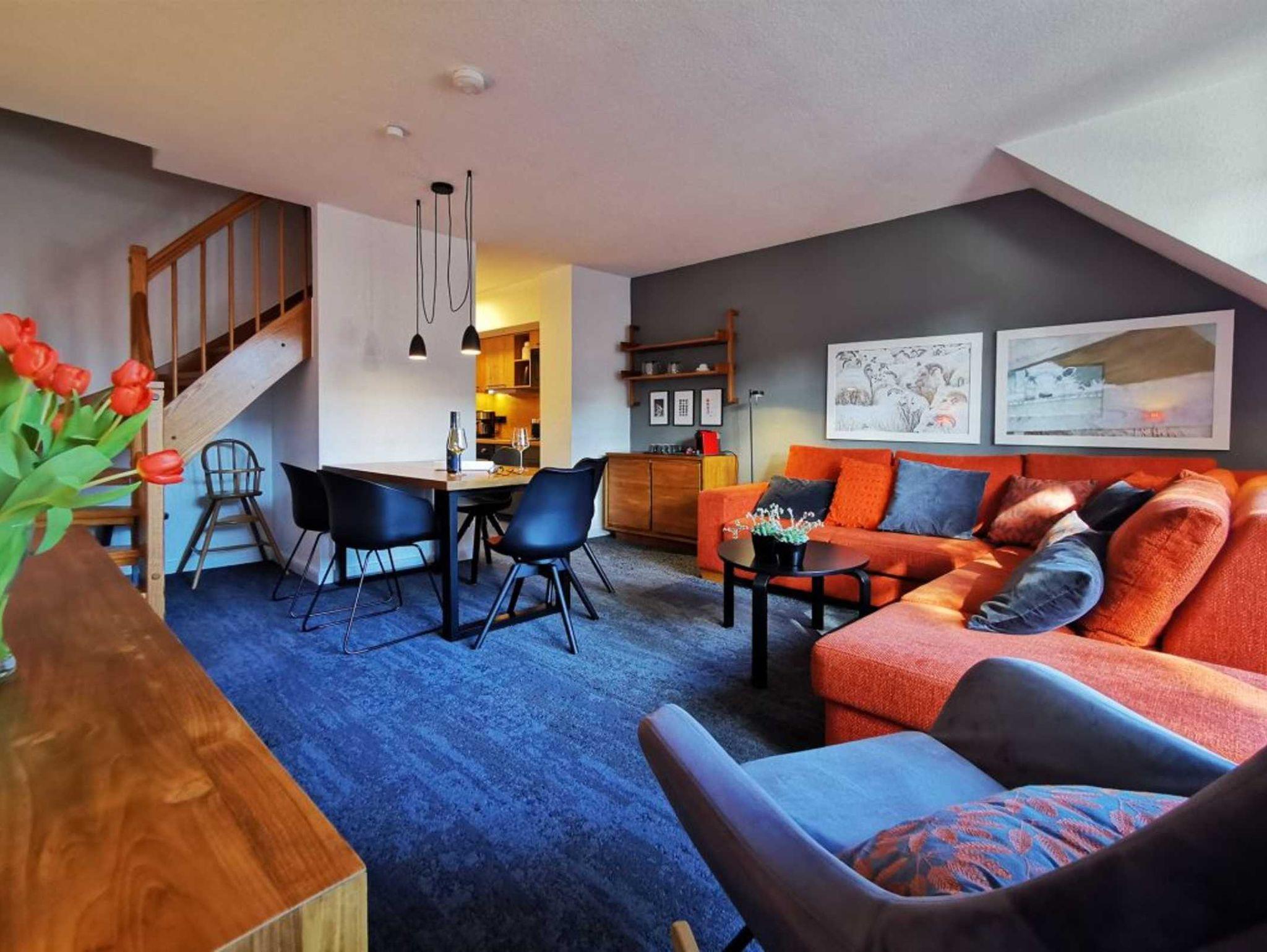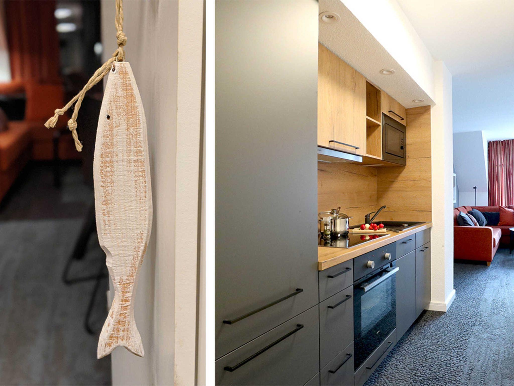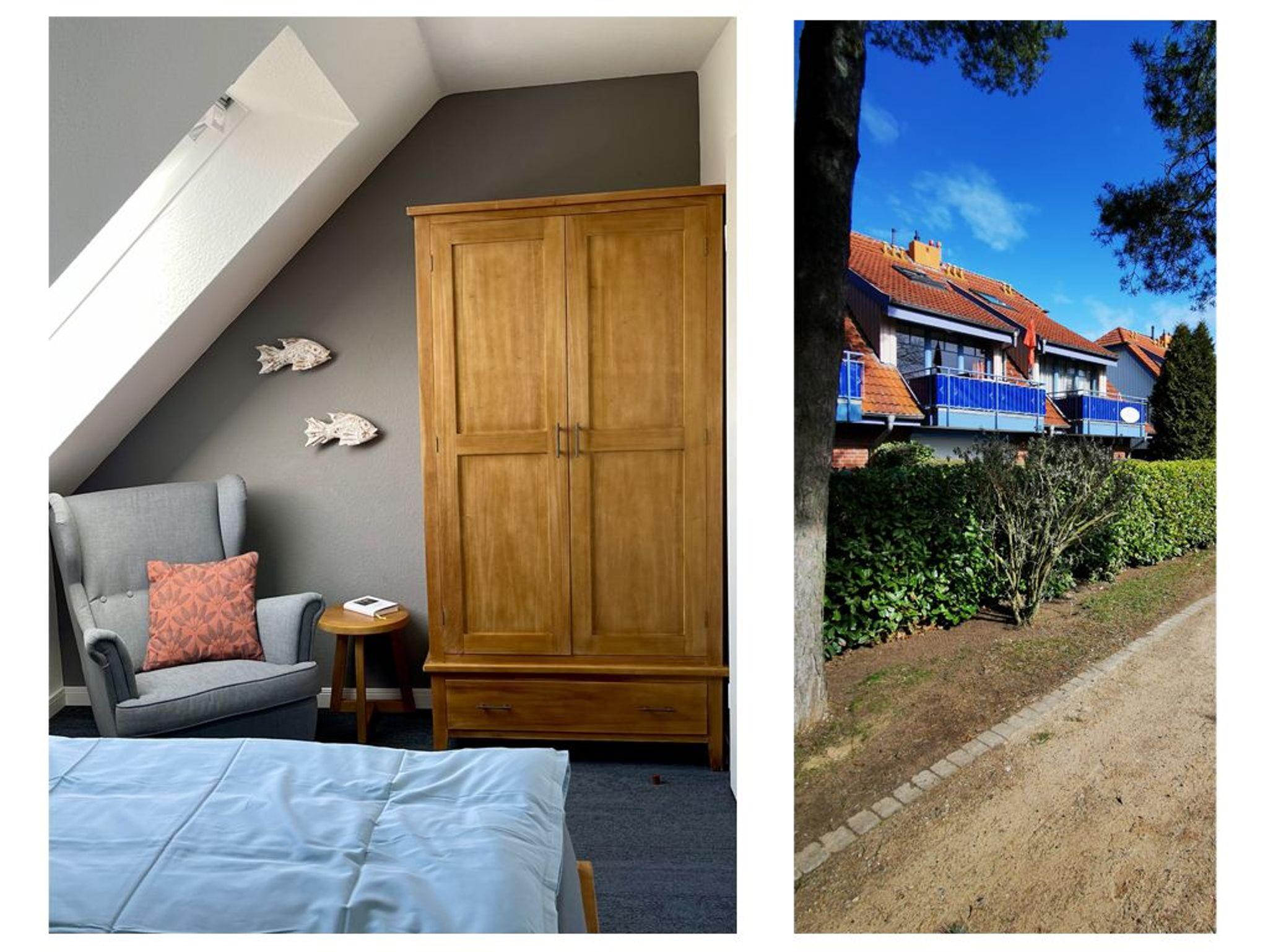 Die 4- Zimmer Maisonetten Ferienwohnung Papillon 12-6 ist ein komfortabel eingerichtetes Appartement mit einer Wohnfläche von 65qm. Eine bequeme Belegung ist mit bis zu 6 Personen möglich. Der großzügige Wohn-/Essbereich ist mit einem Sofa, ausziehbar als Schlafsofa sowie weiteren Sitzmöglichkeiten und einem großen Esstisch möbliert. Ein Fernsehgerät, DVD-Player, Musikanlage und kostenfreie WLAN- Nutzung bieten Abwechslung. Vom Wohnbereich gelangt man auf den saisonal möblierten Süd-Balkon. In der Wohnküche stehen Ceranherd, Backofen, Mikrowelle, Geschirrspüler sowie Kühlschrank mit integr. Gefrierfach, Nespresso-Maschine, Toaster und Wasserkocher bereit. Ihre Mahlzeiten können Sie am Esstisch zu sich nehmen. Zudem befindet sich auf dieser Wohnebene ein separates Schlafzimmer mit zwei Einzelbetten, und Kleiderschrank. Das Duschbad ist mit zwei Waschtischen und WC ausgestattet. Über eine Treppe im Wohnbereich gelangen Sie in die obere Ebene mit zwei weiteren Schlafzimmern, welche jeweils mit einem Doppelbett, Kleiderschrank möbliert sind. Die Wohnung ? mit Ausnahme des Bades- ist mit Teppichbelag ausgelegt. Gegen Gebühr können Sie im Untergeschoß des Hauses Waschmaschine und Wäschetrockner nutzen. Ein Kinderhochstuhl, Kinderbett befindet sich in der Wohnung. Ihren PKW parken Sie kostenfrei auf dem wohnungseigenen Außenstellplatz. Bitte beachten Sie, dass es sich um eine Nichtraucherwohnung handelt. Keine Haustiere. Zur Ostsee gelangen Sie in nur ca. 250 Meter.